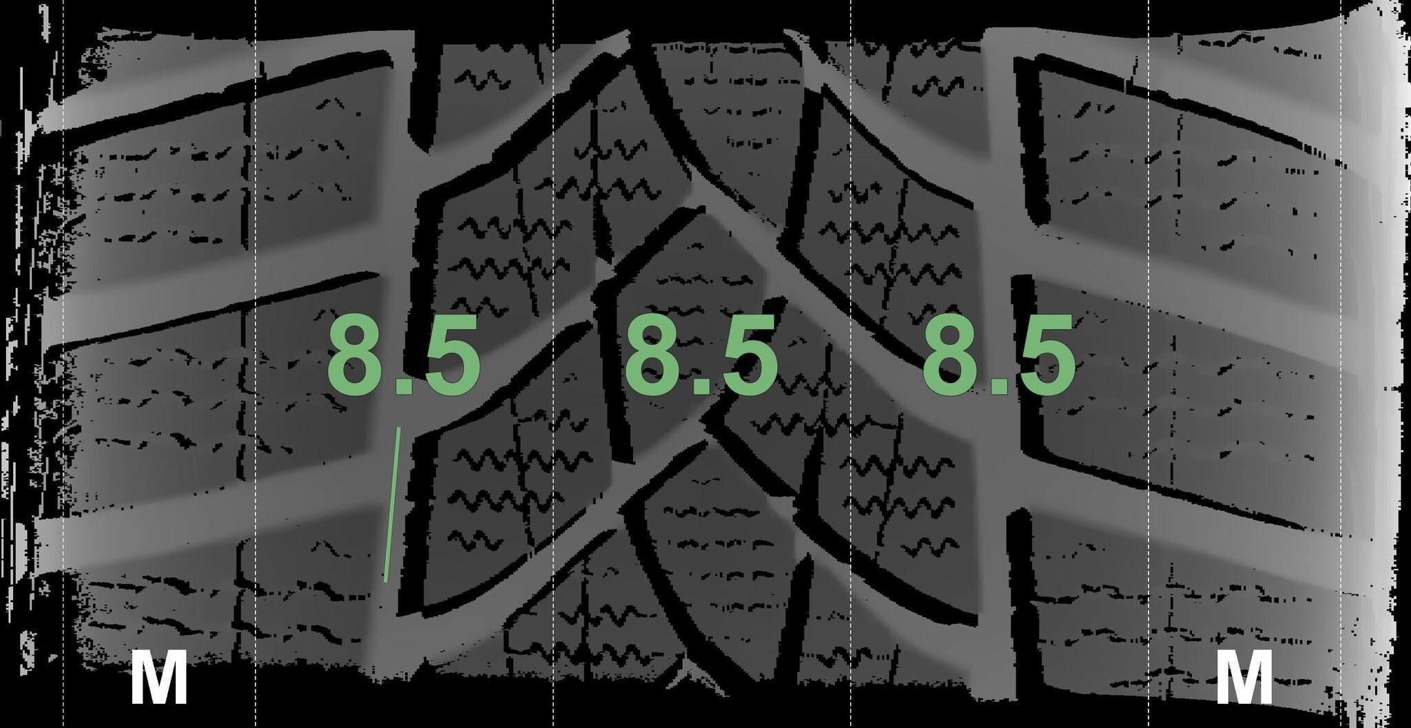 | Zustand | Profiltiefe | DOT | Hinterachse Rechts | Neu | 8,5 mm | 3322 |