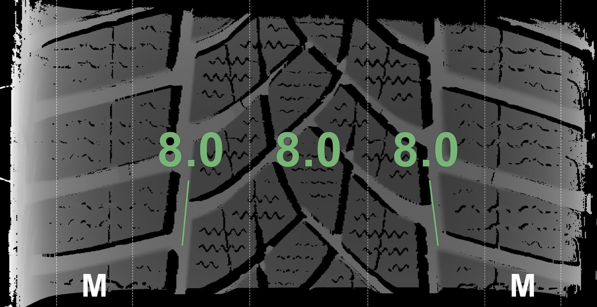 | Zustand | Profiltiefe | DOT | Hinterachse Links | Neu | 8,0 mm | 3322 |