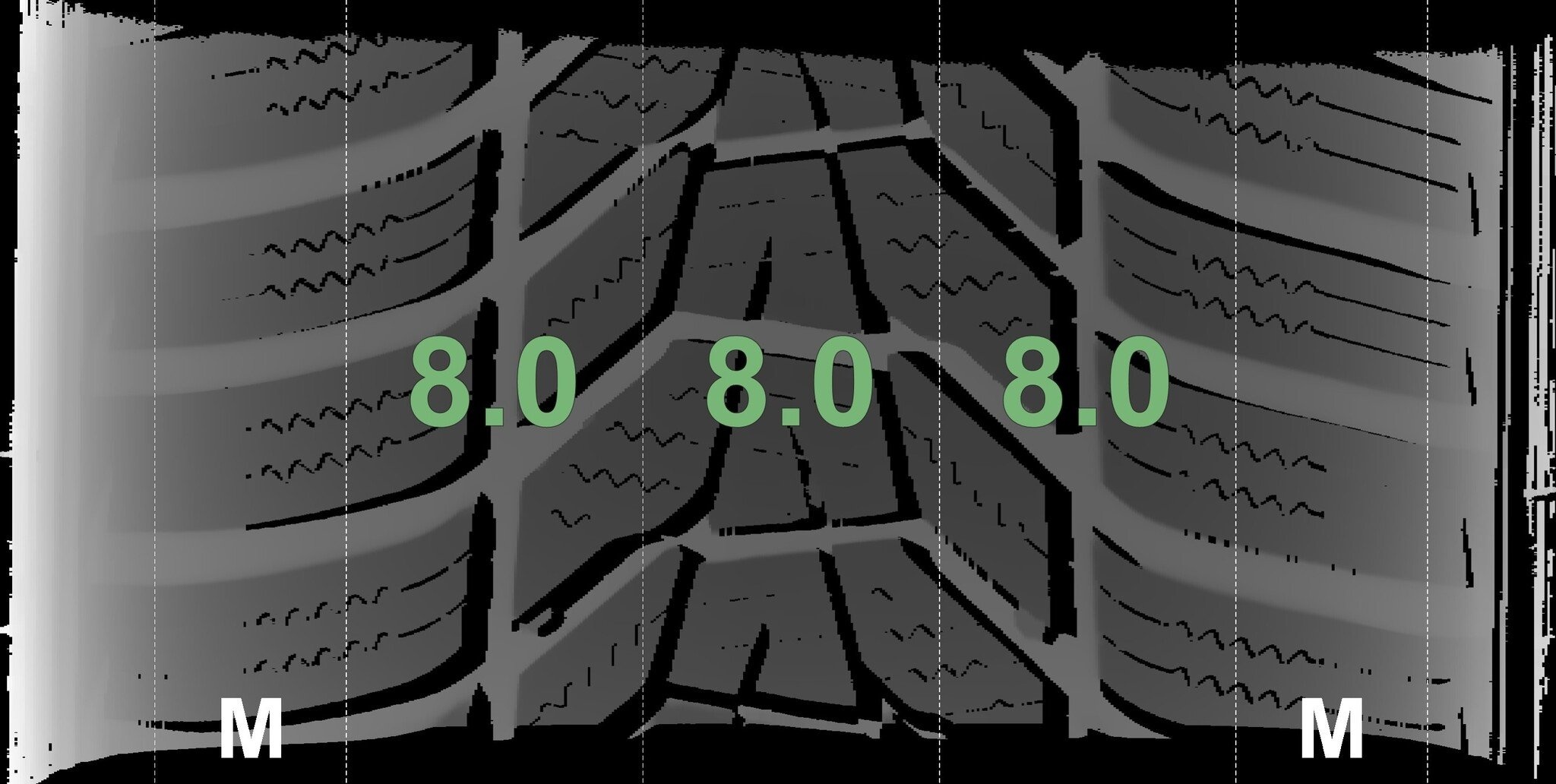 | Zustand | Profiltiefe | DOT | Hinterachse Links | Demo Noppen noch sichtbar | 8.0 mm | 3824 |