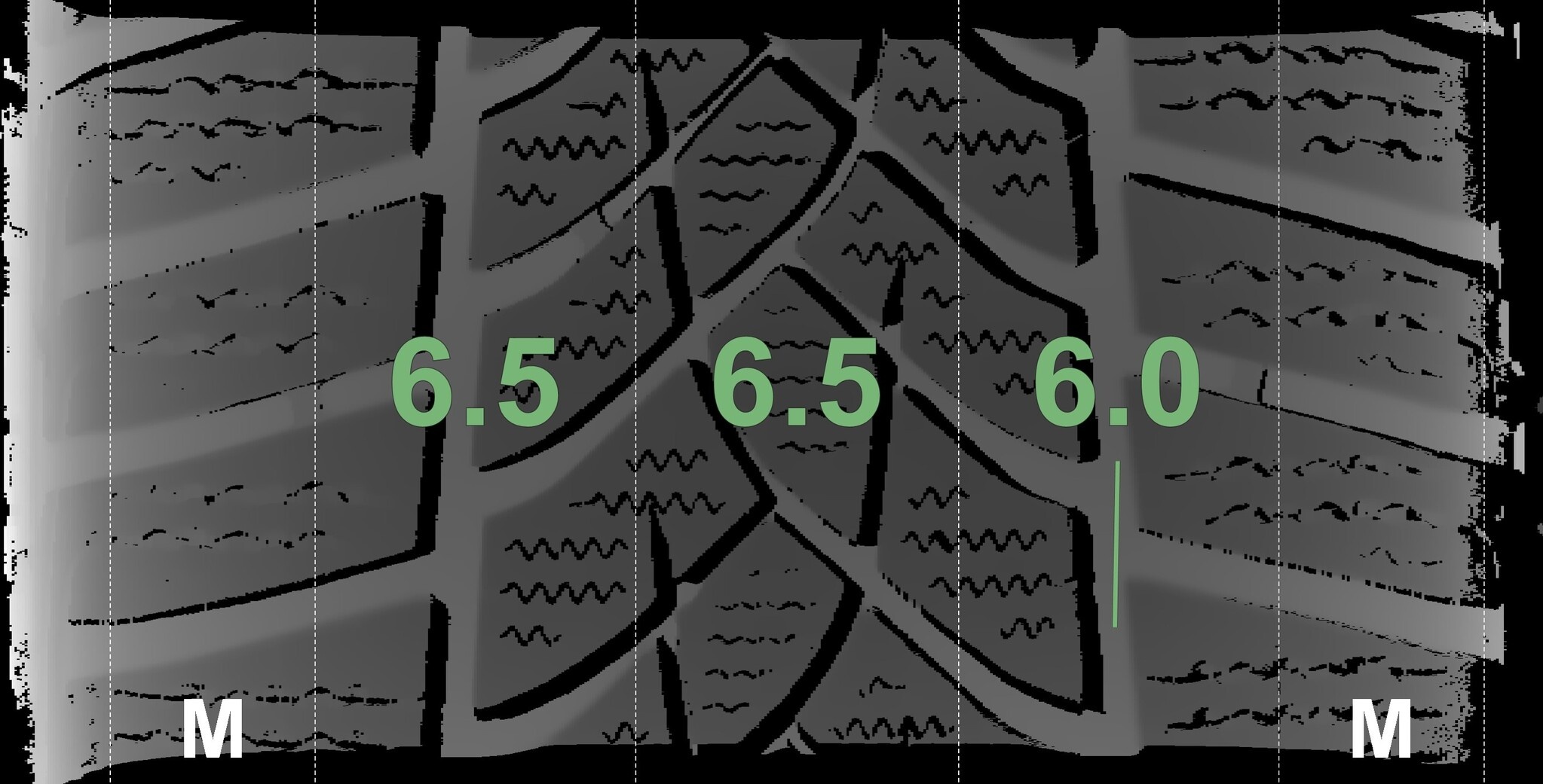 | Zustand | Profiltiefe | DOT | Vorderachse Links | Gebraucht | 6,0 mm | 0222 |