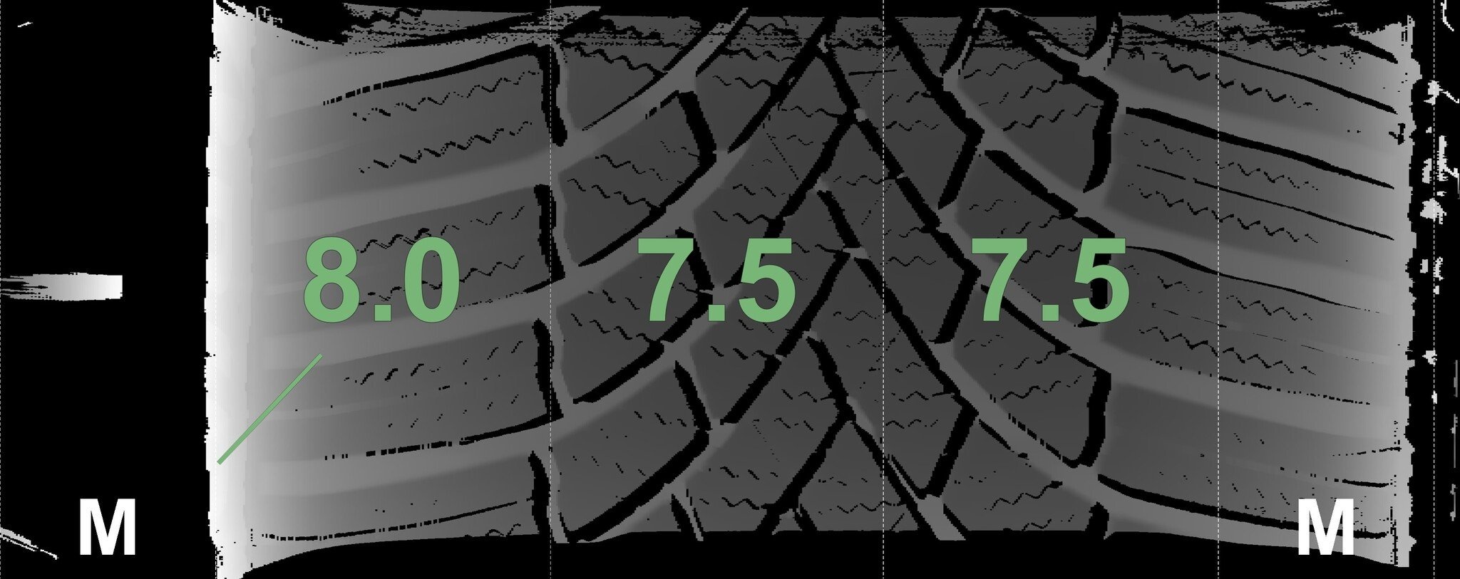 | Zustand | Profiltiefe | DOT | Vorderachse Links | Gebraucht | 7,5 mm | 2821 |