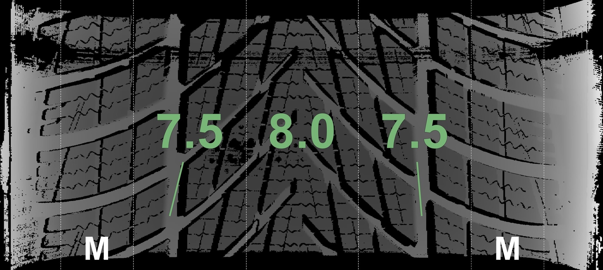 Zustand | Profiltiefe | DOT | Hinterachse Rechts | Neu | 7,5 mm | 5024 |