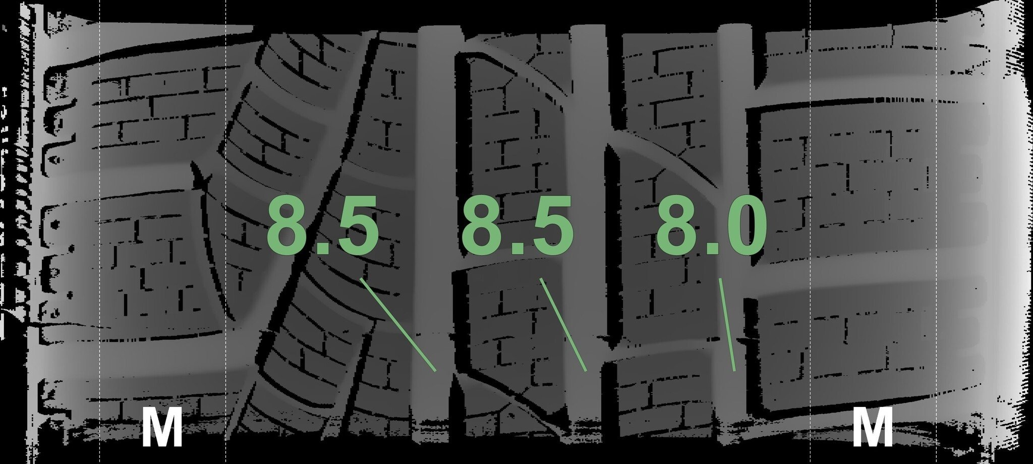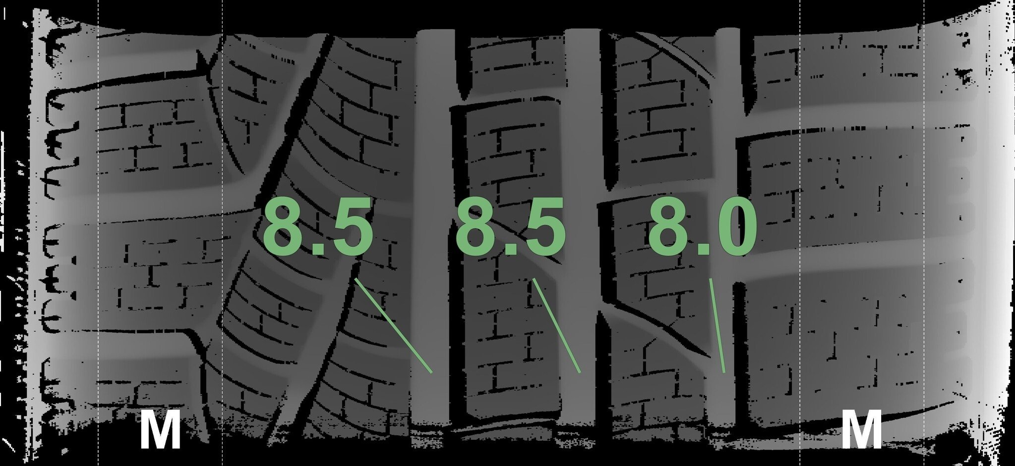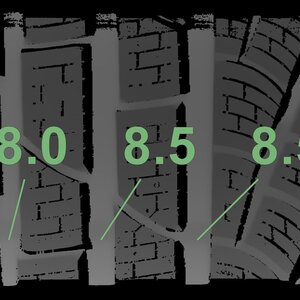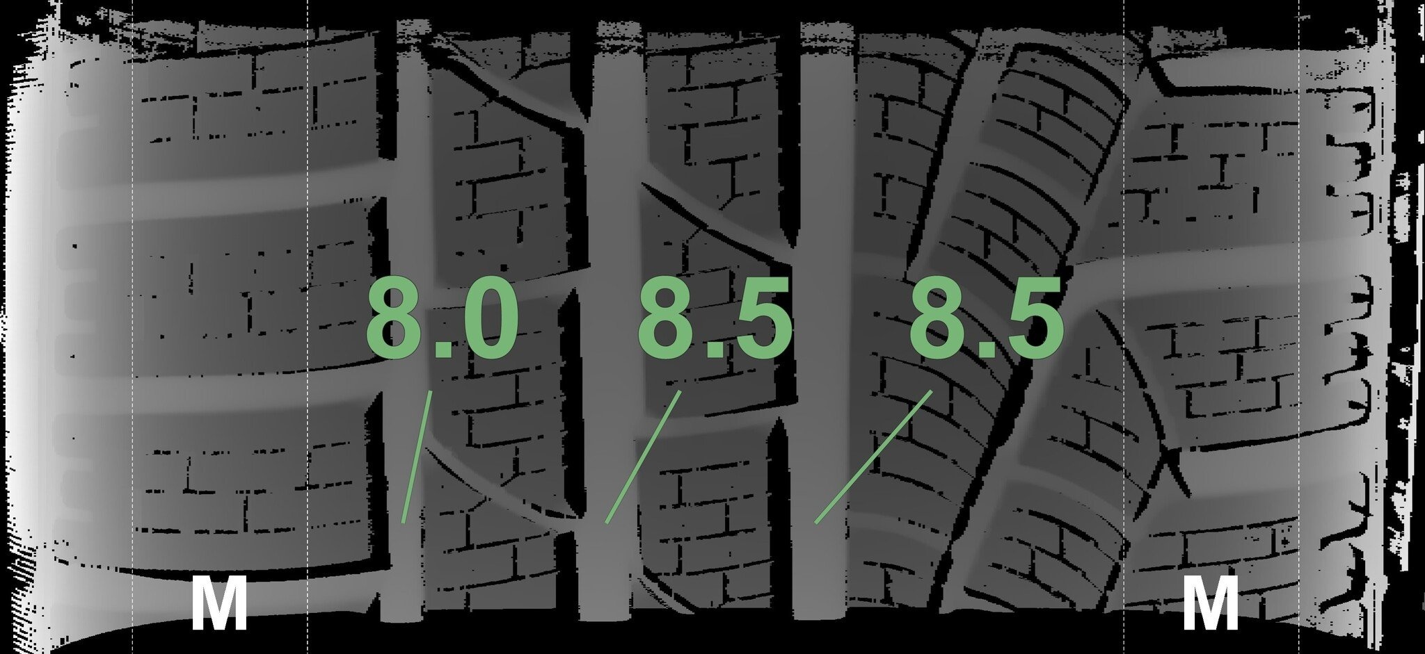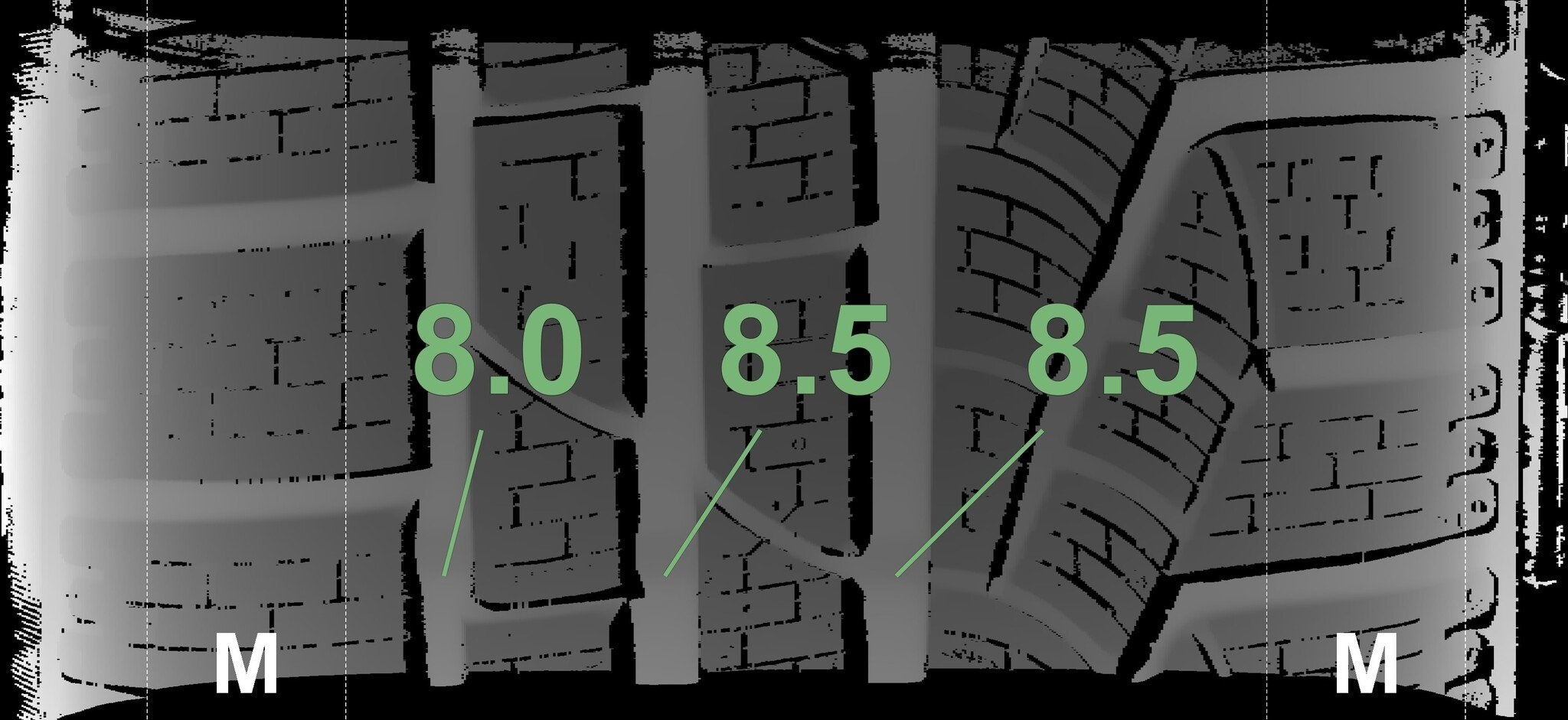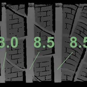 Die gemessenen Profiltiefen und die Details der Felgen sind oben dargestellt.