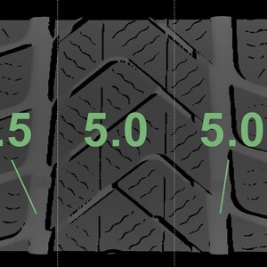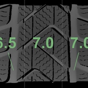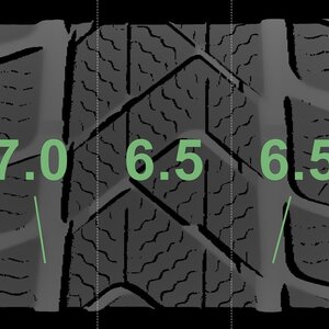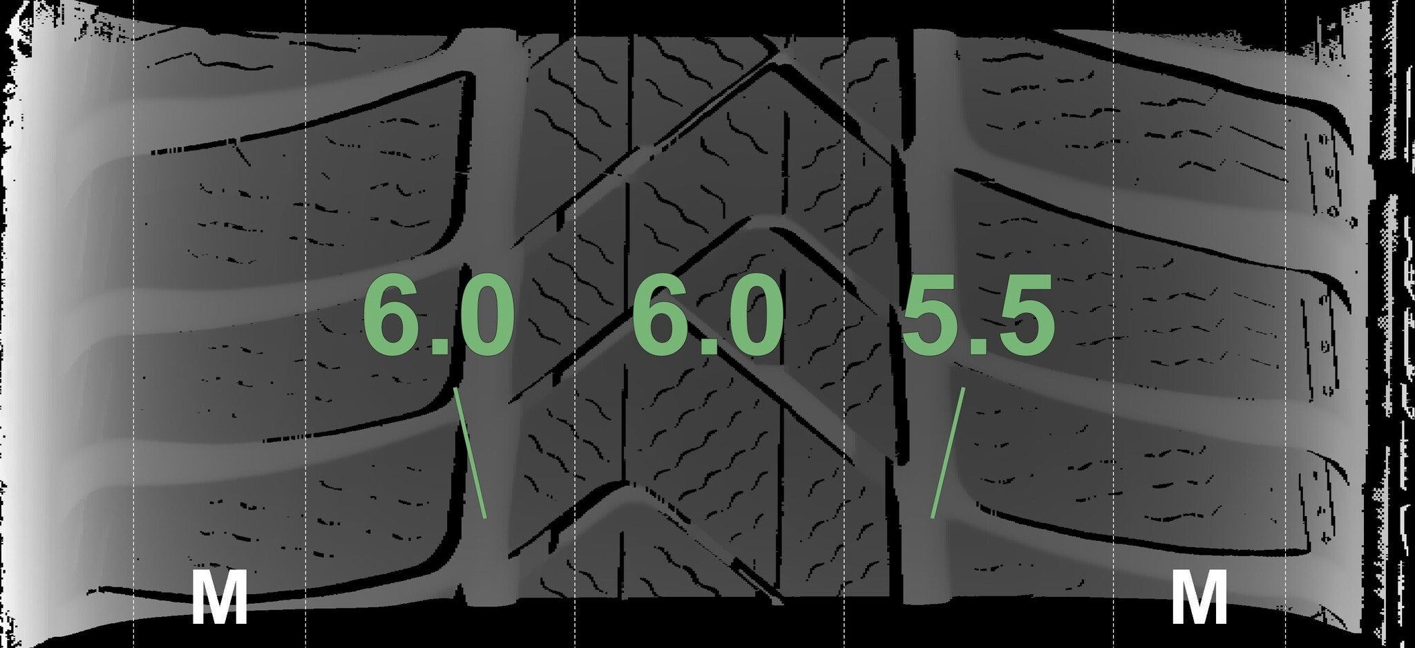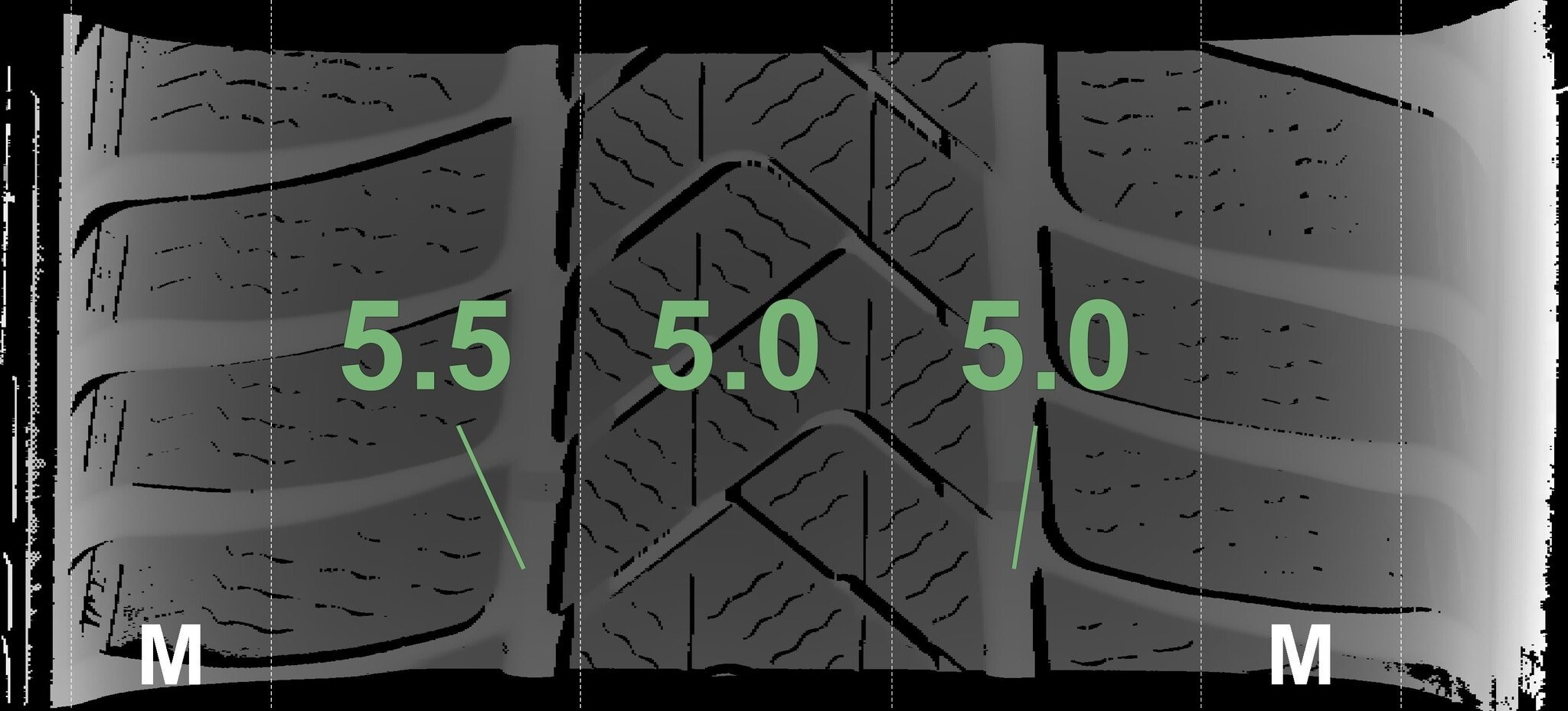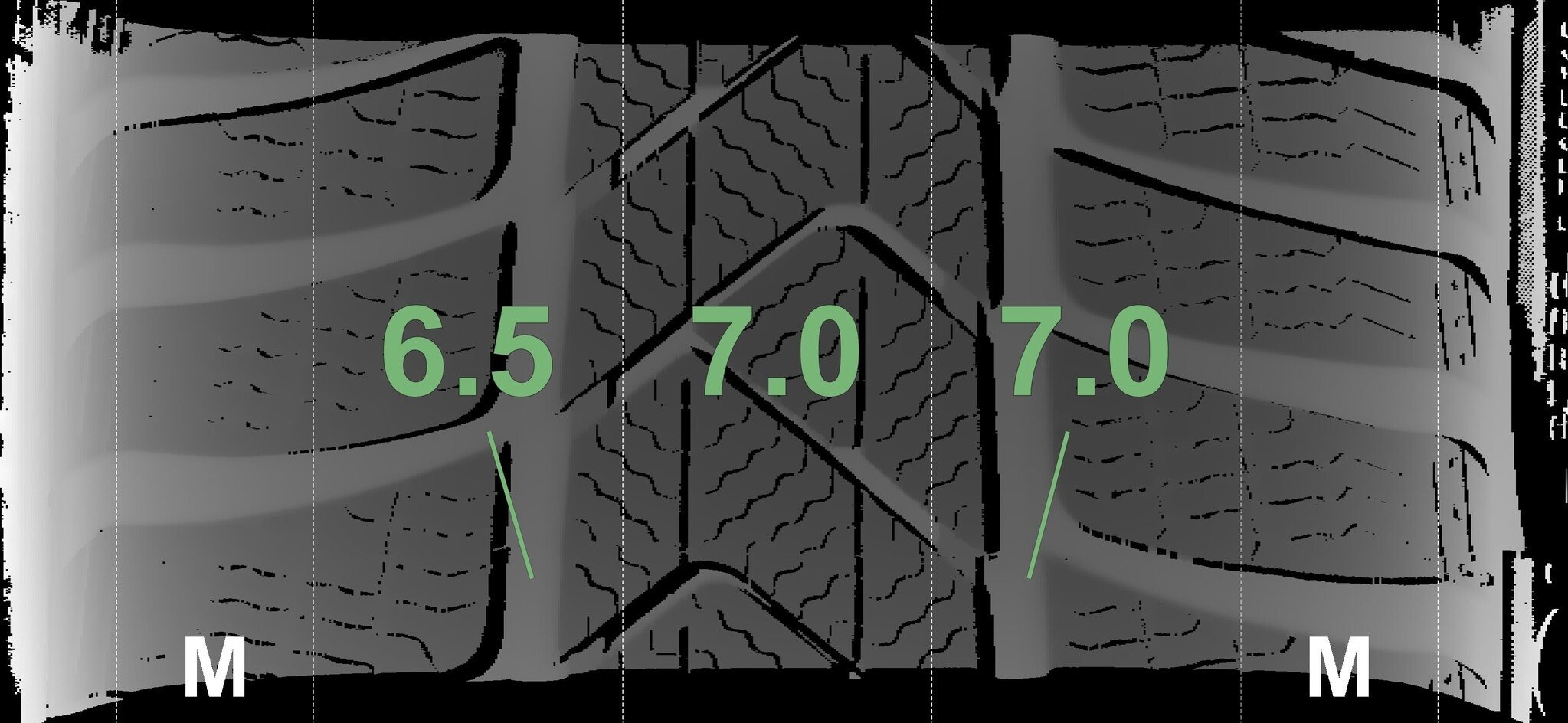 Die gemessenen Profiltiefen und die Details der Felgen sind oben dargestellt.
