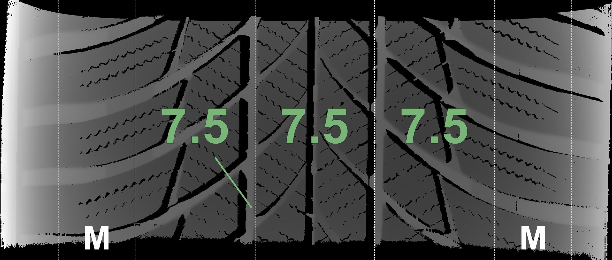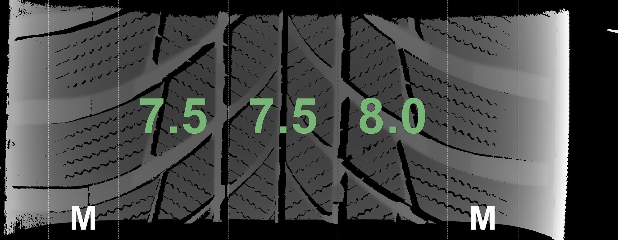 | Zustand | Profiltiefe | DOT | Hinterachse Links | Gebraucht | 7.5 mm | 2424 |