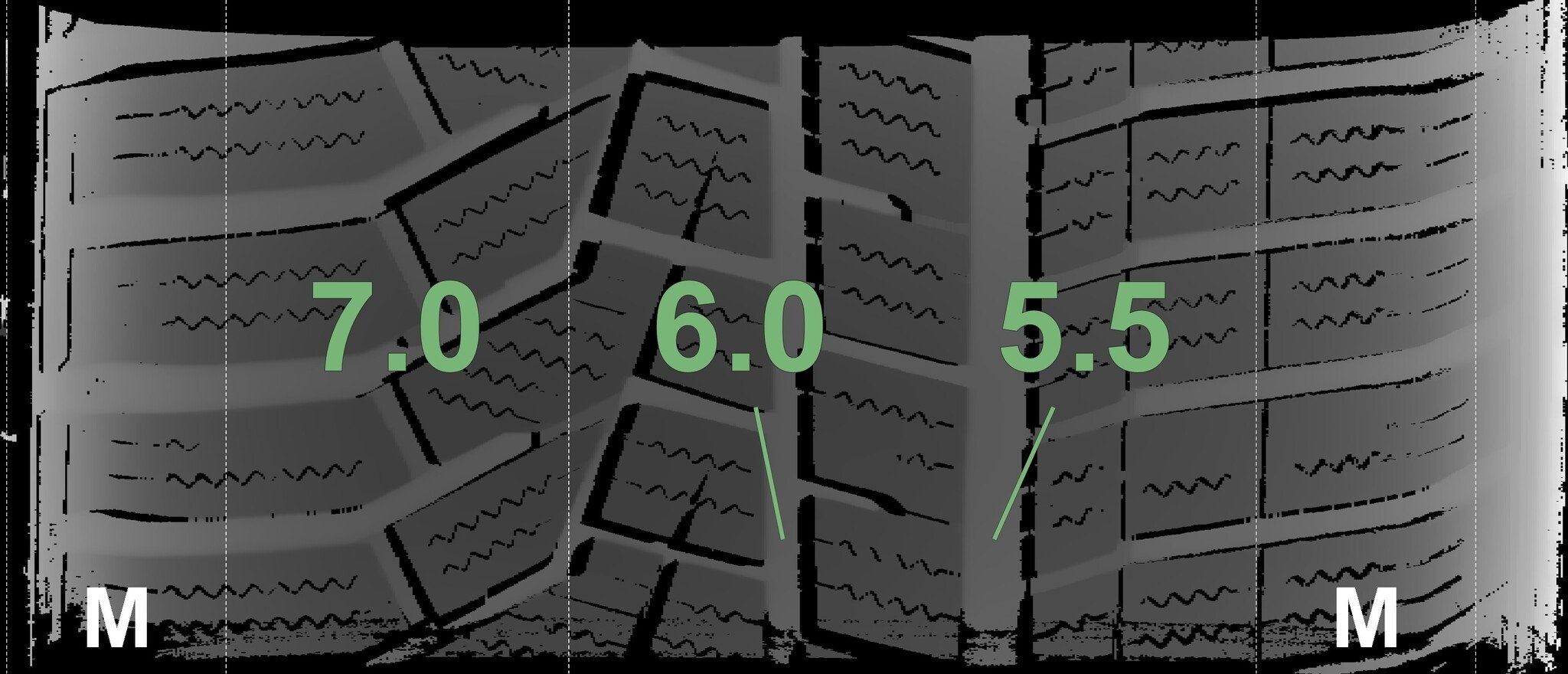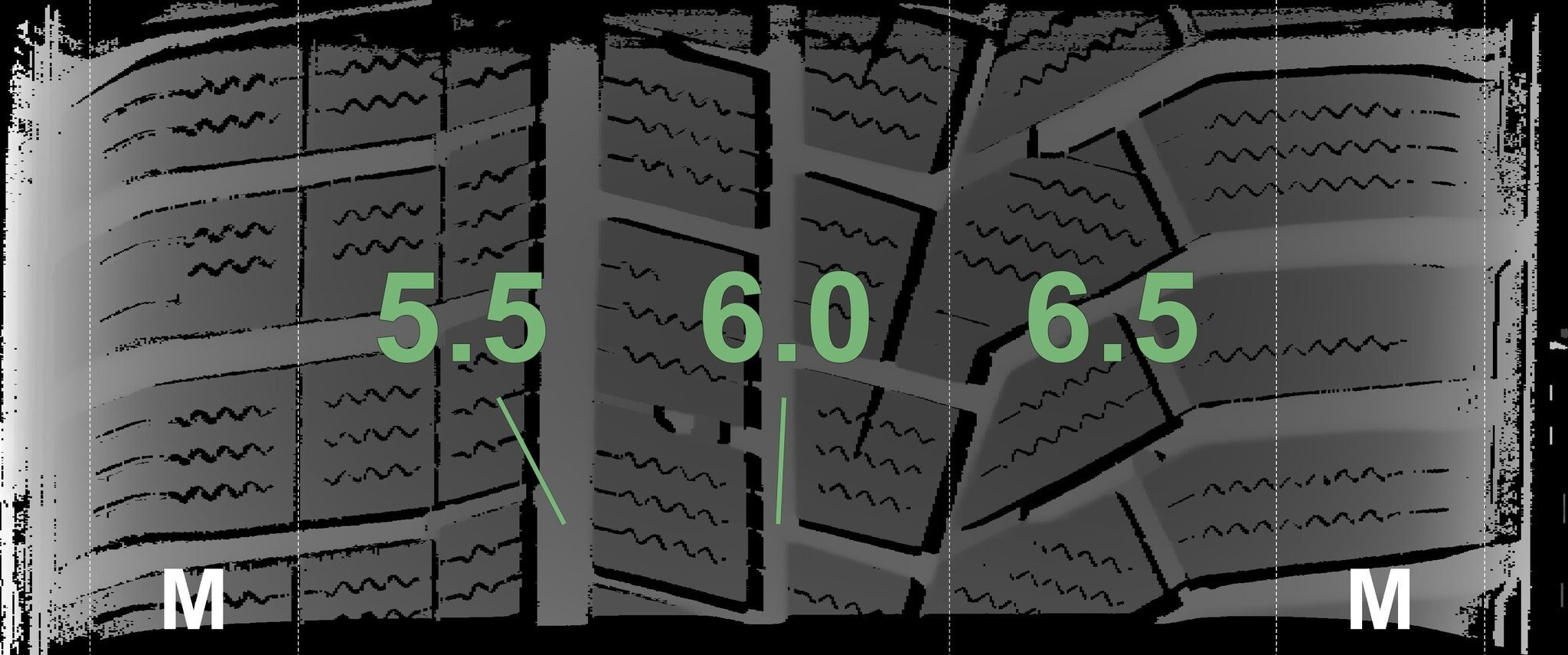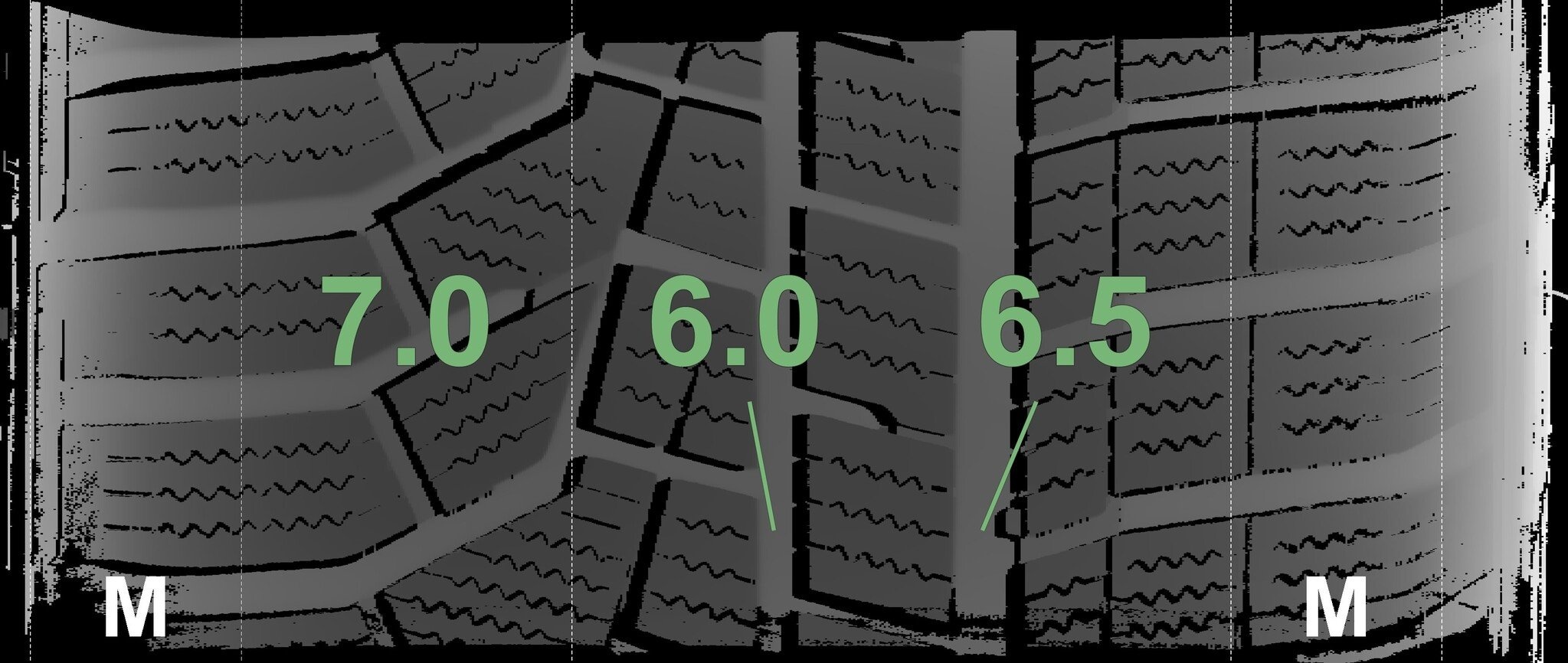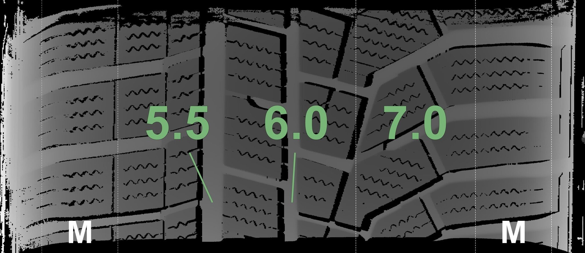 Die gemessenen Profiltiefen und die Details der Felgen sind oben dargestellt.