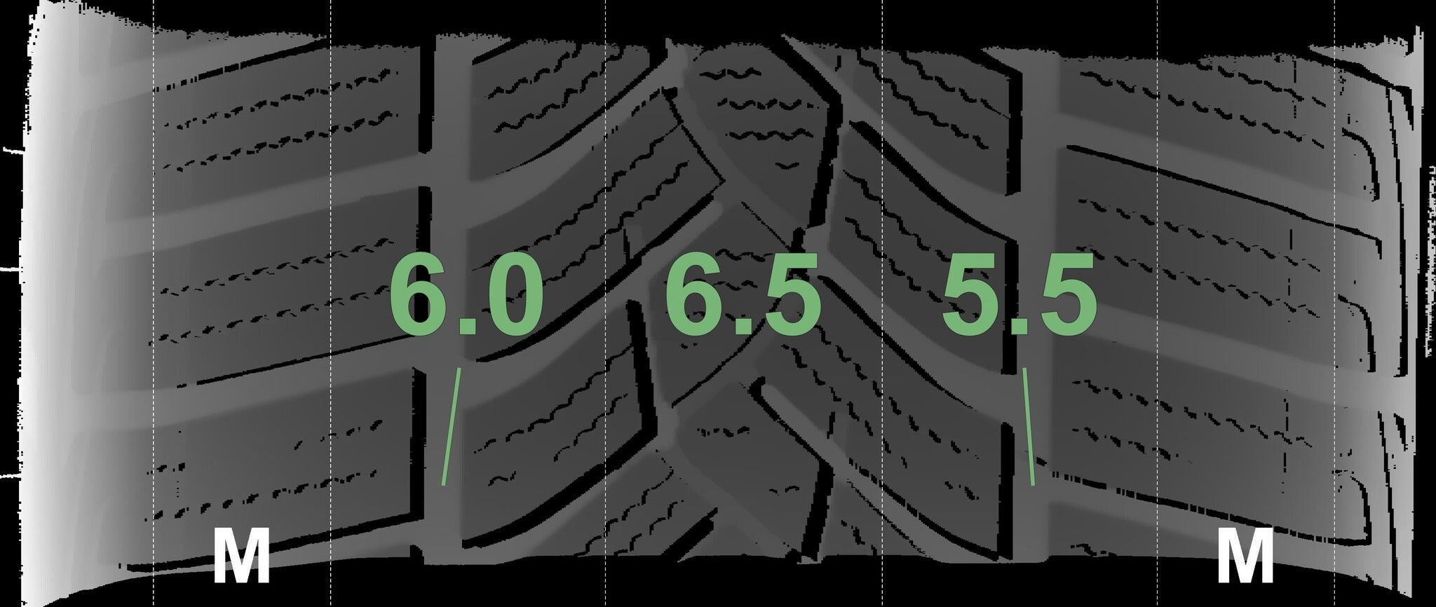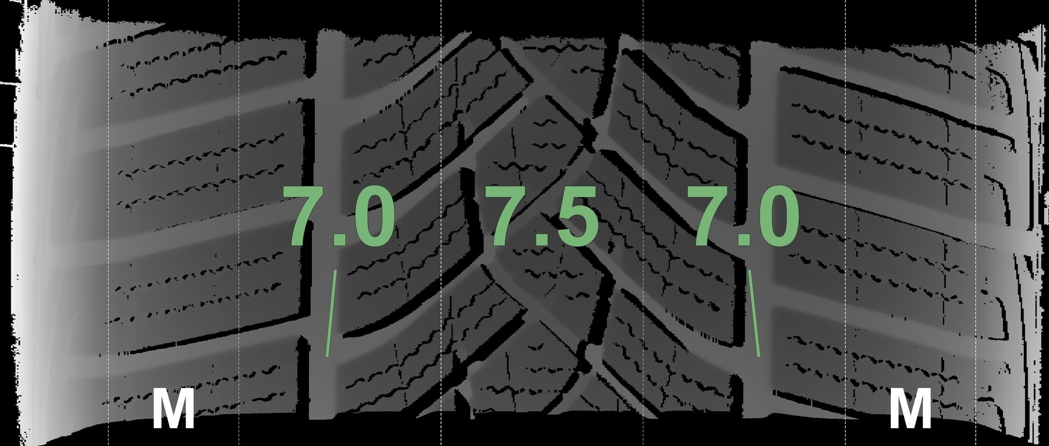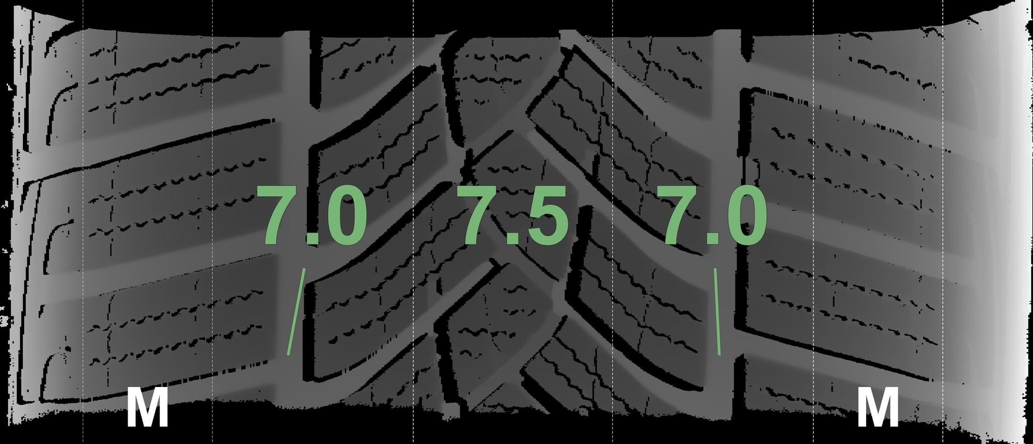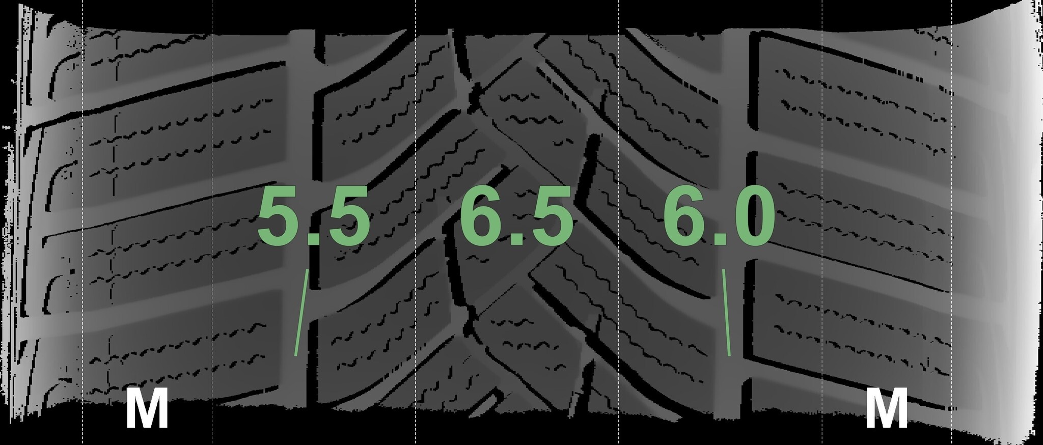 Die gemessenen Profiltiefen und die Details der Felgen sind oben dargestellt.