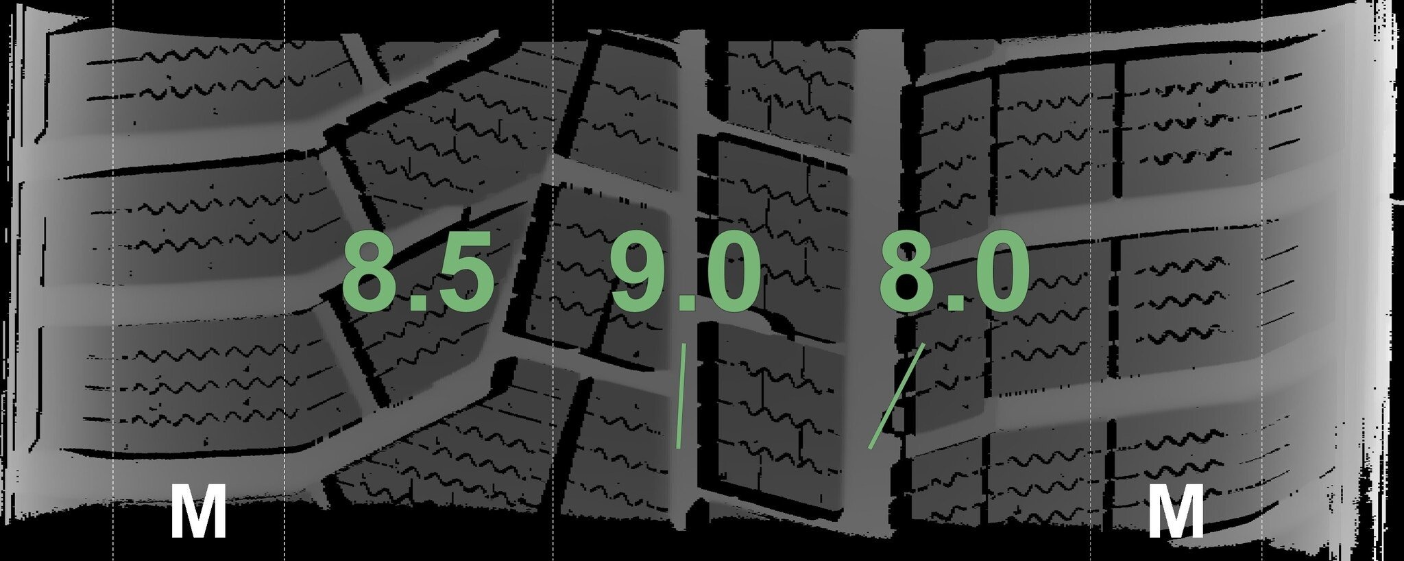 | Zustand | Profiltiefe | DOT | Hinterachse Rechts | Neu | 8.5 mm | 4625 |