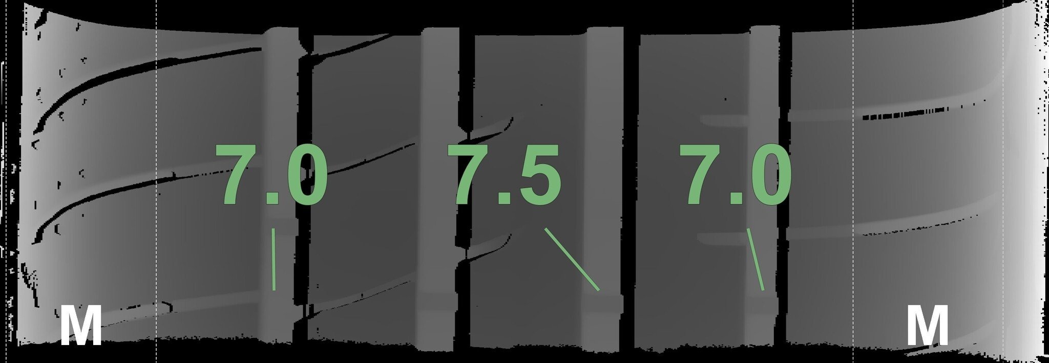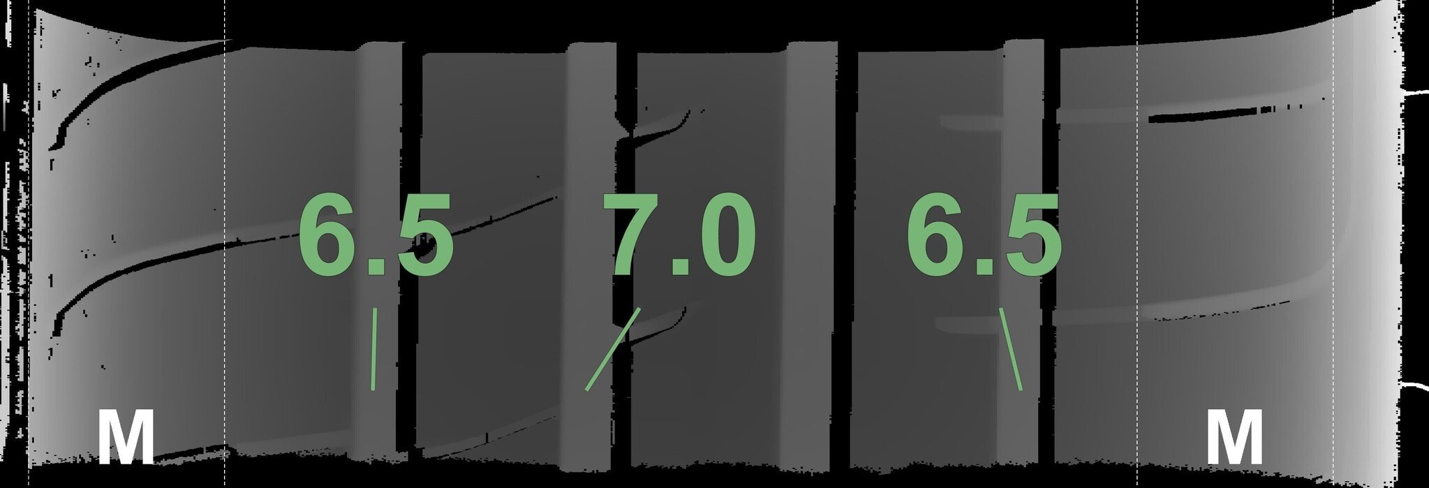 | Zustand | Profiltiefe | DOT | Vorderachse Links | Neu | 6.7 mm | 0121 |