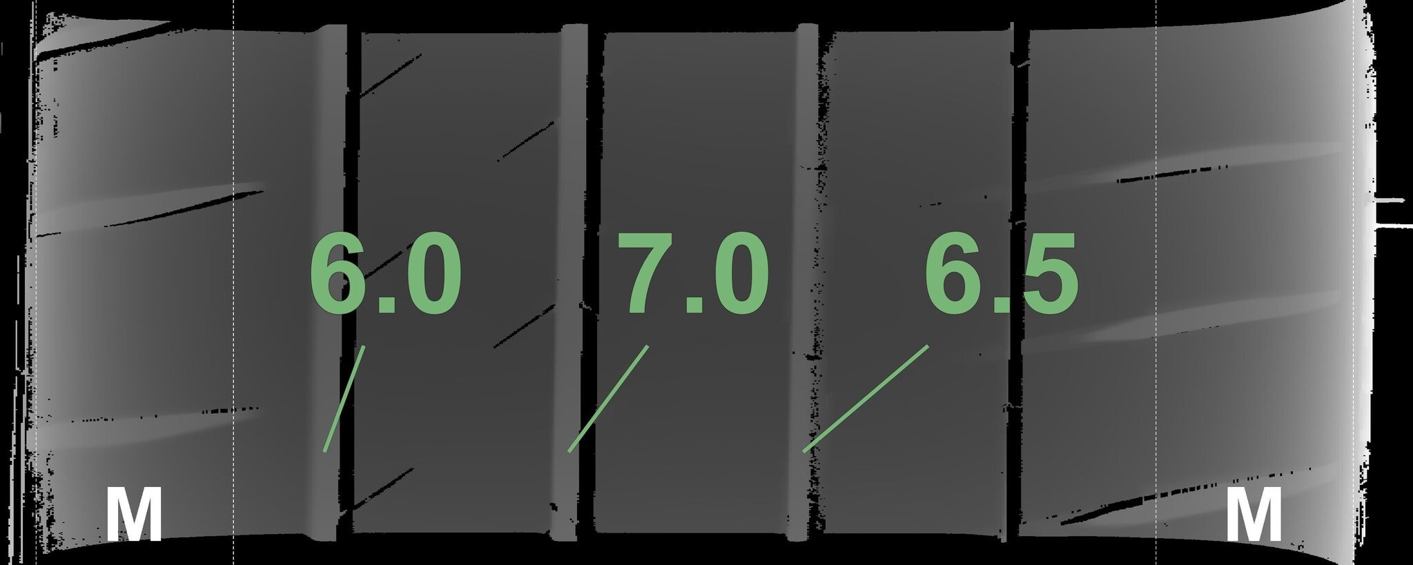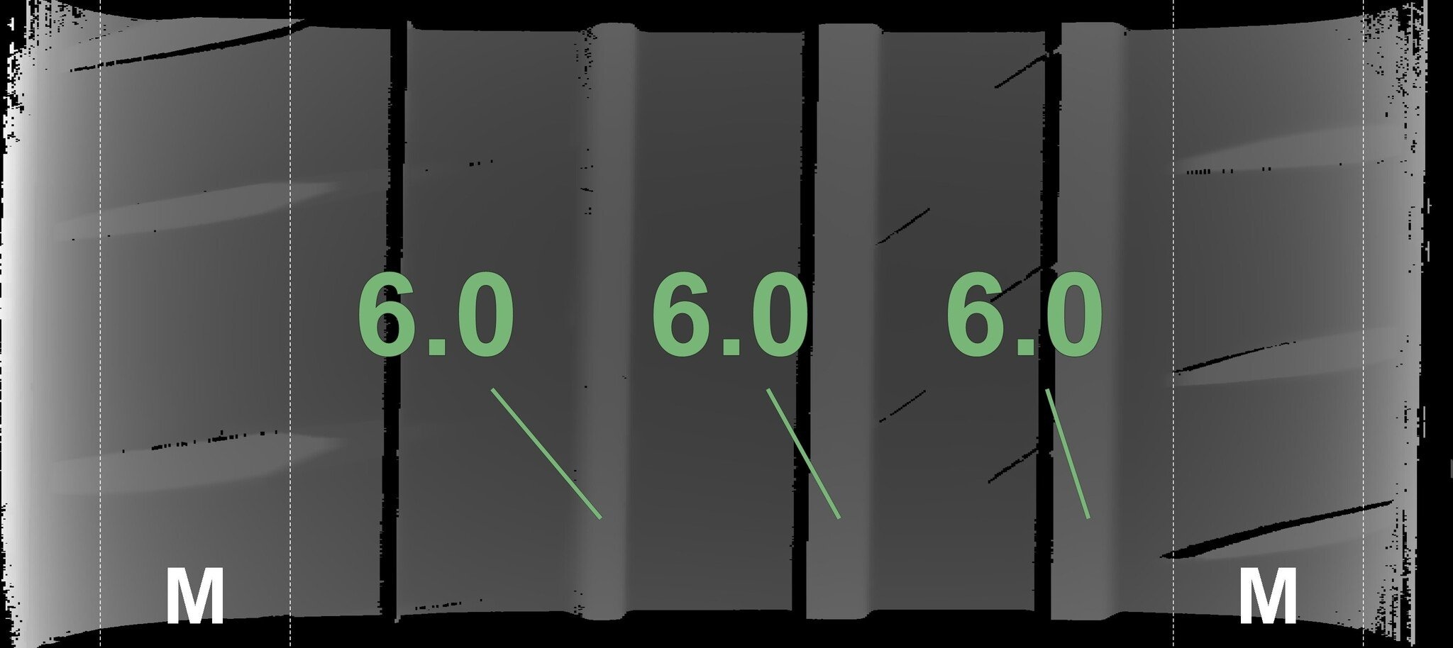 Die gemessenen Profiltiefen und die Details der Felgen sind oben dargestellt.