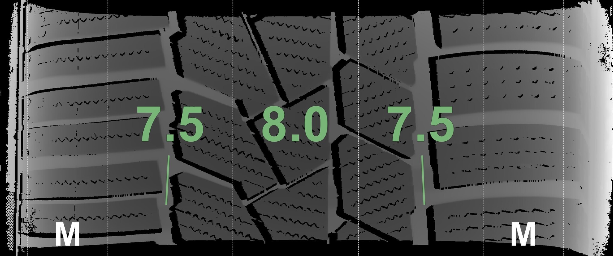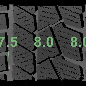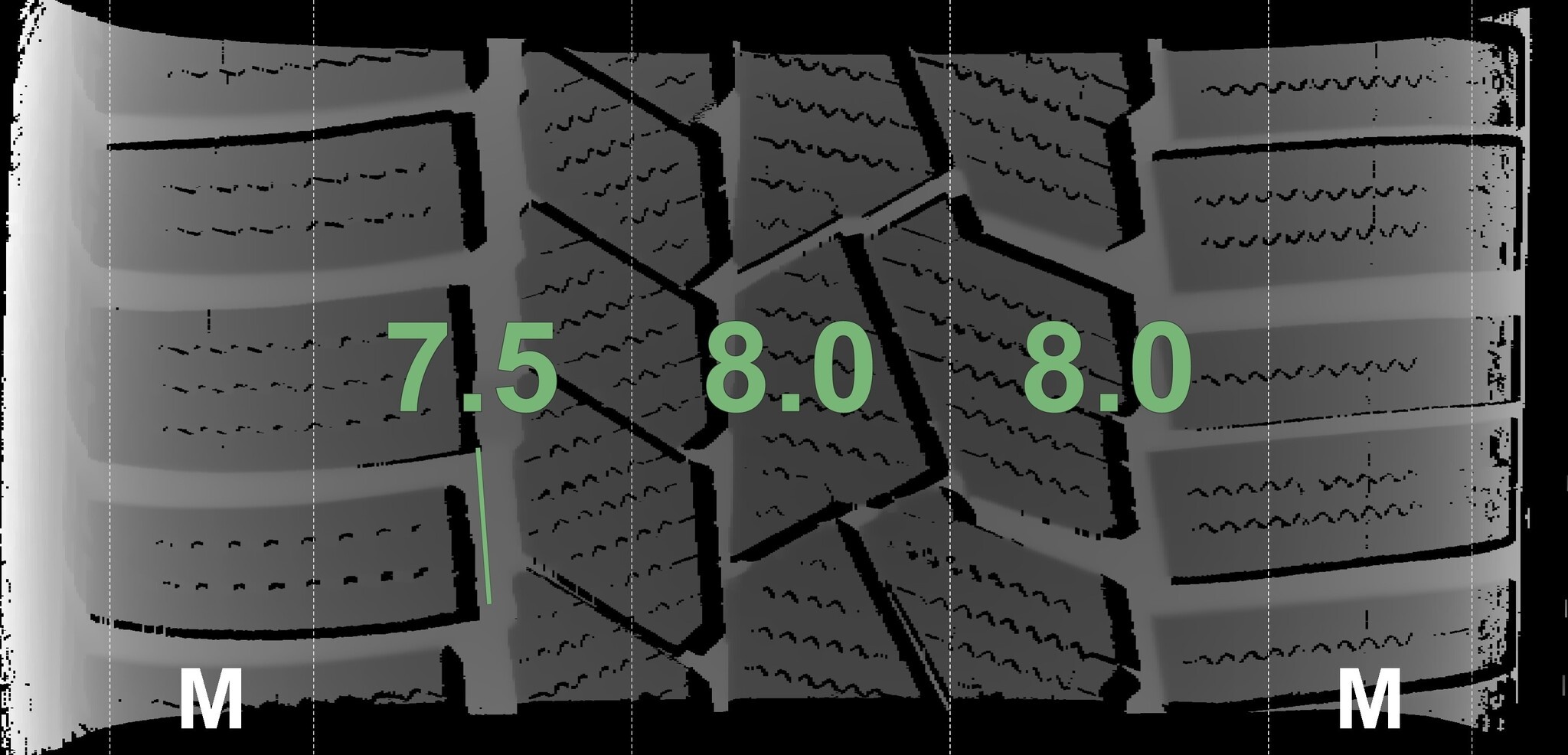 Die gemessenen Profiltiefen und die Details der Felgen sind oben dargestellt.