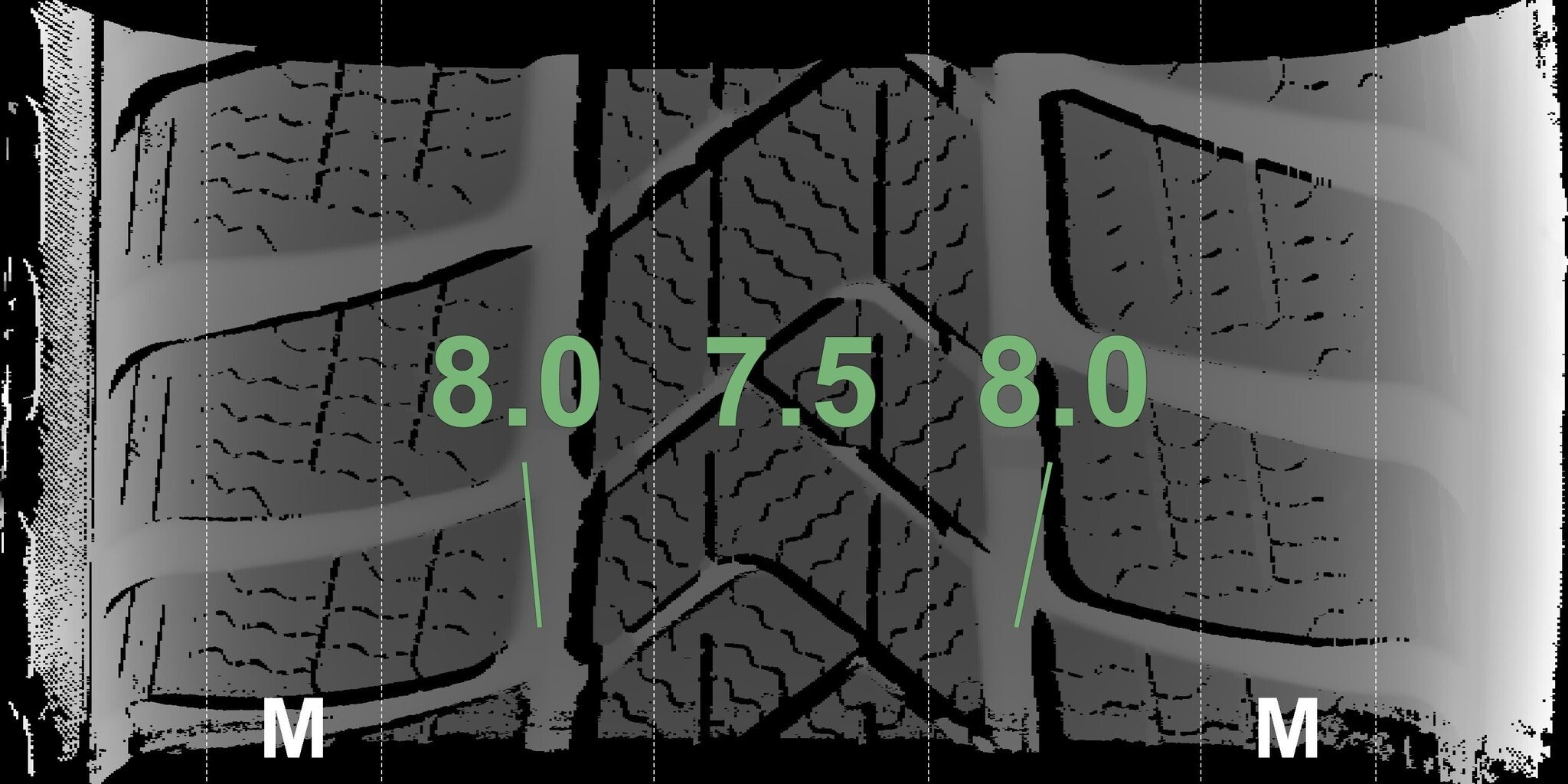 | Zustand | Profiltiefe | DOT | Hinterachse Rechts | Demo Noppen noch sichtbar | 7.8 mm | 3322 |