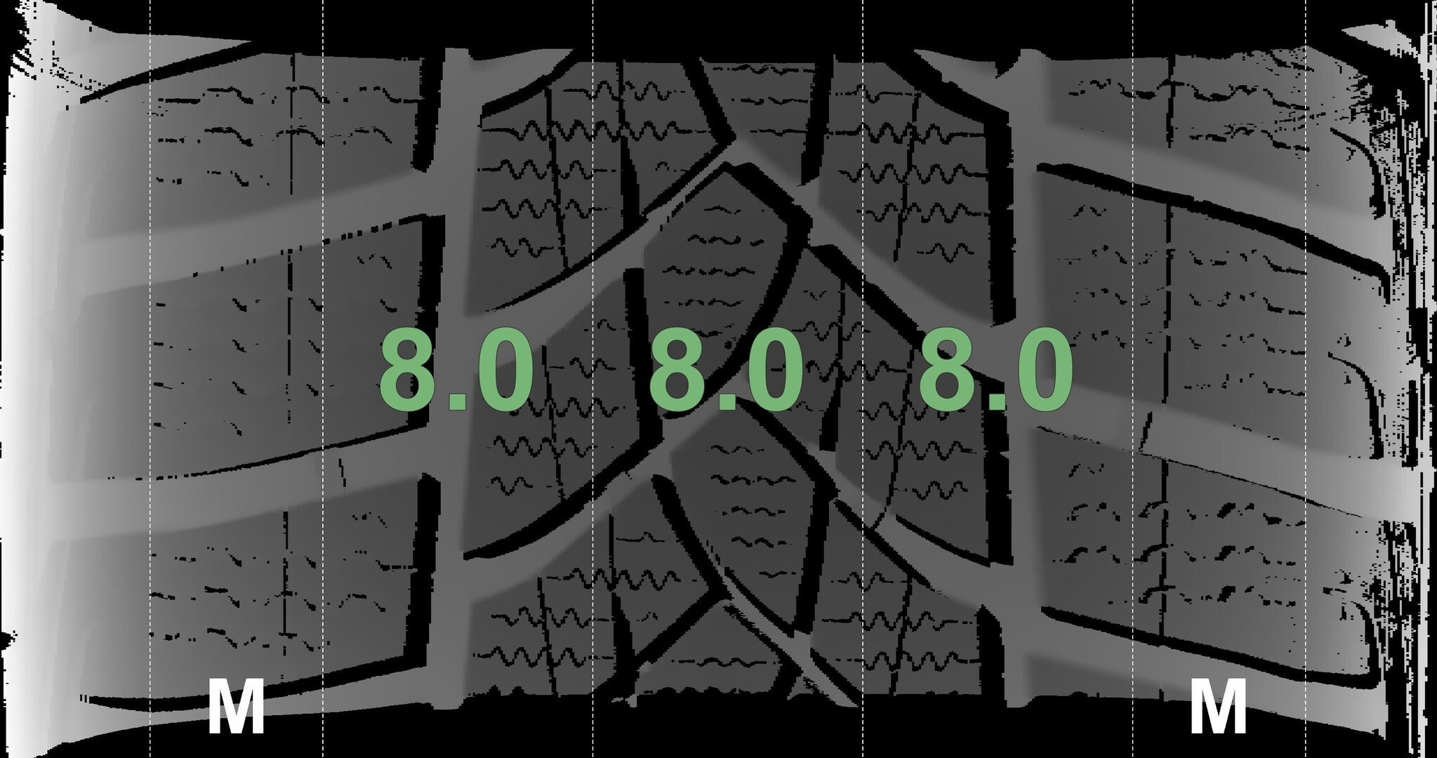 Zustand | Profiltiefe | DOT | Vorderachse Links | Gebraucht | 8,0 mm | 3519 |