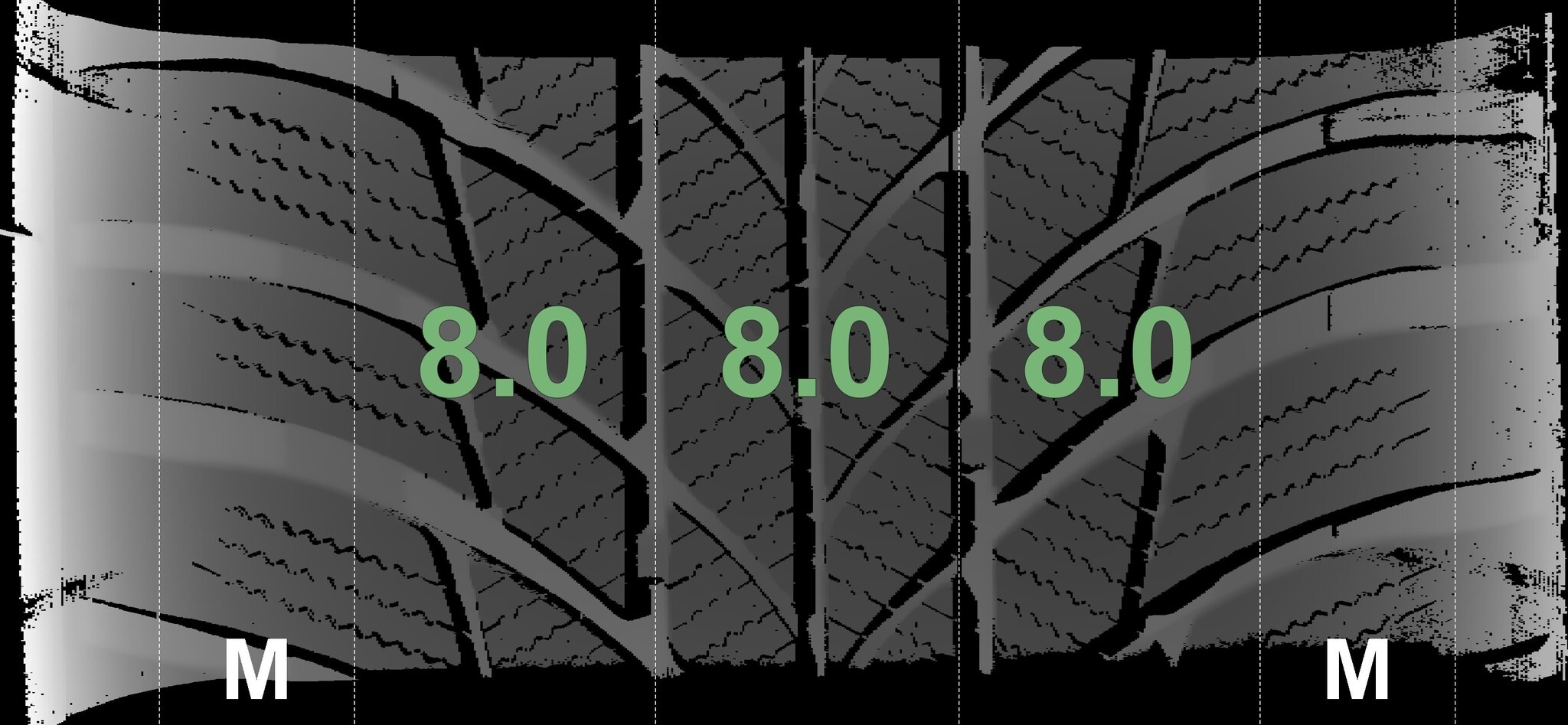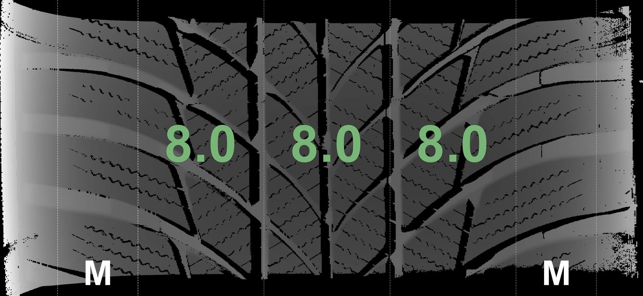 Zustand | Profiltiefe | DOT | Hinterachse Rechts | Neu | 8,0 mm | 2524 |