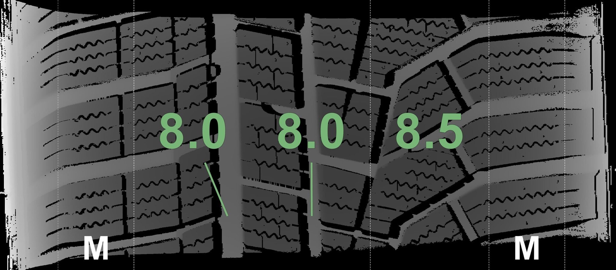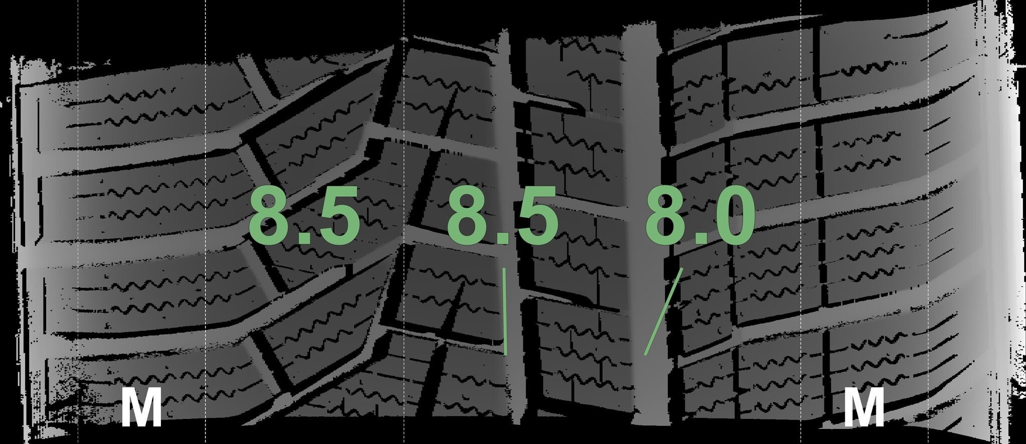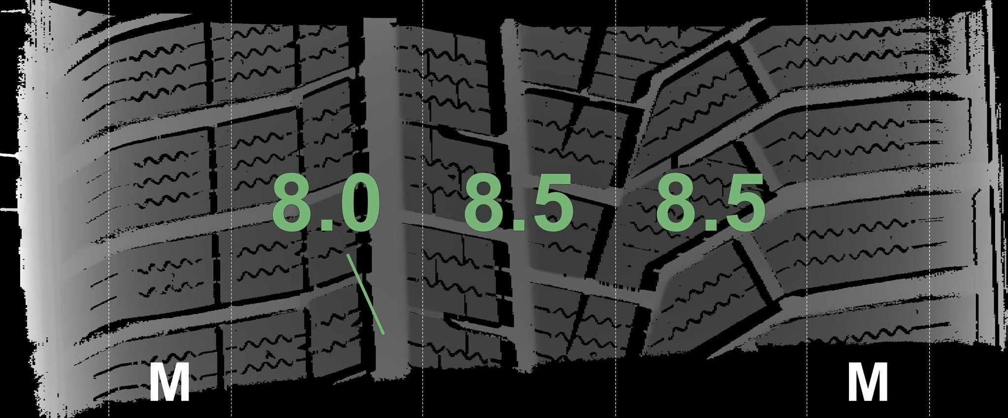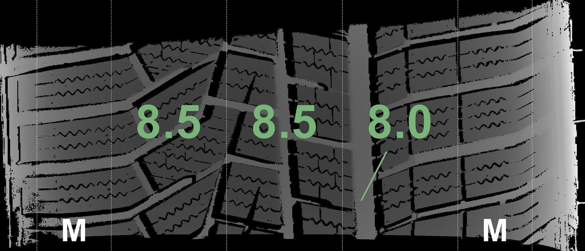 | Zustand | Profiltiefe | DOT | Vorderachse Links | Neu | 8,0 mm | 2225 |