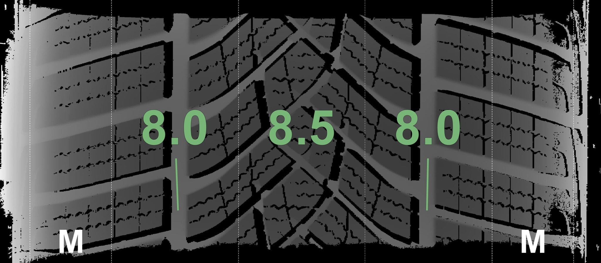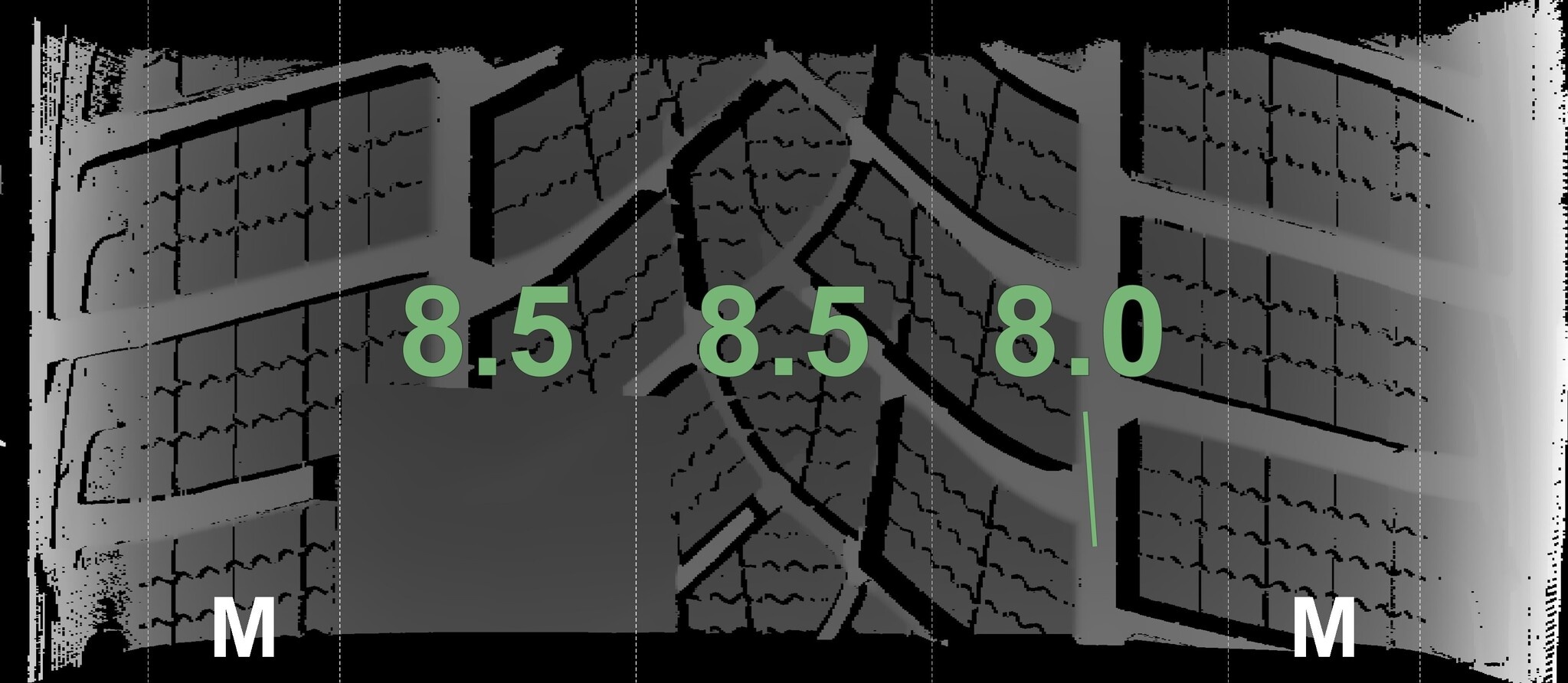 Zustand | Profiltiefe | DOT | Hinterachse Rechts | Neu | 8,0 mm | 2823 |