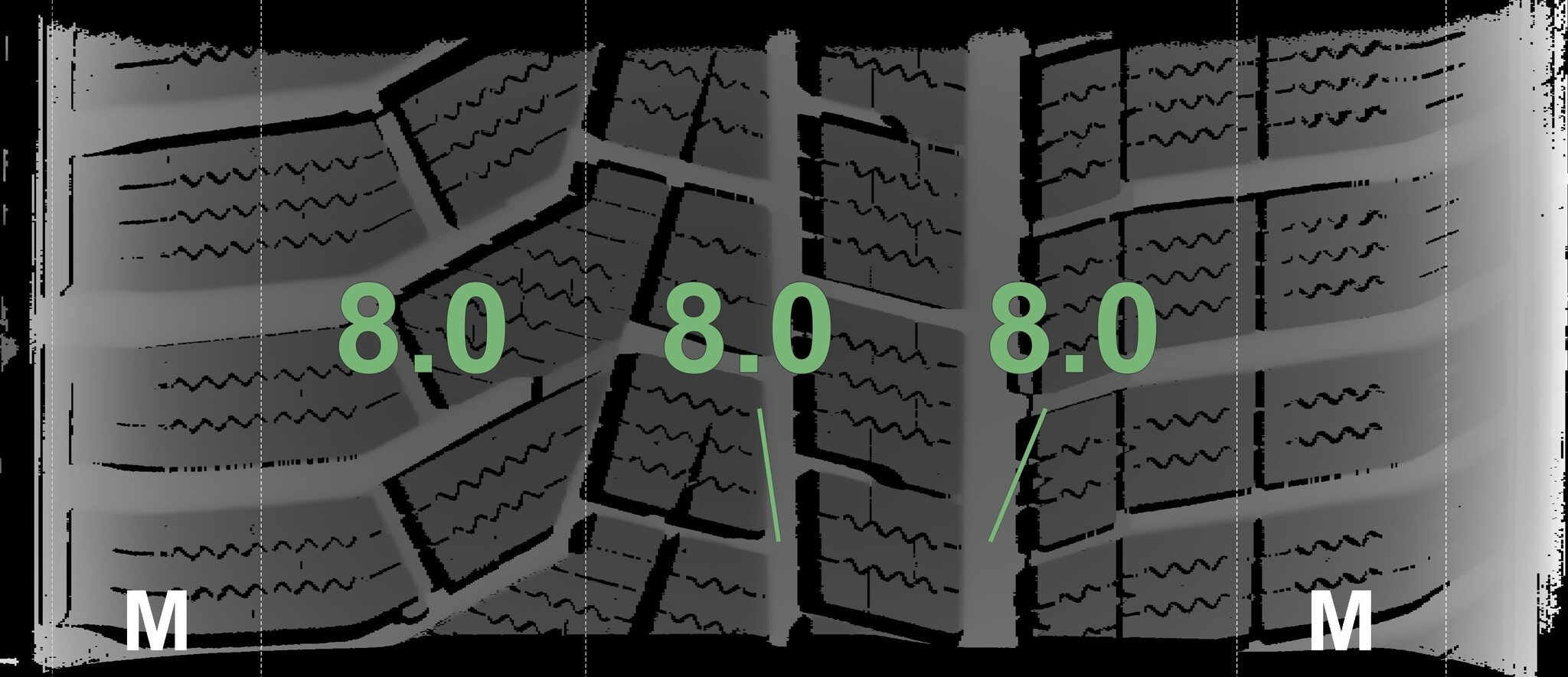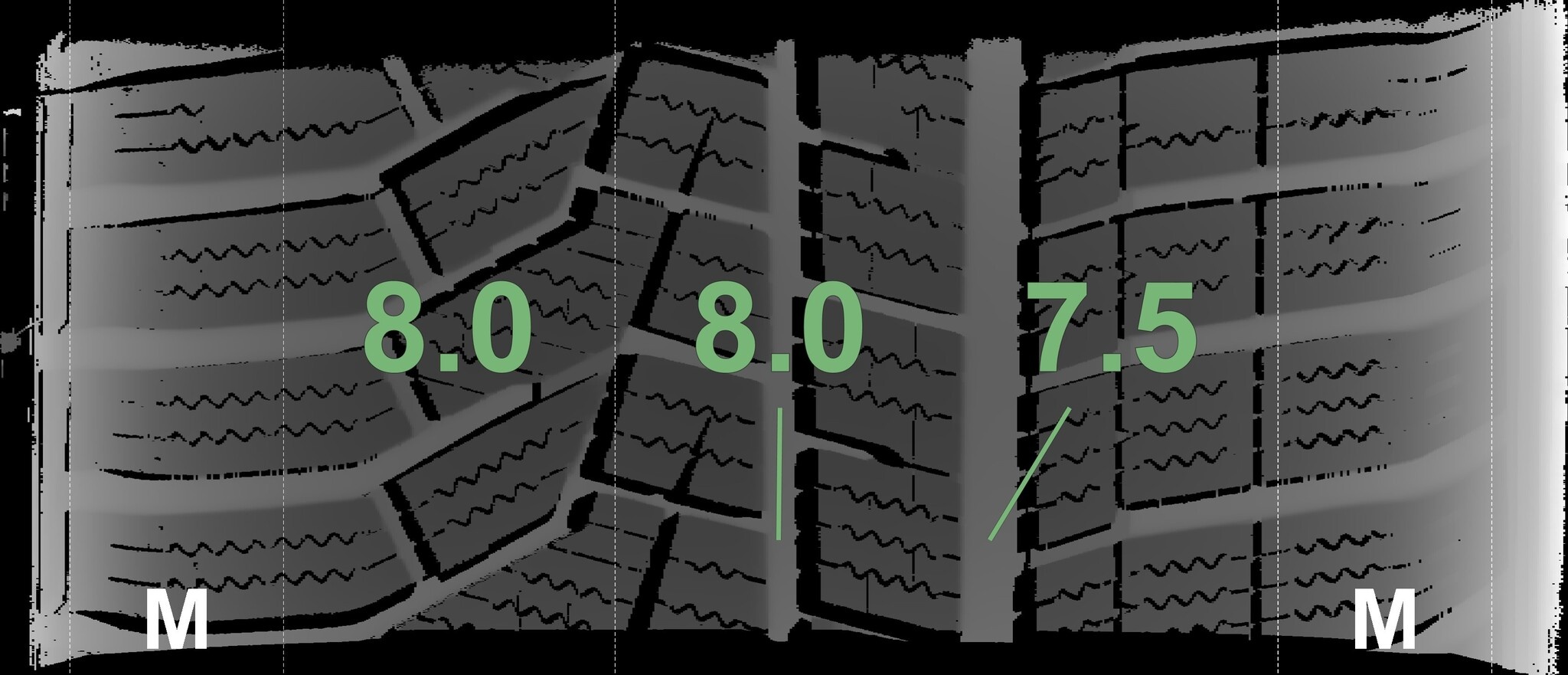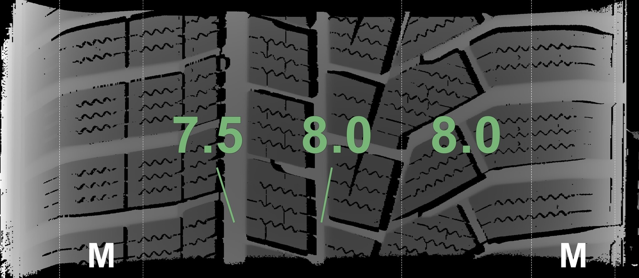 Zustand | Profiltiefe | DOT | Vorderachse Rechts | Demo-Noppen noch sichtbar | 7,5 mm | 4224 |