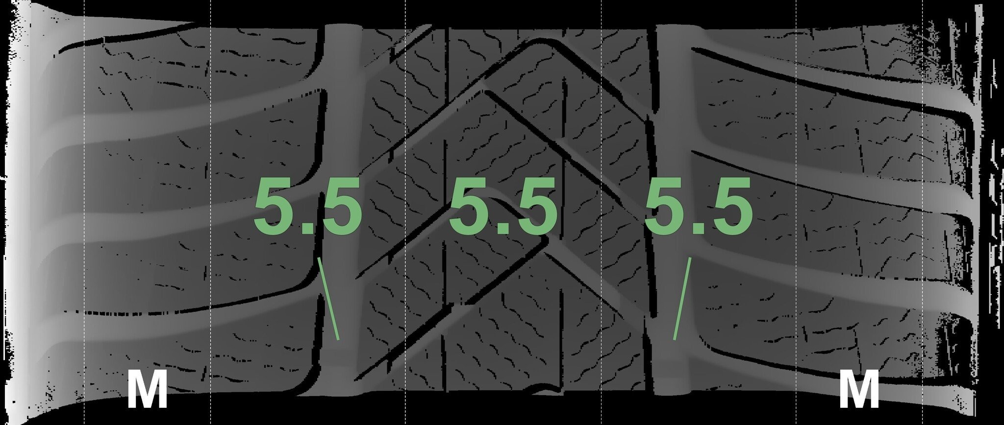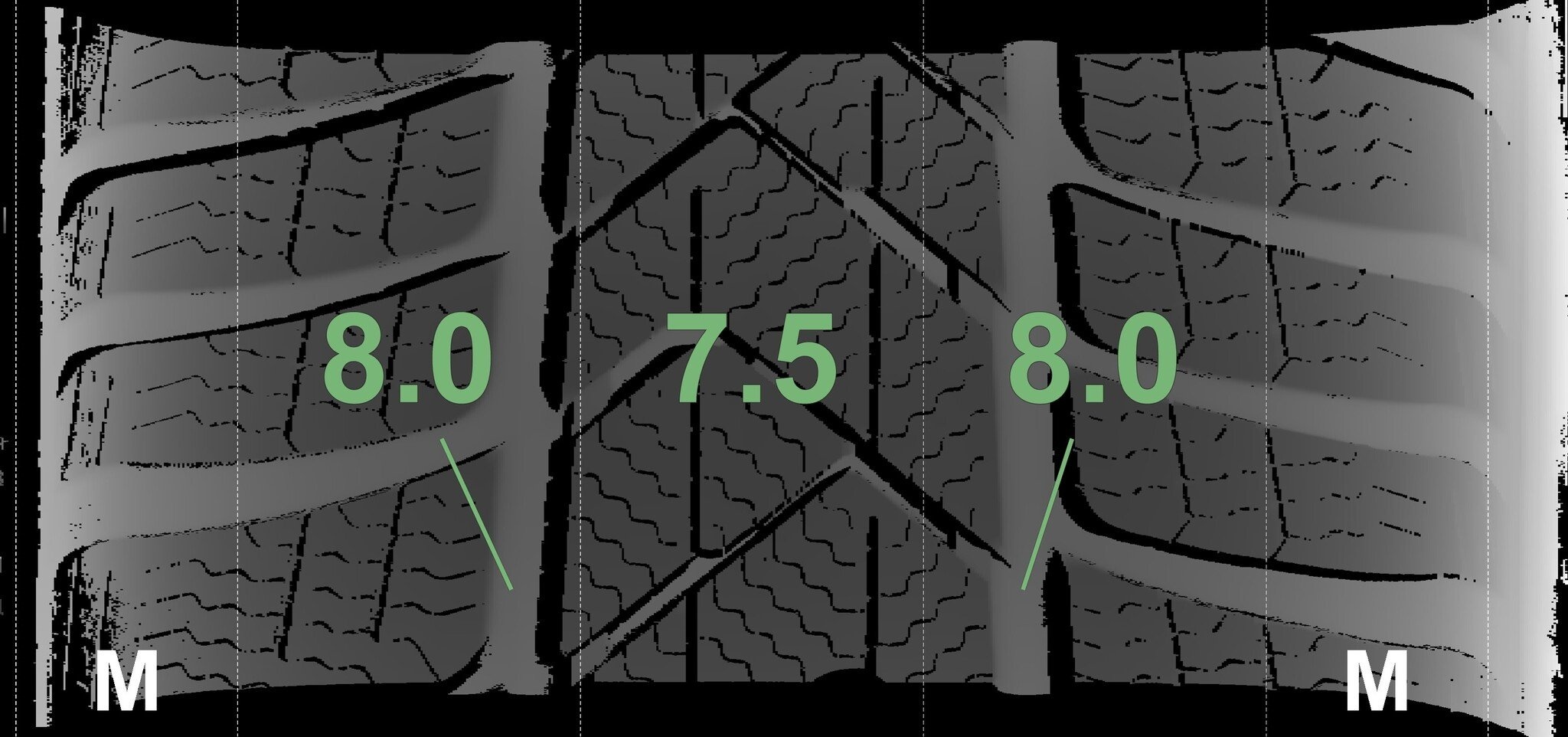 | Zustand | Profiltiefe | DOT | Vorderachse Links | Neu | 7,5 mm | 4624 |