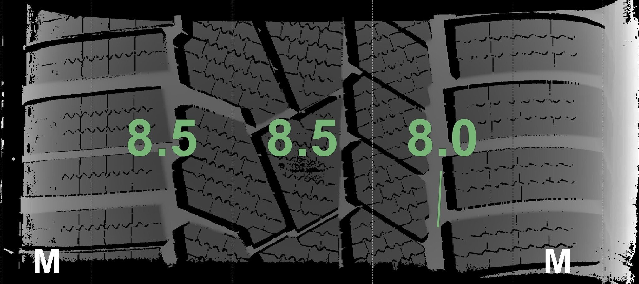 | Zustand | Profiltiefe | DOT | Vorderachse Links | Neu | 8,0 mm | 2625 |