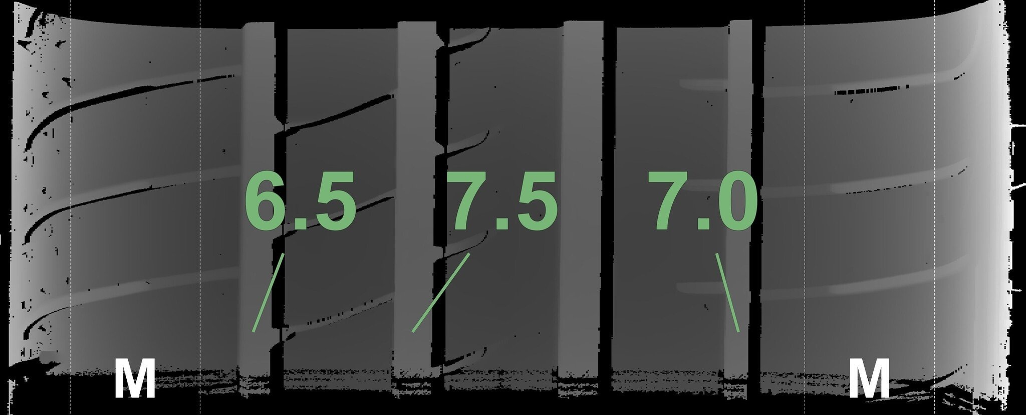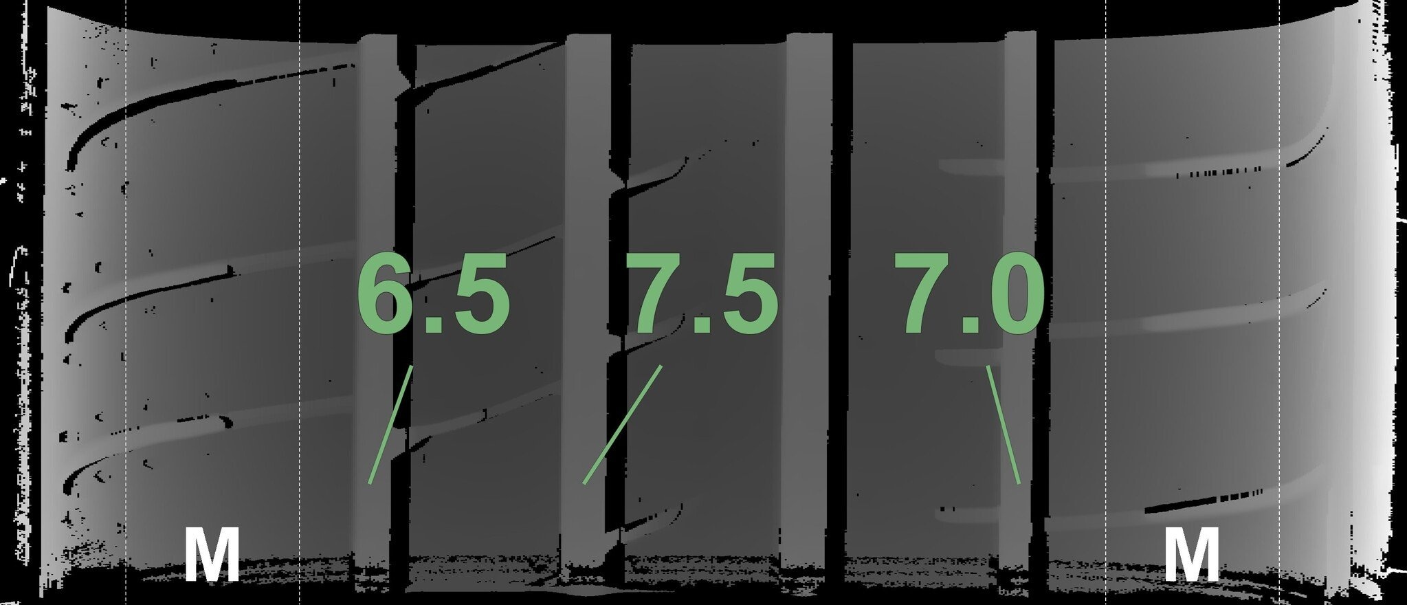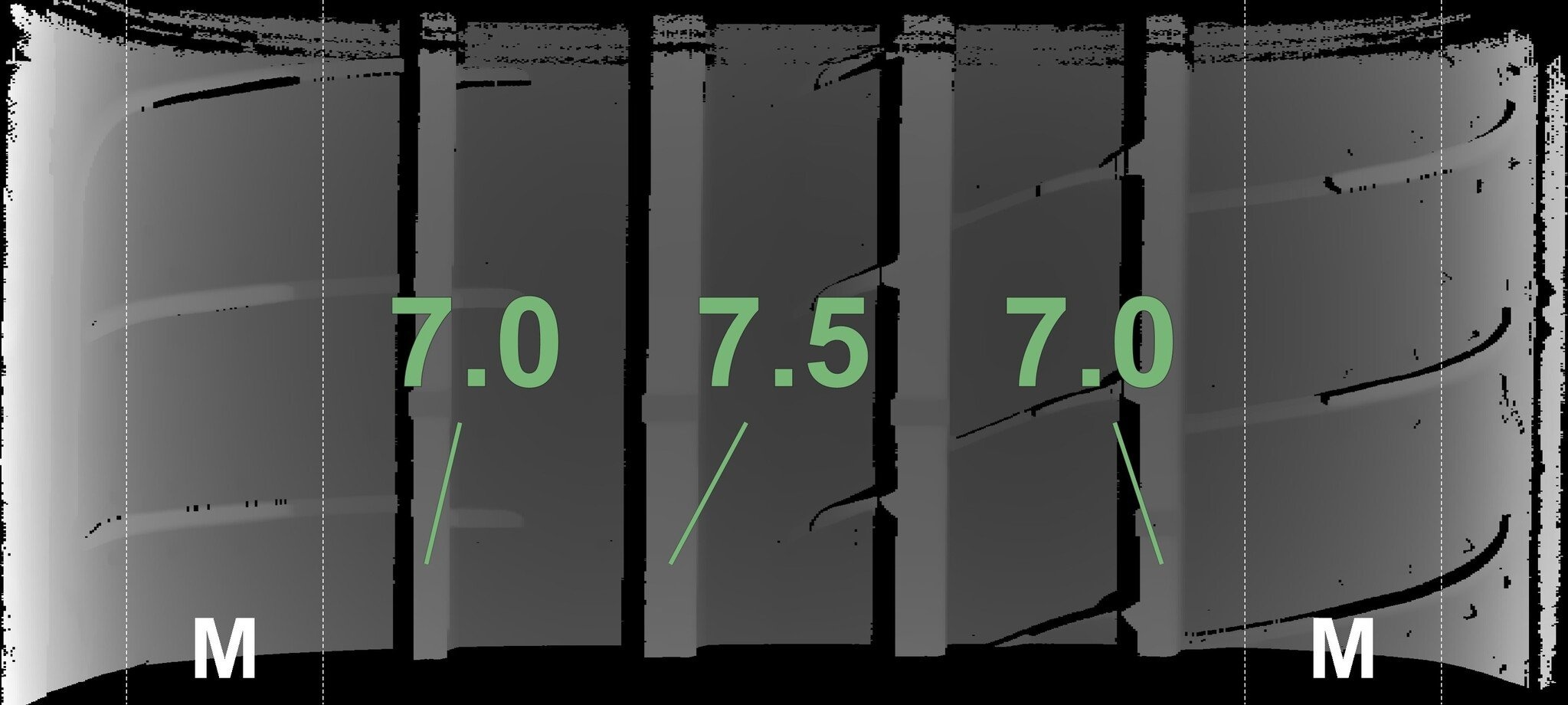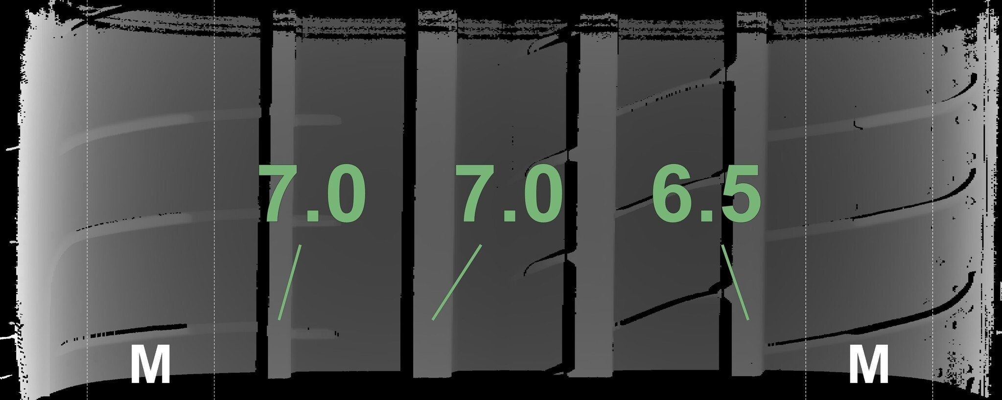 Die gemessenen Profiltiefen und die Details der Felgen sind oben angegeben.