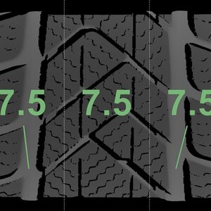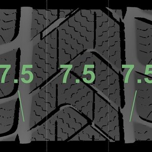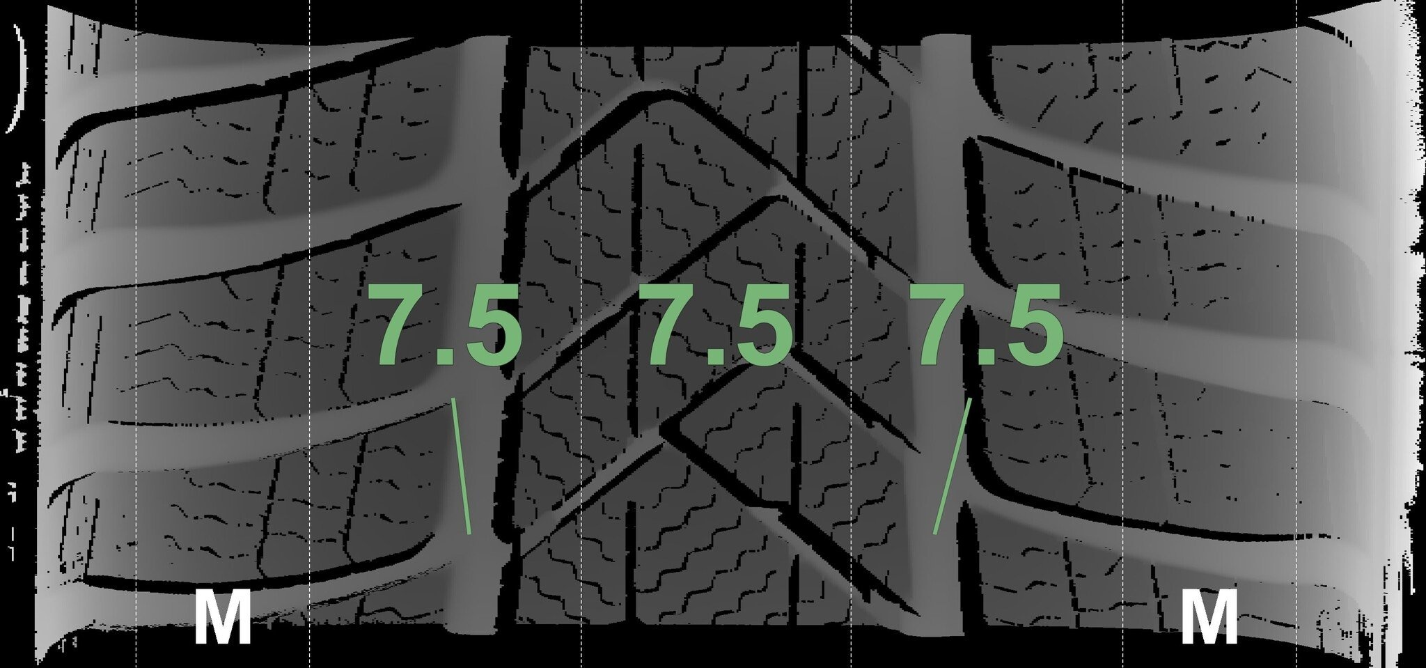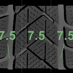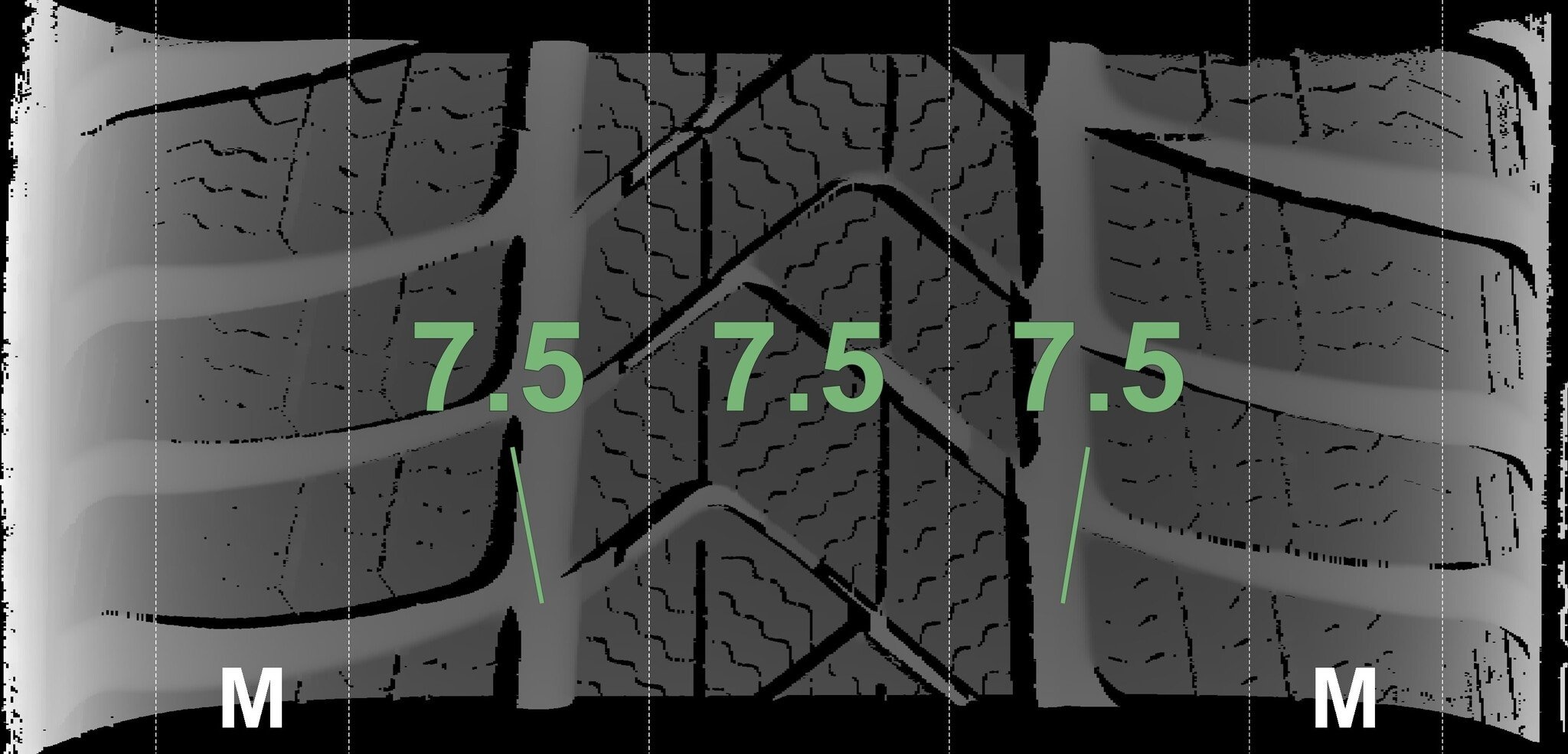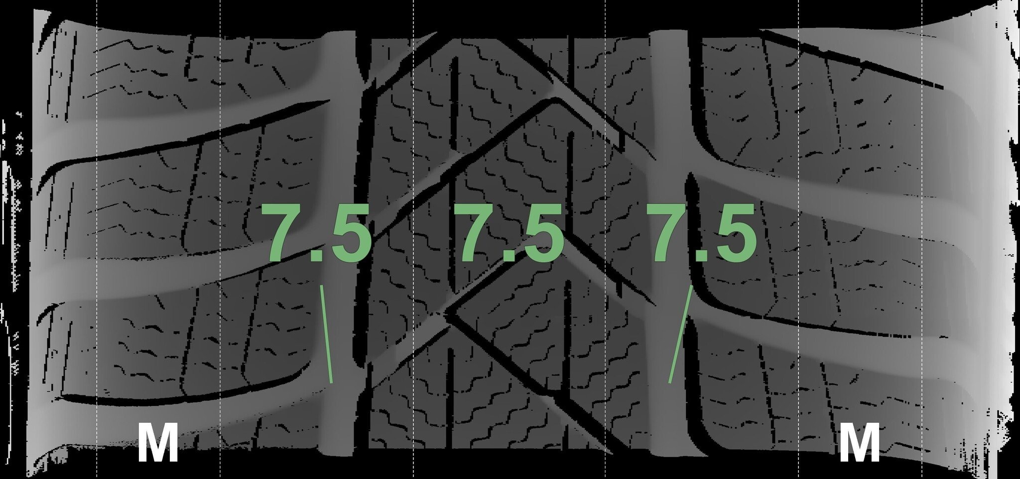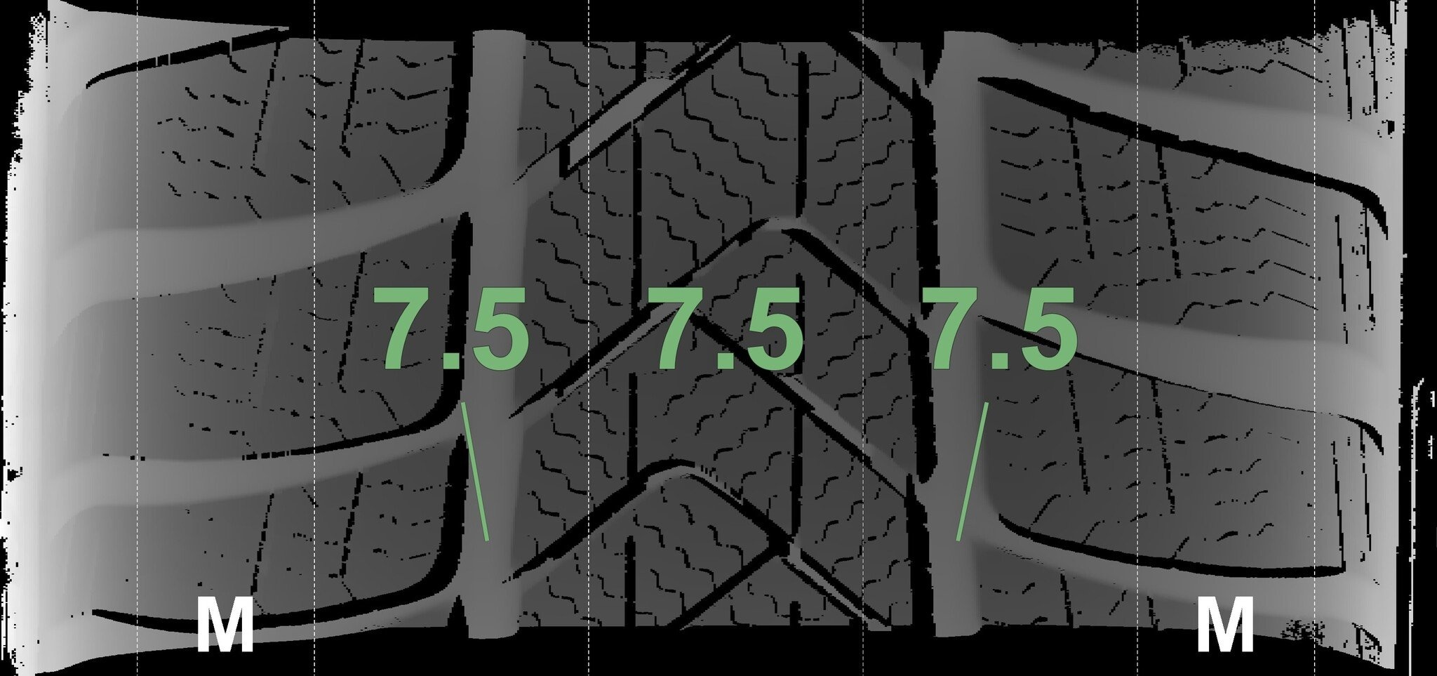 | Zustand | Profiltiefe | DOT | Vorderachse Links | Neu | 7,5 mm | 3522 |