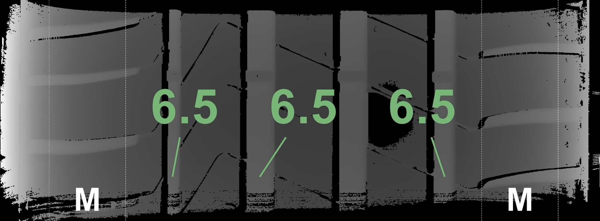 Zustand | Profiltiefe | DOT | Vorderachse Rechts | Demo-Noppen noch sichtbar | 6,5 mm | 4623 |