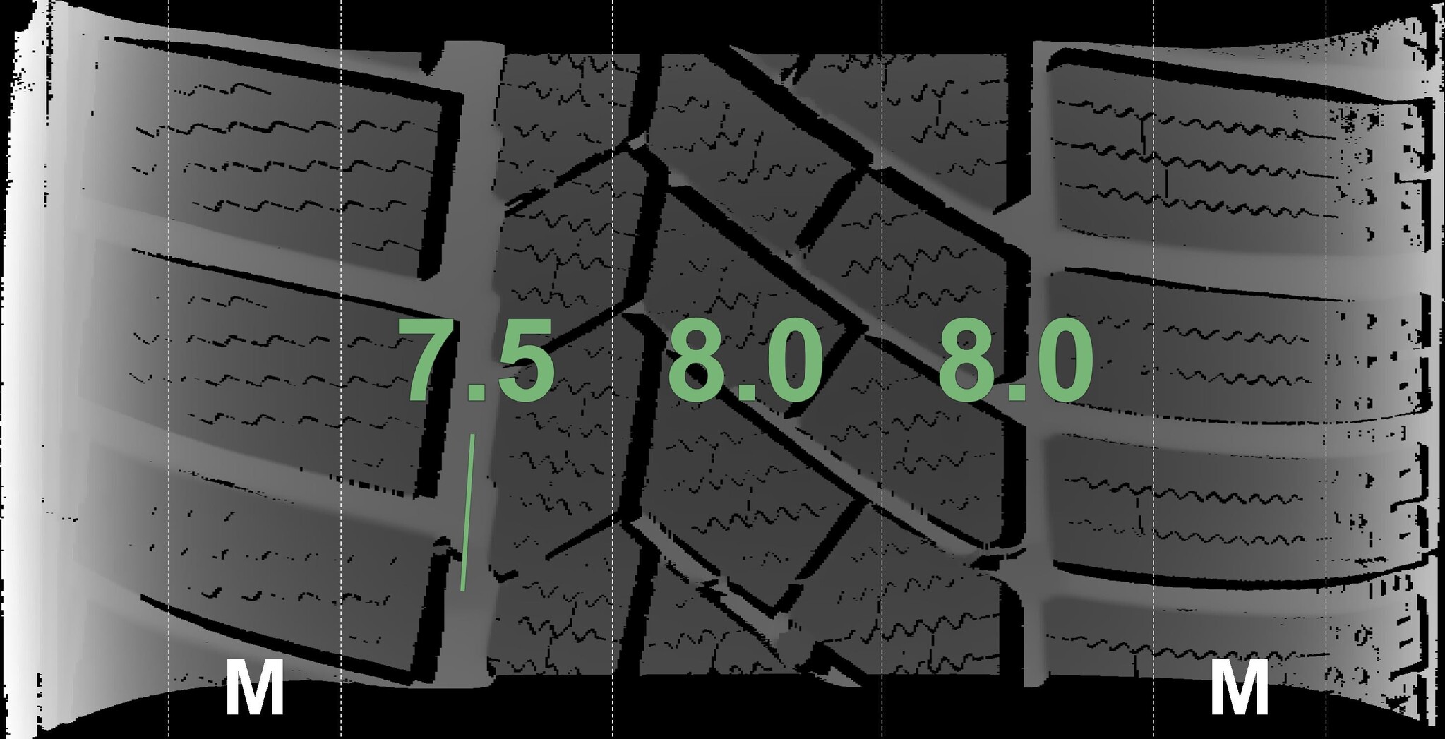 | Zustand | Profiltiefe | DOT | Vorderachse Links | Demo-Noppen noch sichtbar | 7,5 mm | 2519 |