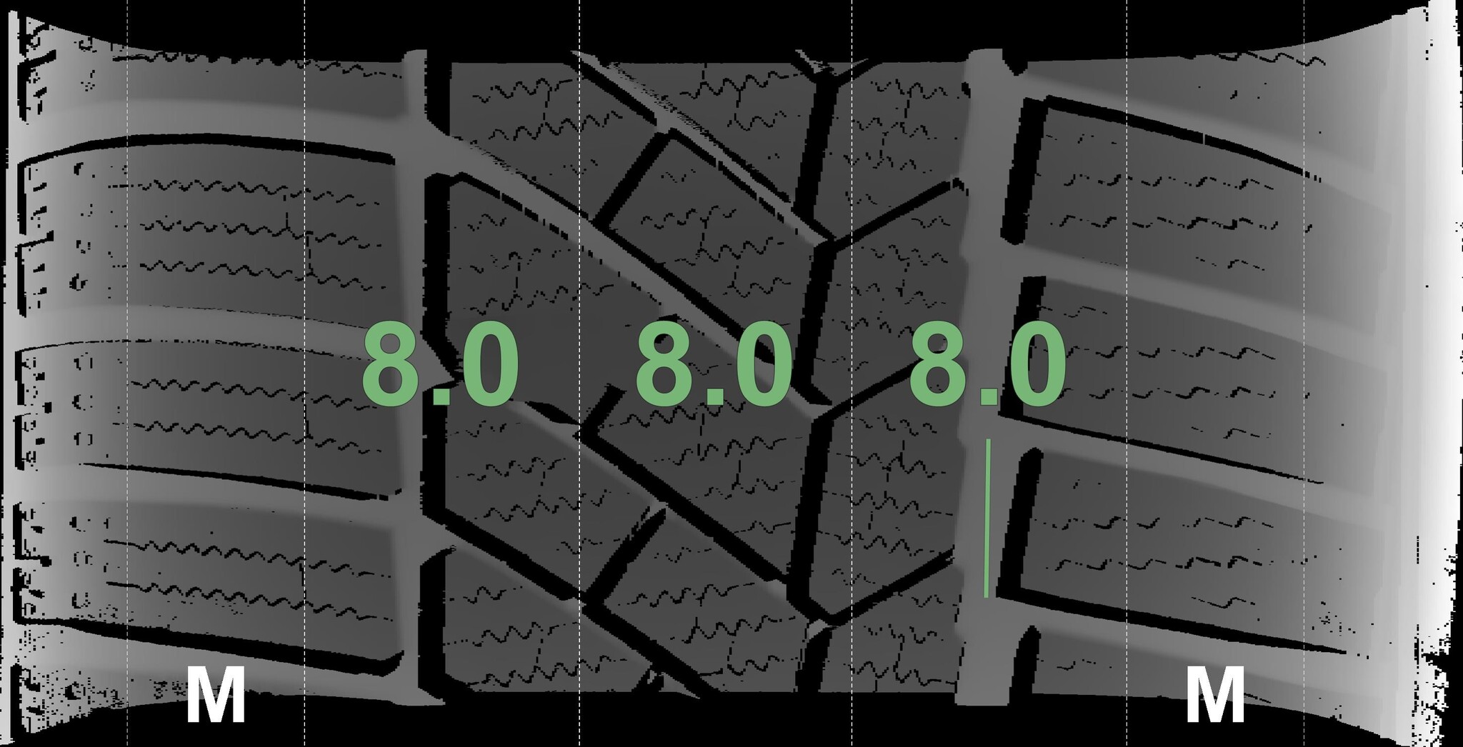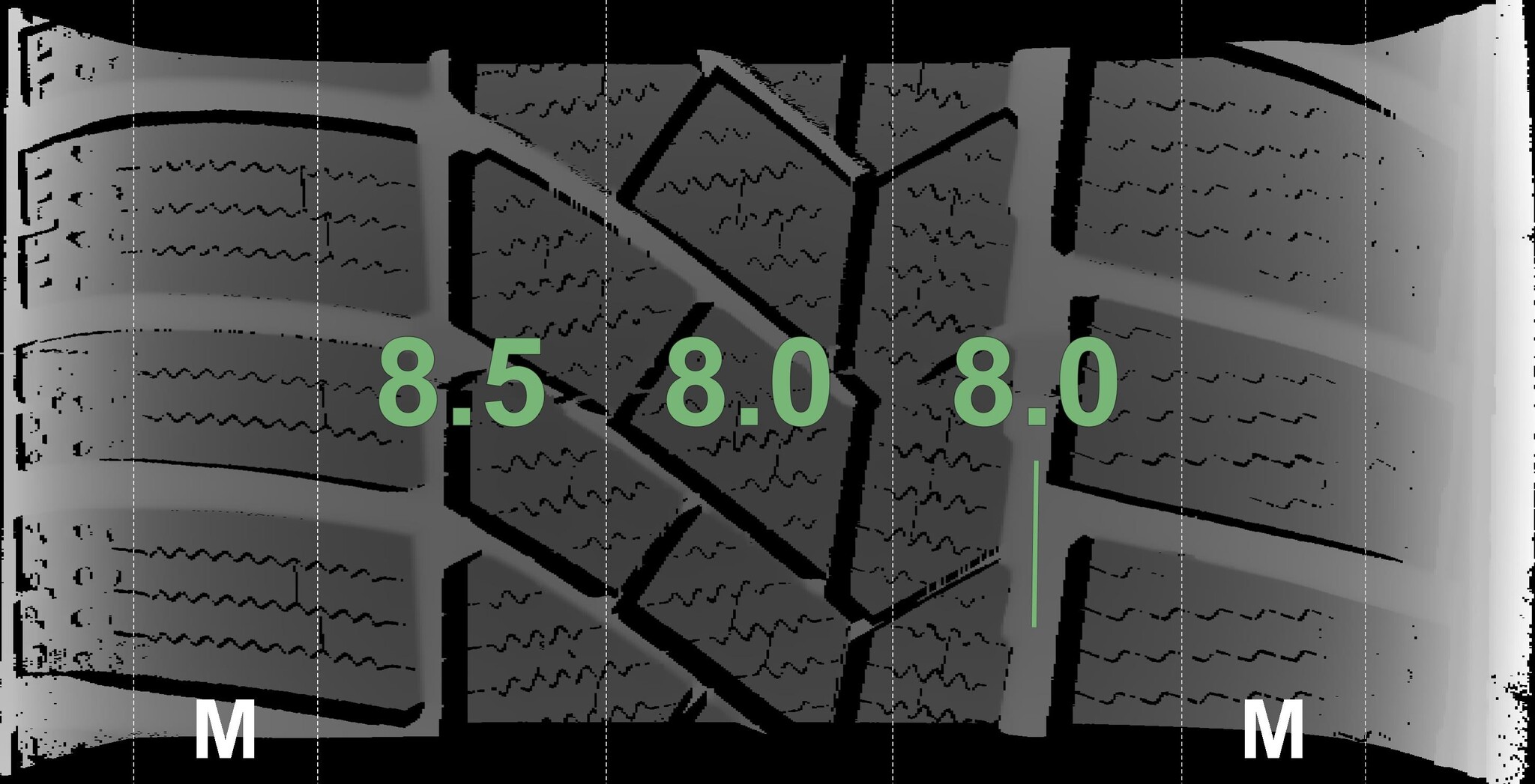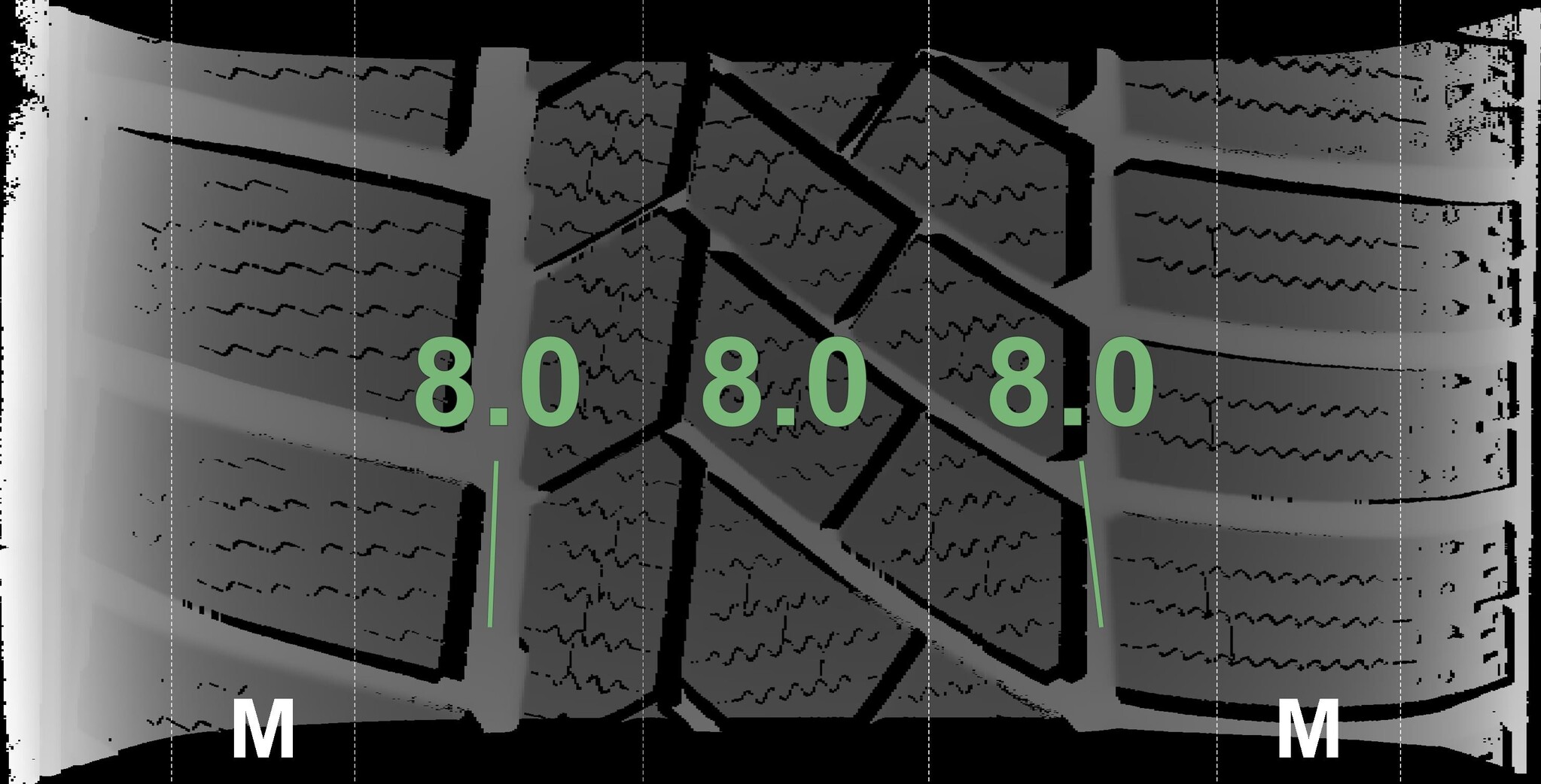 | Zustand | Profiltiefe | DOT | Hinterachse Links | Demobolzen noch sichtbar | 8,0 mm | 2519 |