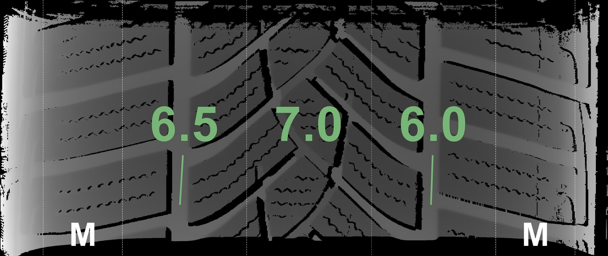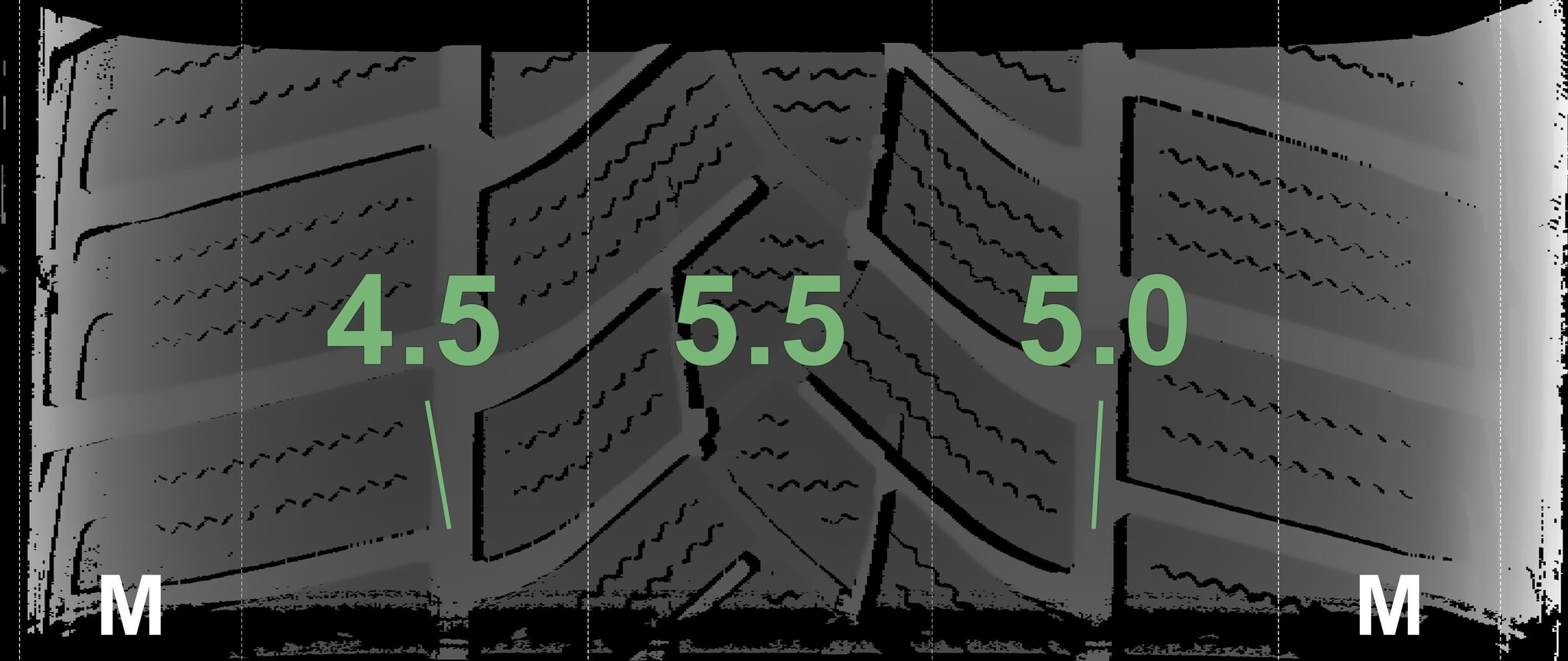 Die gemessenen Profiltiefen und die Details der Felgen sind oben dargestellt.