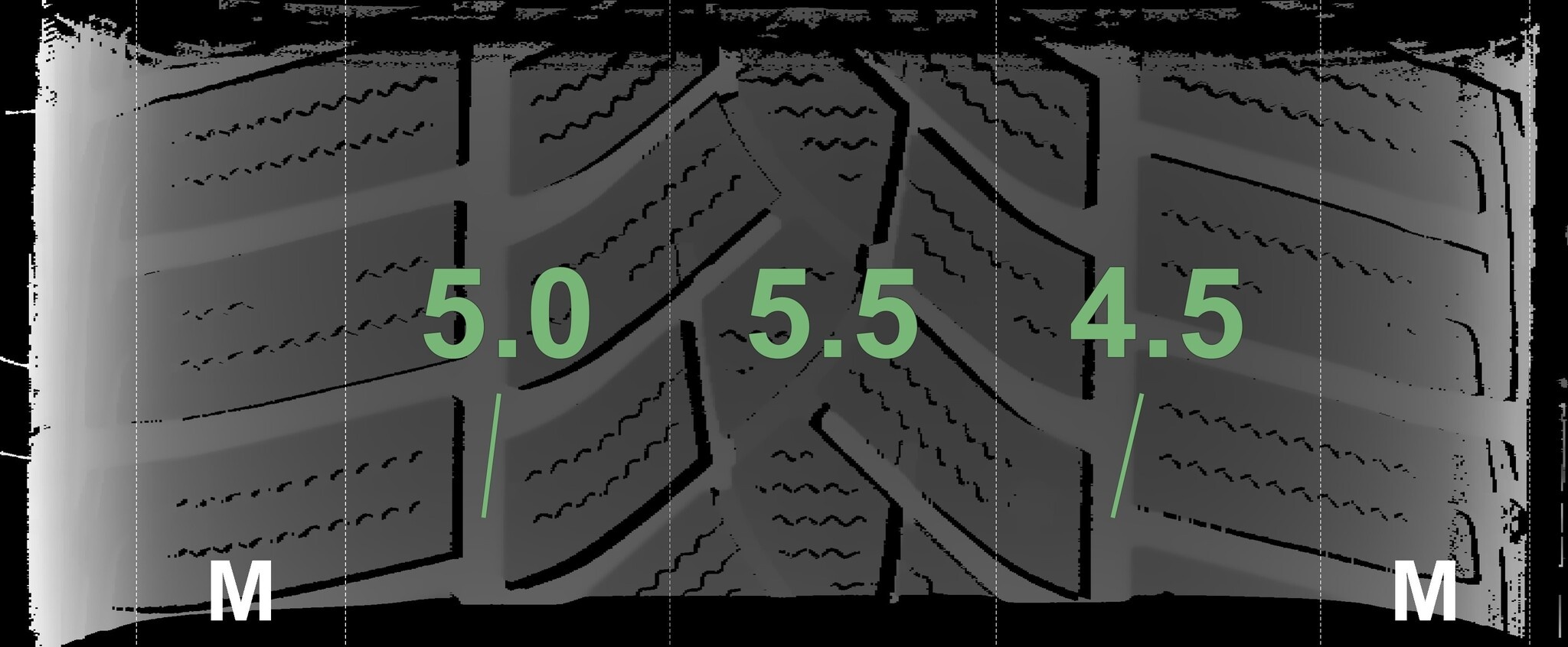 | Zustand | Profiltiefe | DOT | Vorderachse Links | Gebraucht | 4,5 mm | 4318 |
