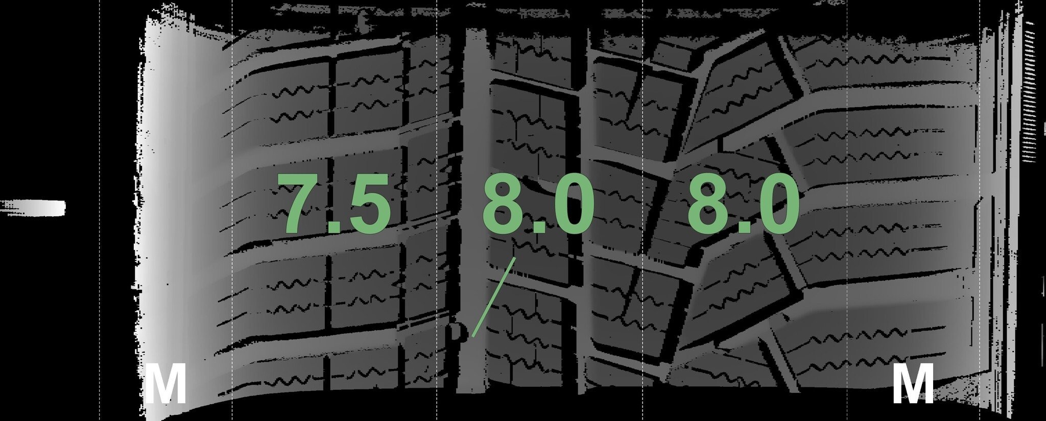 | Zustand | Profiltiefe | DOT | Hinterachse Rechts | Neu | 7,5 mm | 4025 |