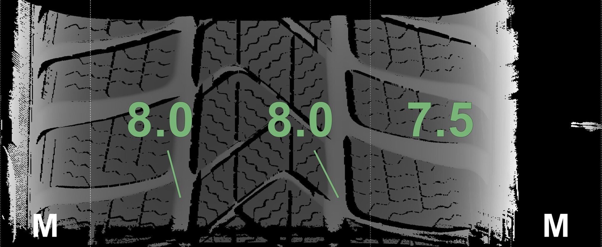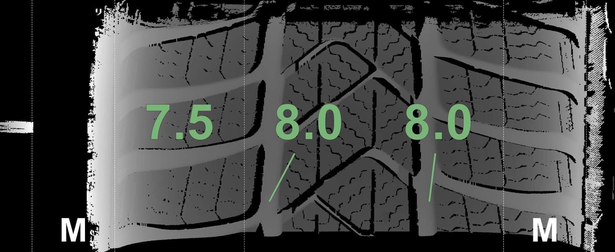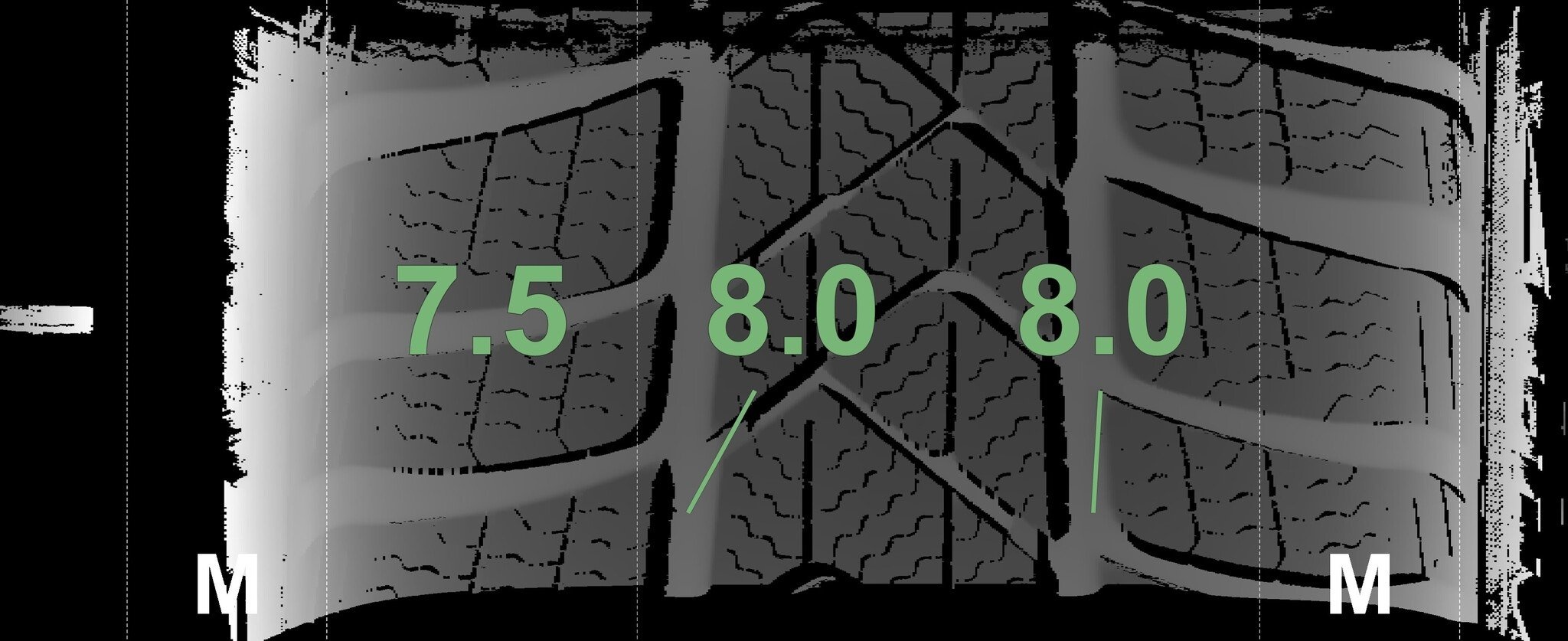 Die gemessenen Profiltiefen und die Details der Felgen sind oben angegeben.