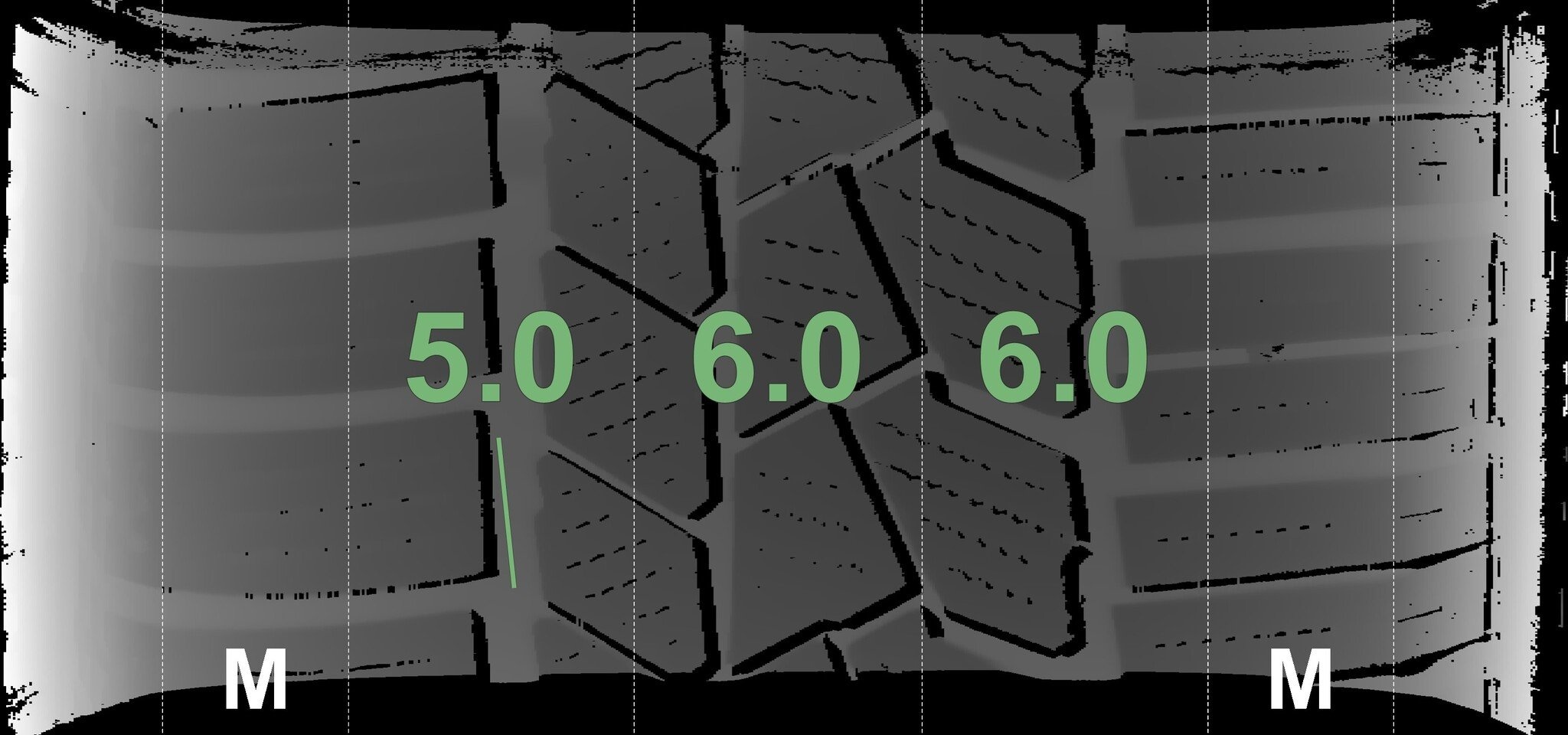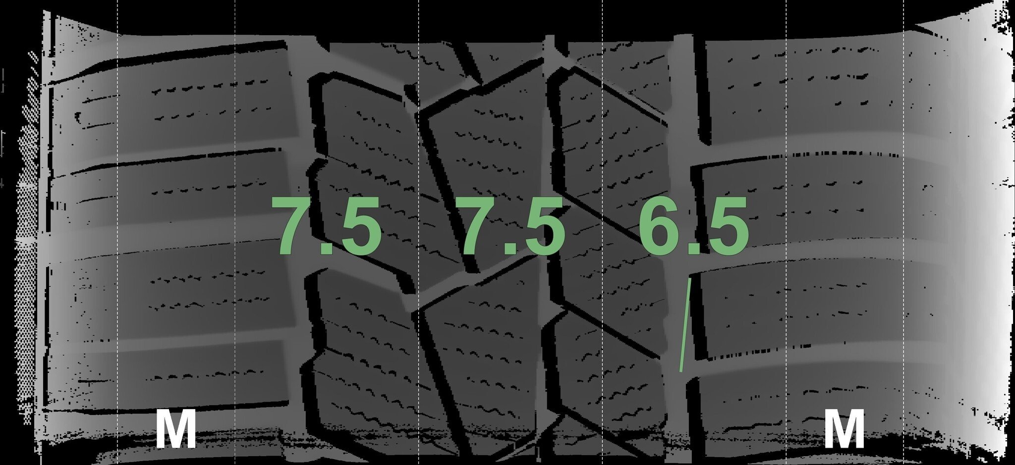 | Zustand | Profiltiefe | DOT | Vorderachse Links | Gebraucht | 6,5 mm | 4123 |