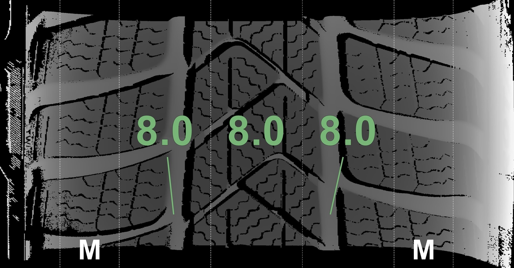 | Zustand | Profiltiefe | DOT | Hinterachse Links | Neu | 8,0 mm | 4021 |
