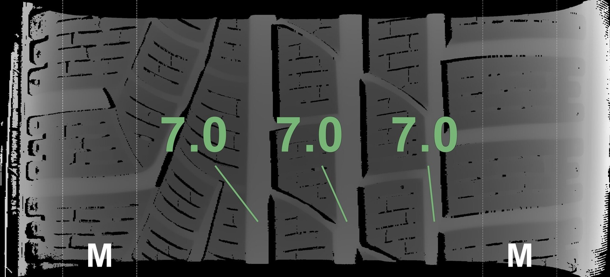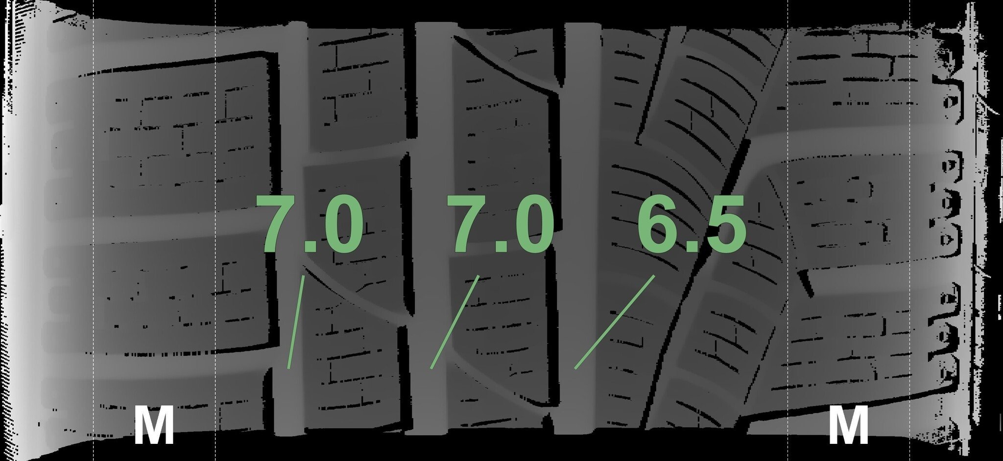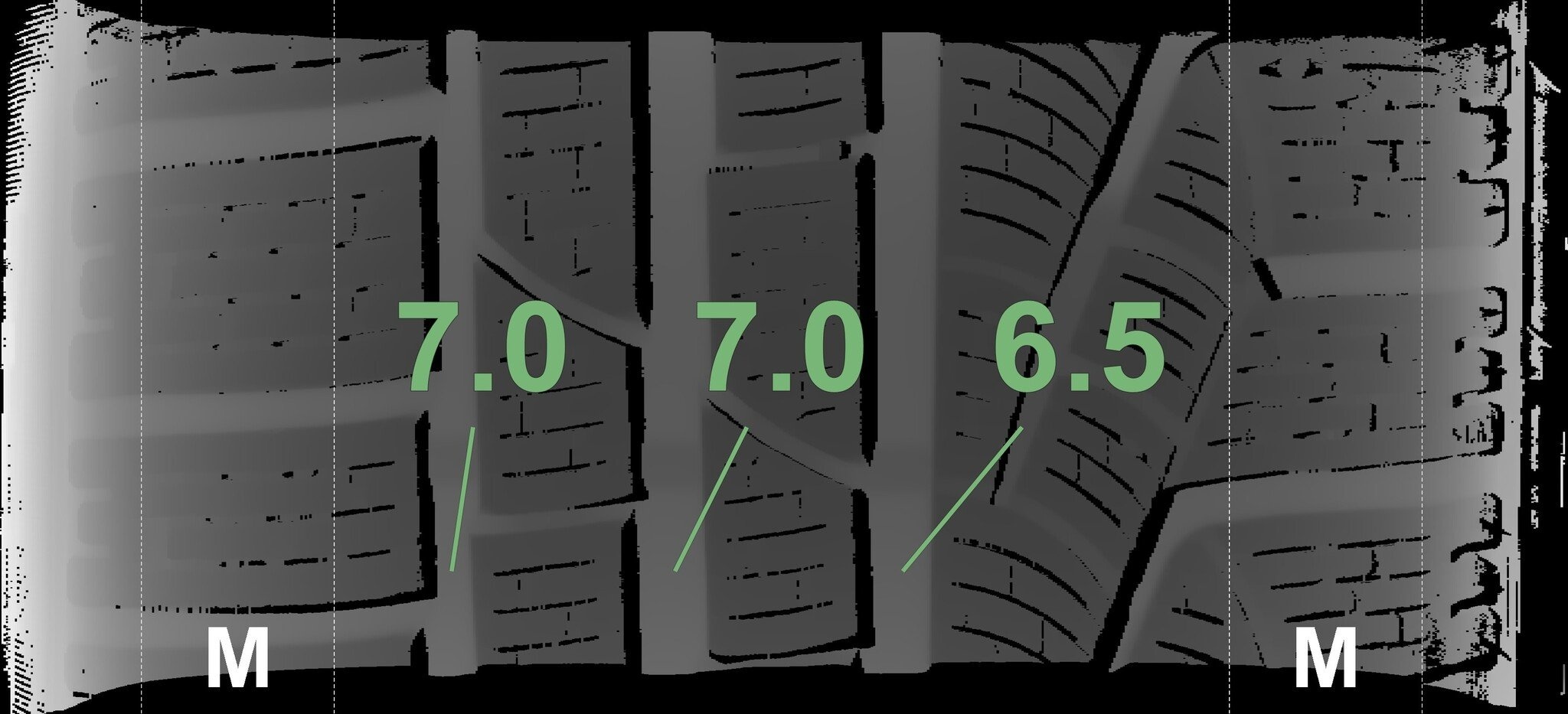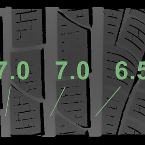 Die gemessenen Profiltiefen und die Details der Felgen sind oben dargestellt.