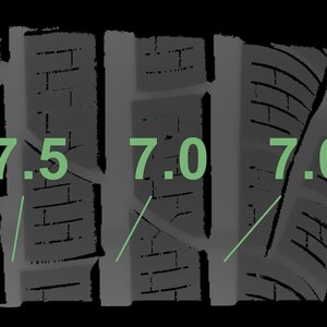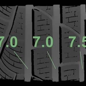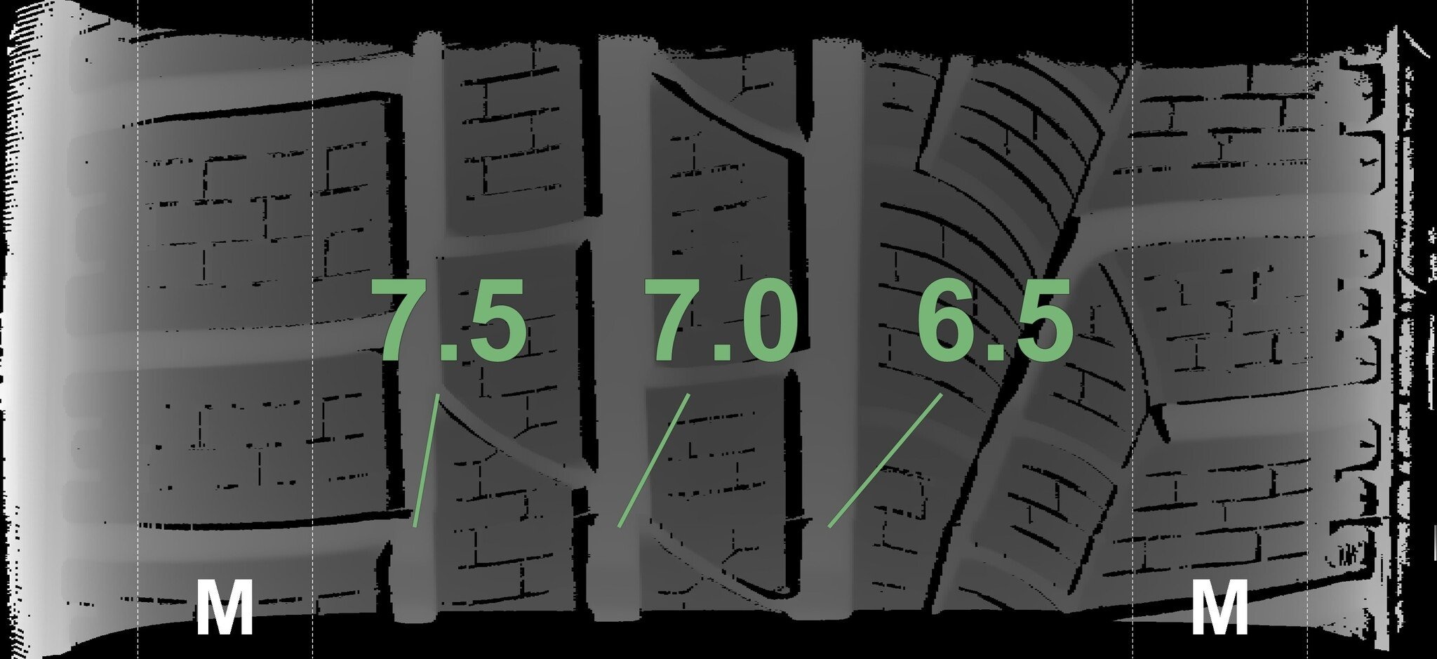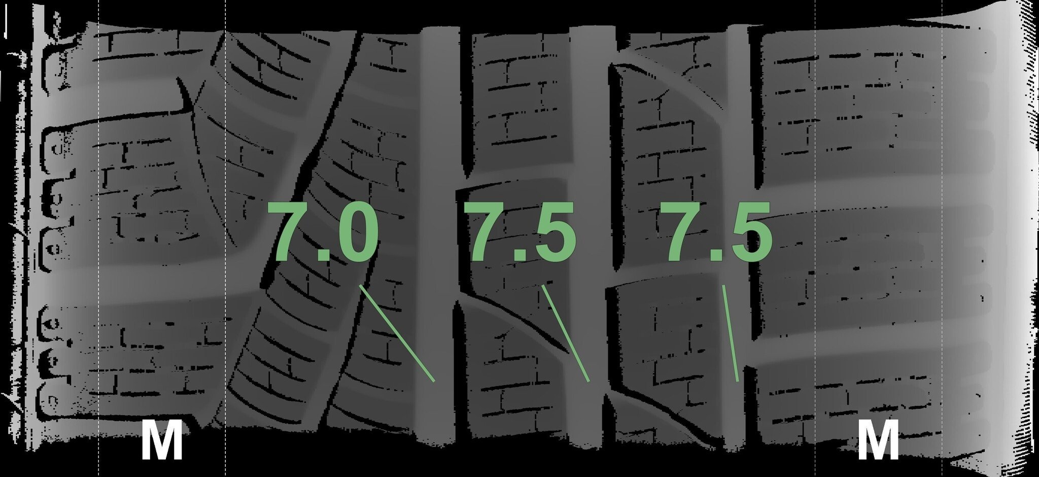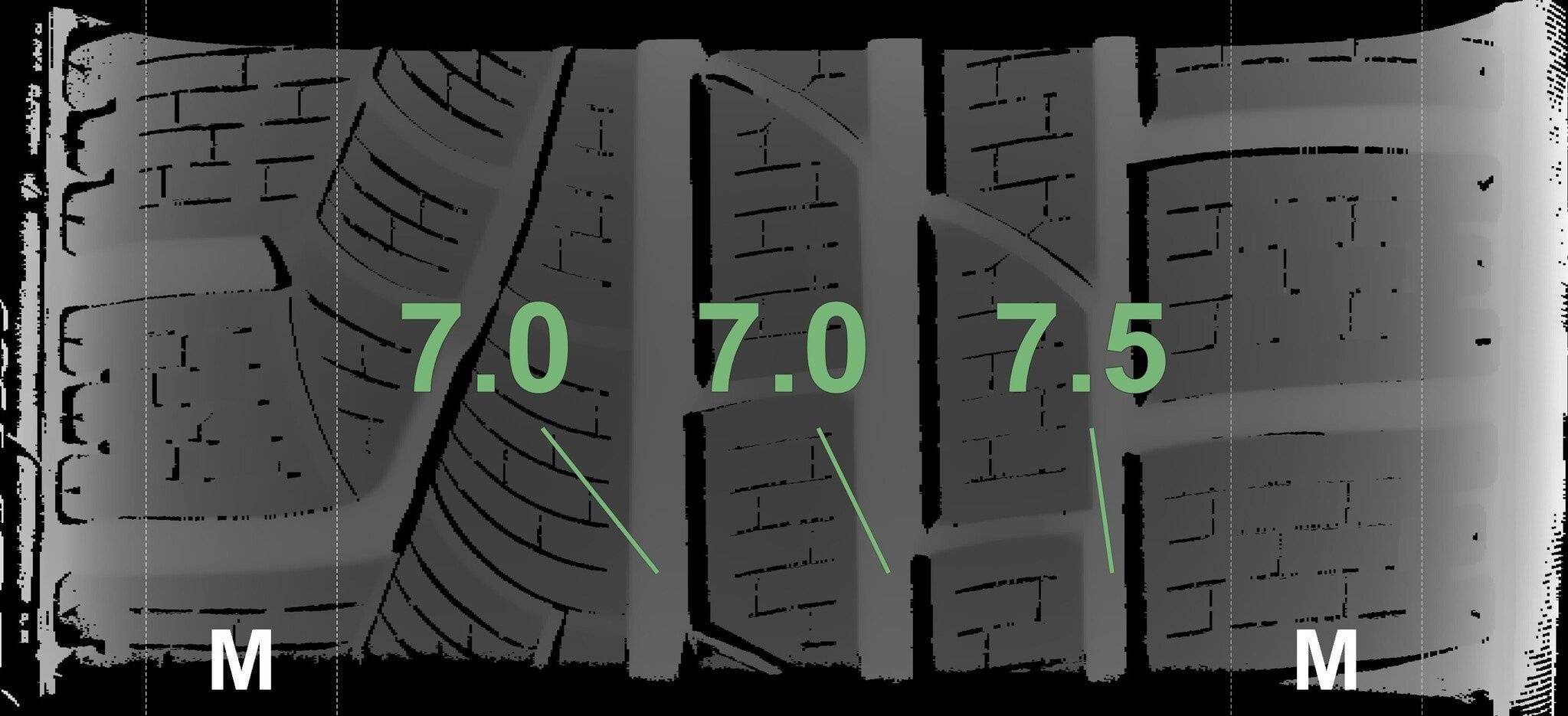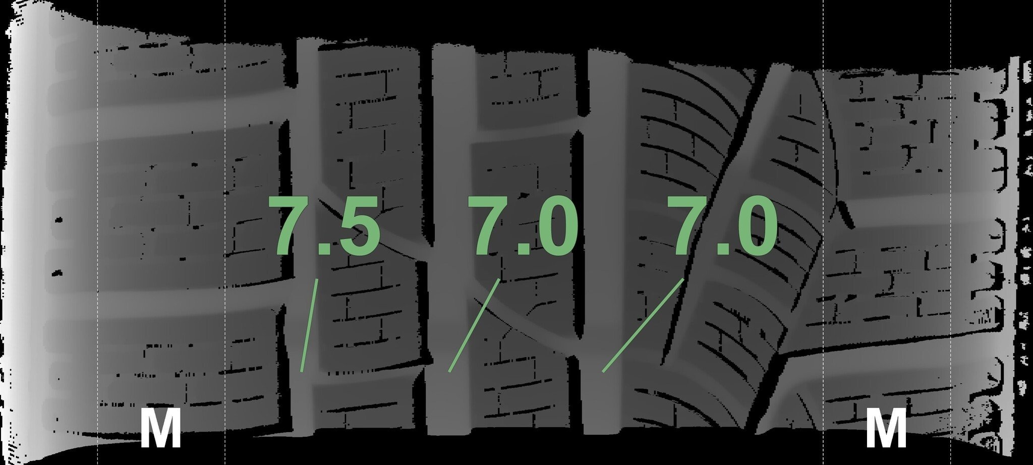 Die gemessenen Profiltiefen und die Details der Felgen sind oben dargestellt.