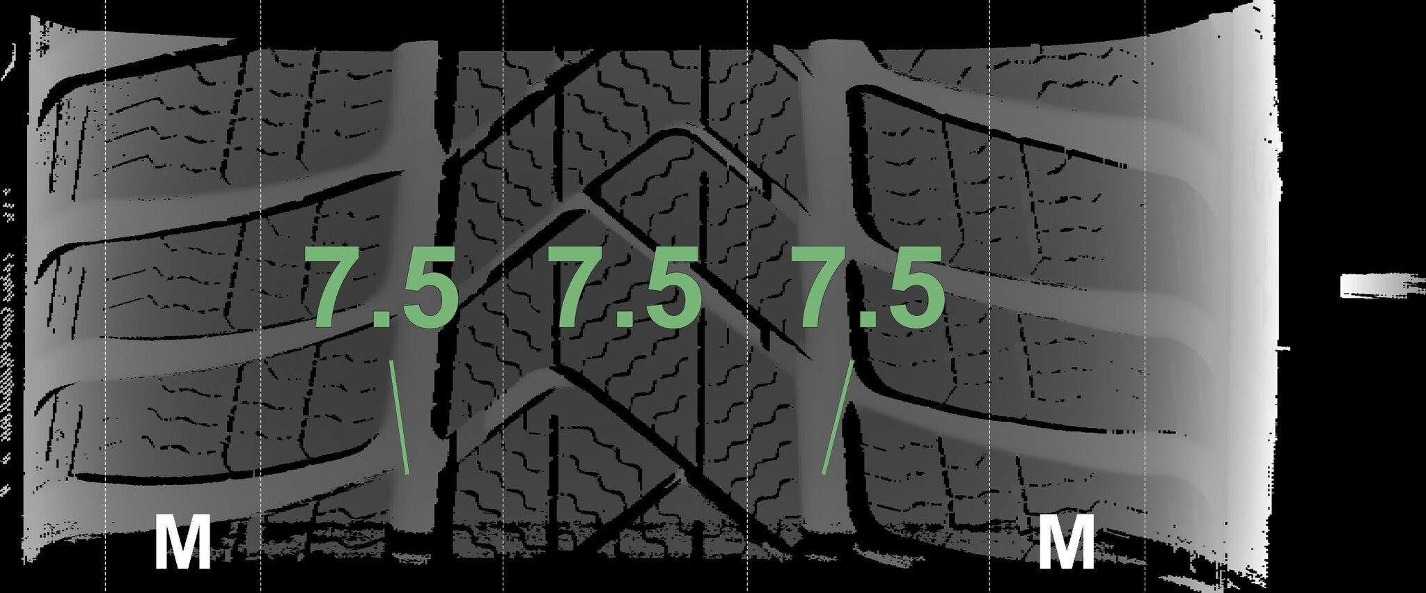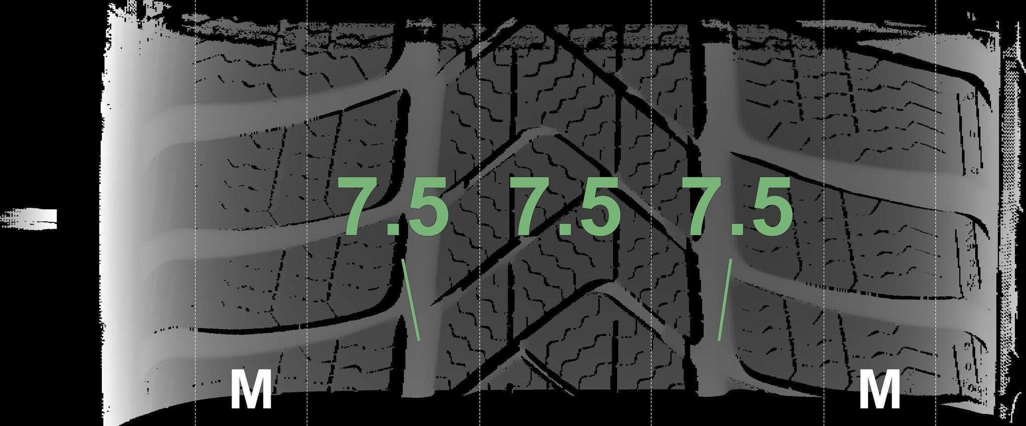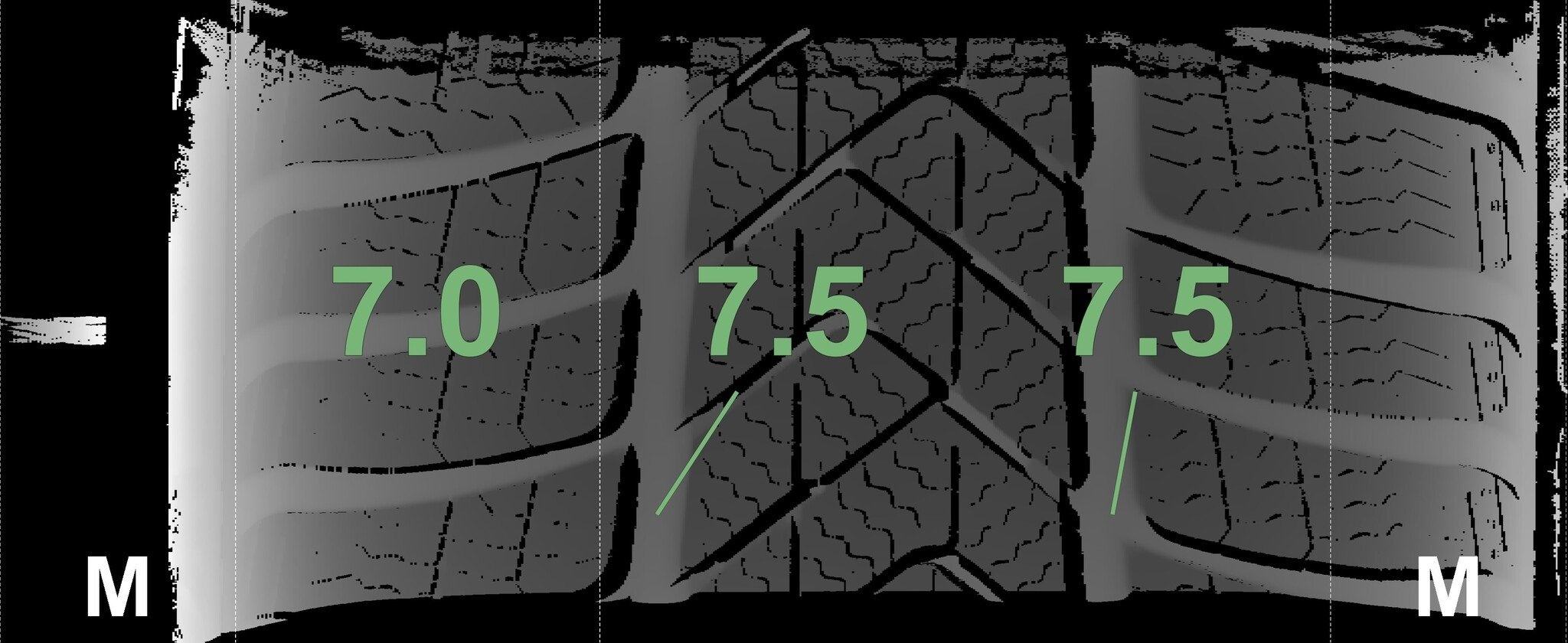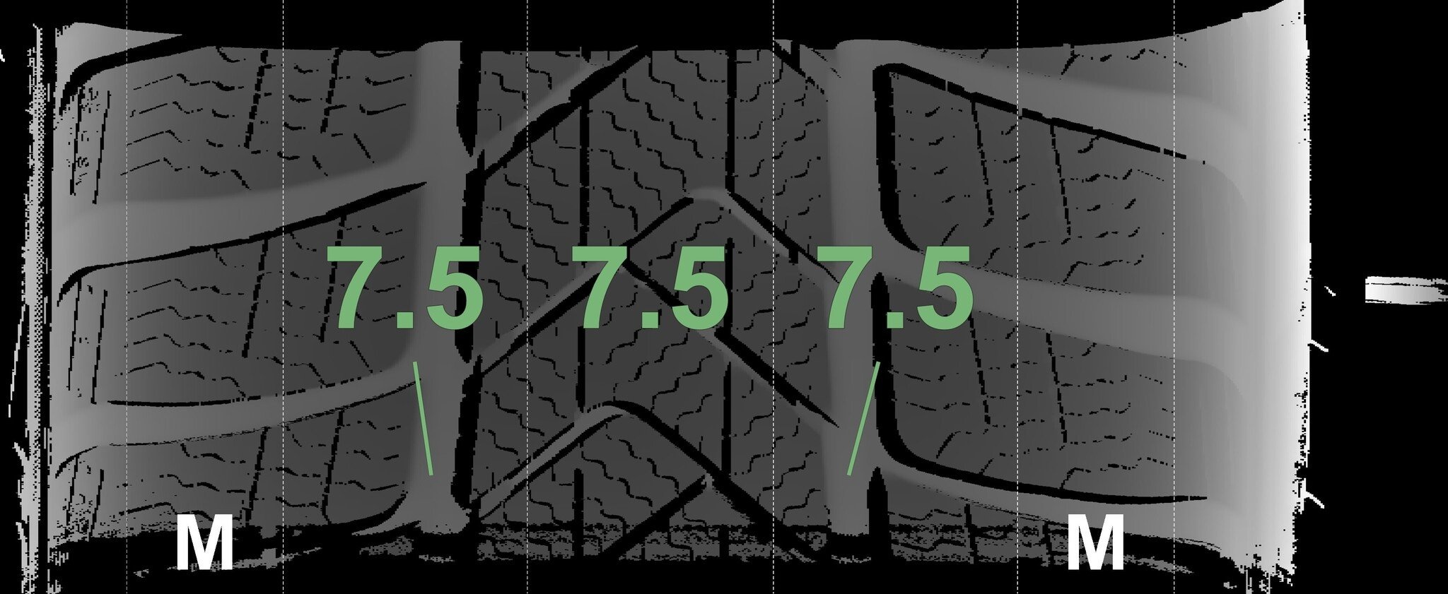 | Zustand | Profiltiefe | DOT | Vorderachse Rechts | Neu | 7.5 mm | 3422 |