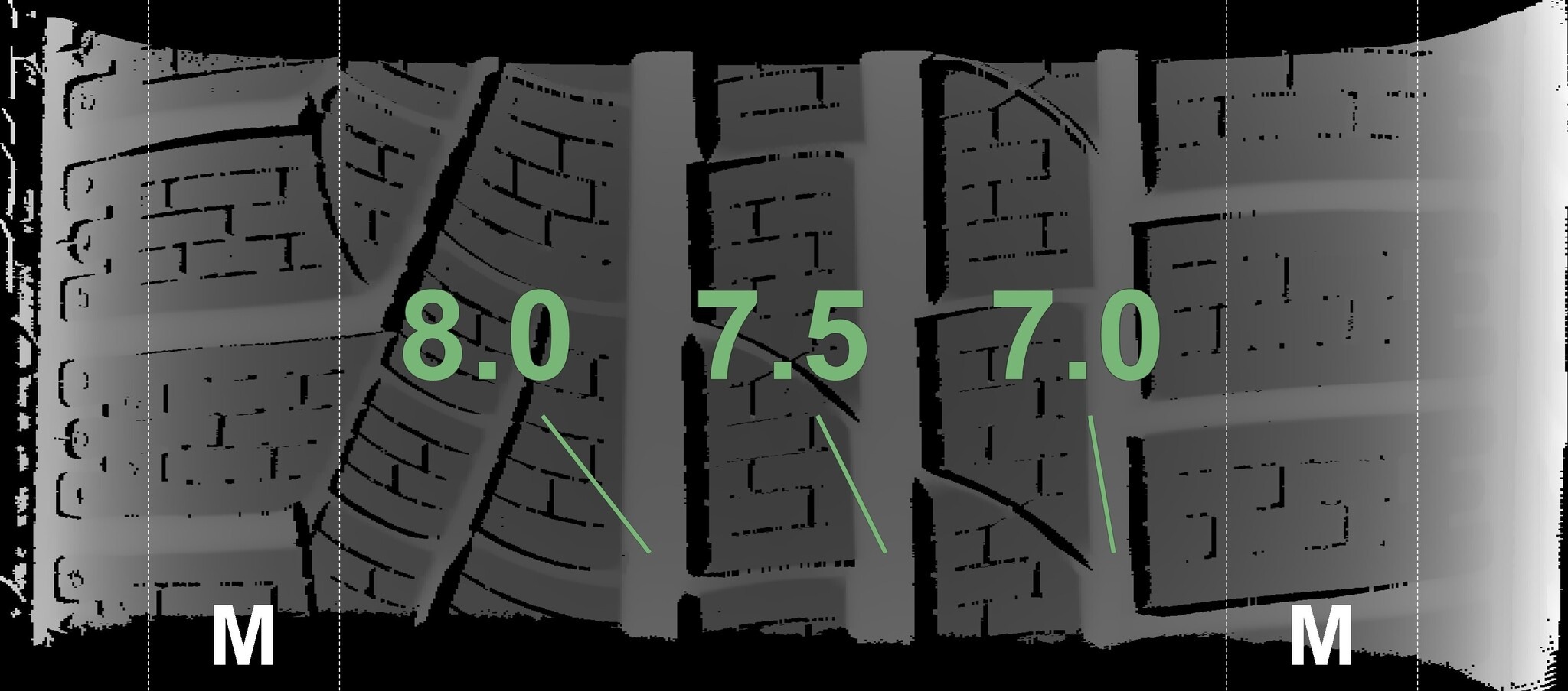 | Zustand | Profiltiefe | DOT | Hinterachse Rechts | Neu | 7.5 mm | 3222 |
