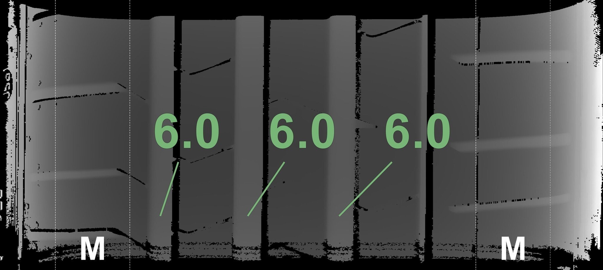 Die gemessenen Profiltiefen und die Details der Felgen sind oben dargestellt.