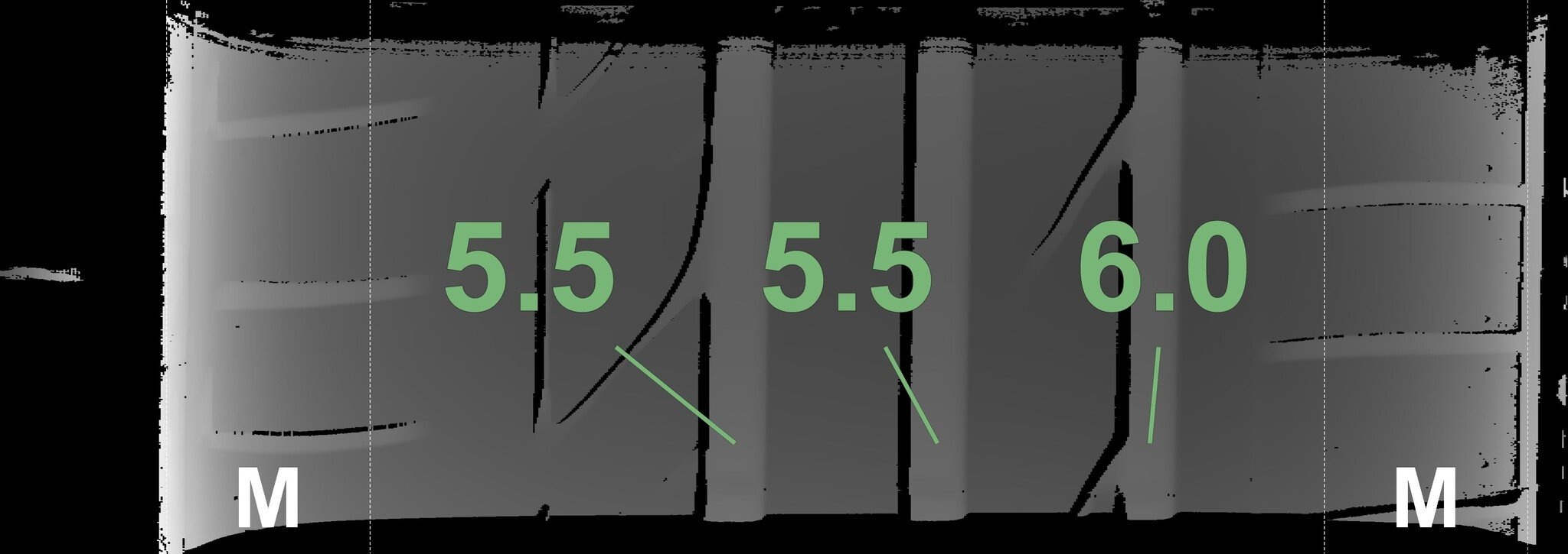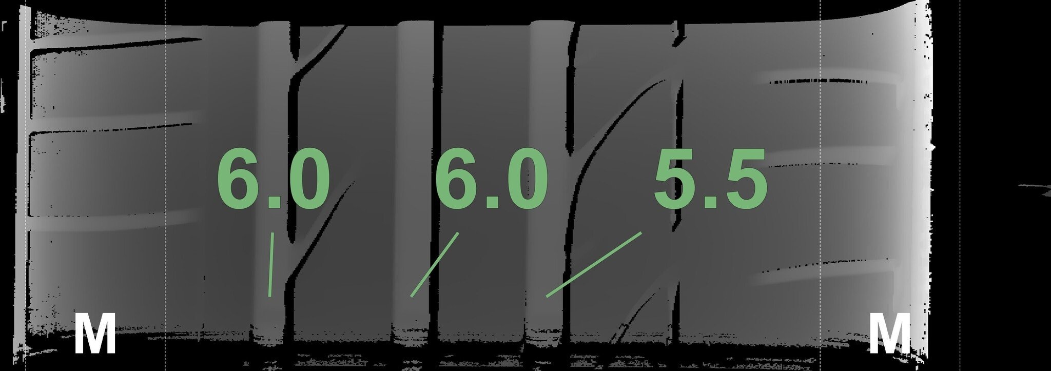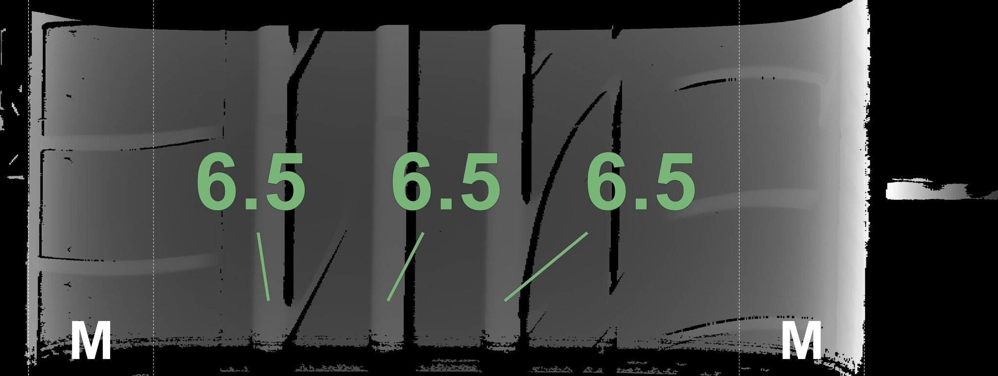 | Zustand | Profiltiefe | DOT | Vorderachse Links | Gebraucht | 6,5 mm | 0119 |