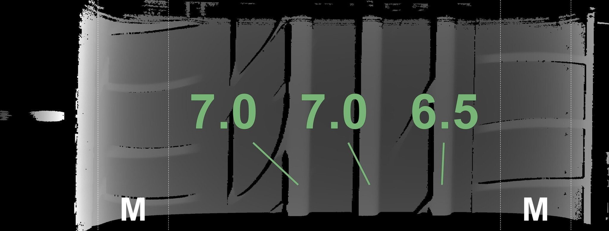 Die gemessenen Profiltiefen und die Details der Felgen sind oben angegeben.