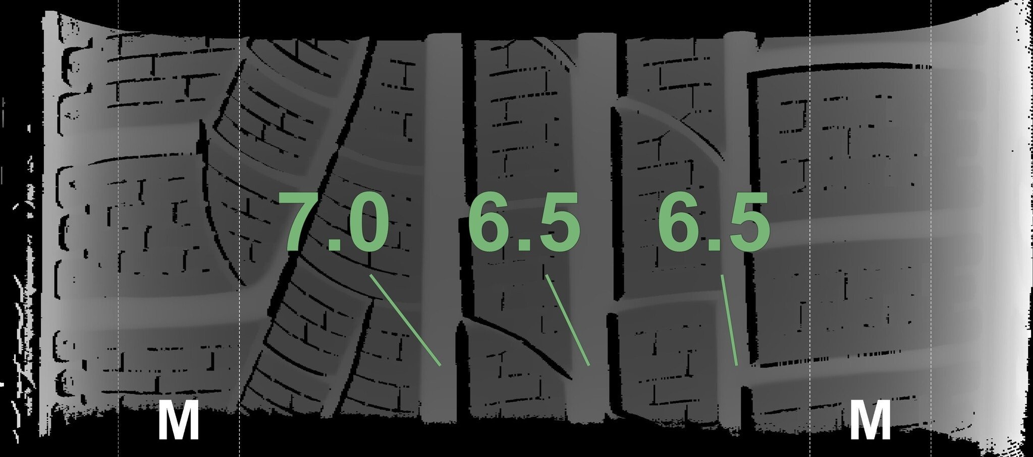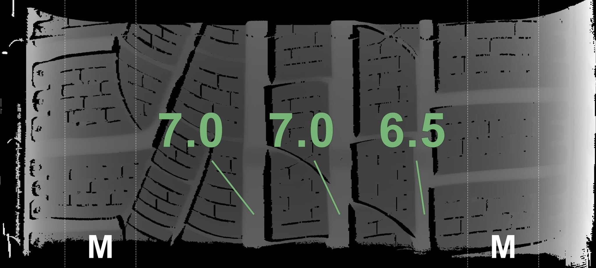 | Zustand | Profiltiefe | DOT | Vorderachse Links | Gebraucht | 6,5 mm | 0320 |