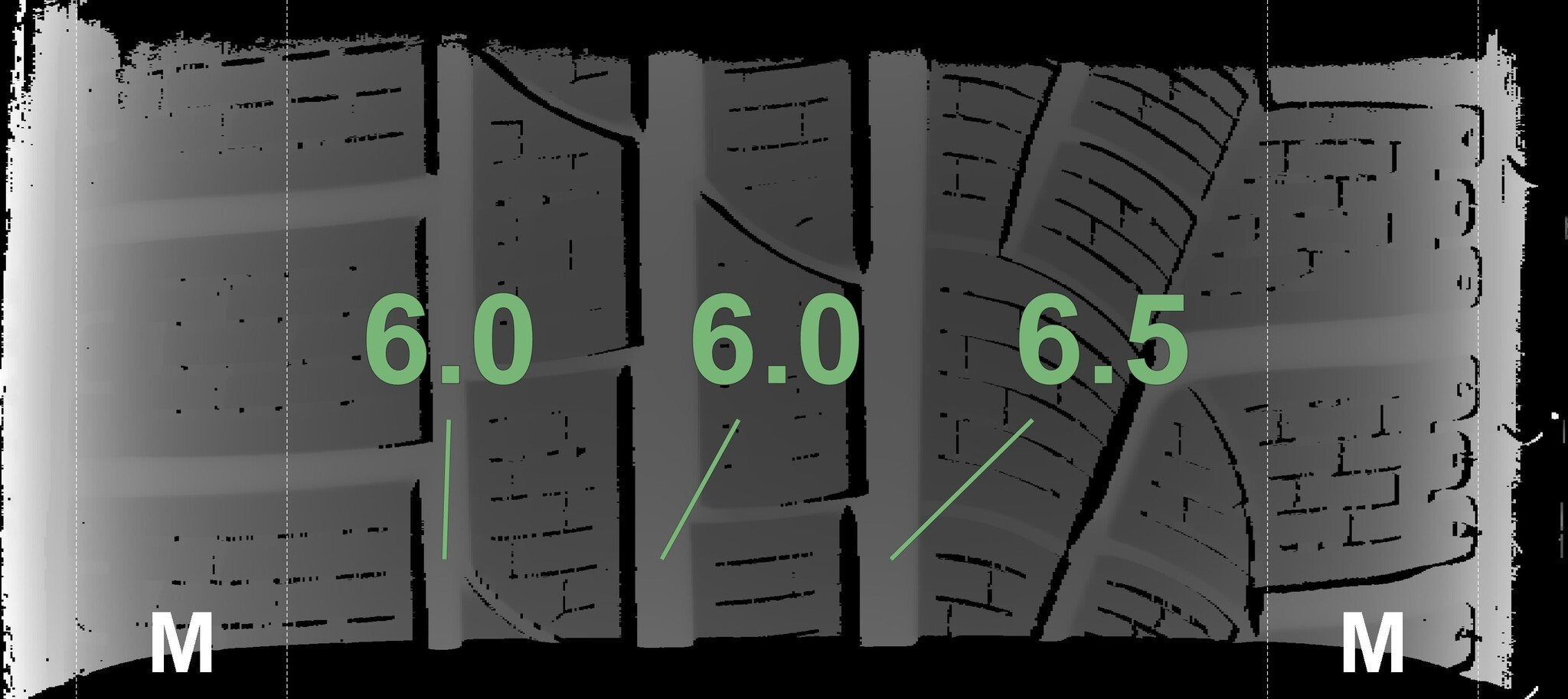 Die gemessenen Profiltiefen und Details der Felgen sind oben abgebildet.