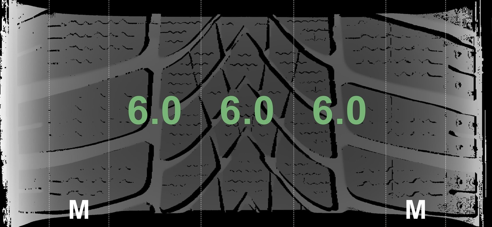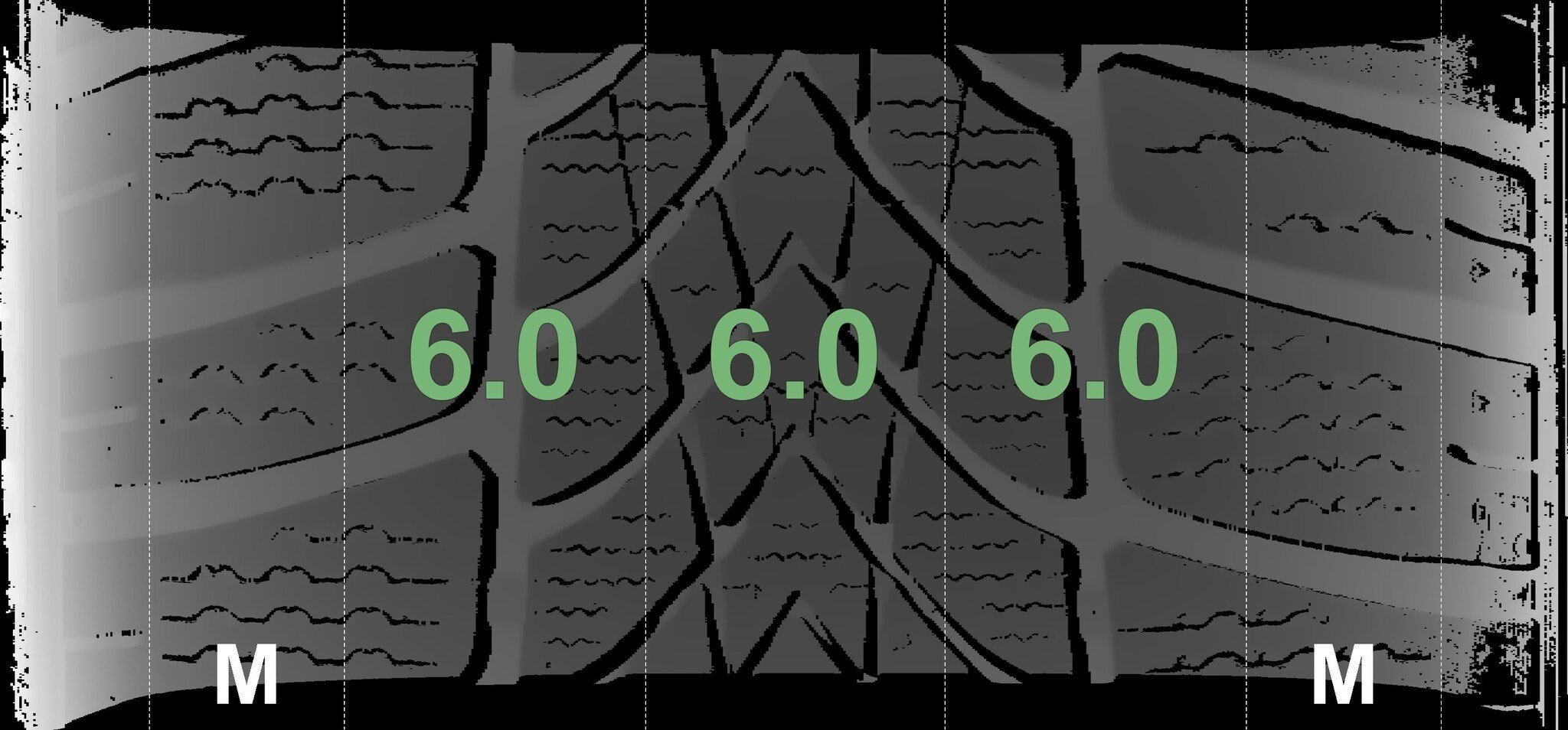 | Zustand | Profiltiefe | DOT | Vorderachse Links | Gebraucht | 6,0 mm | 2418 |