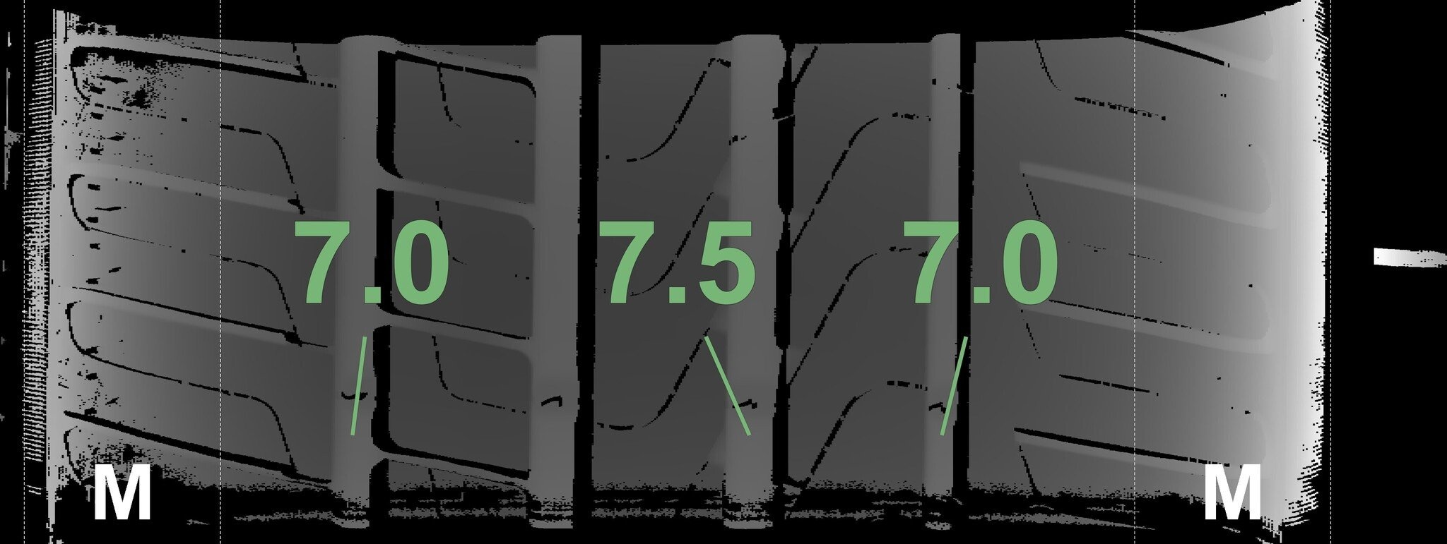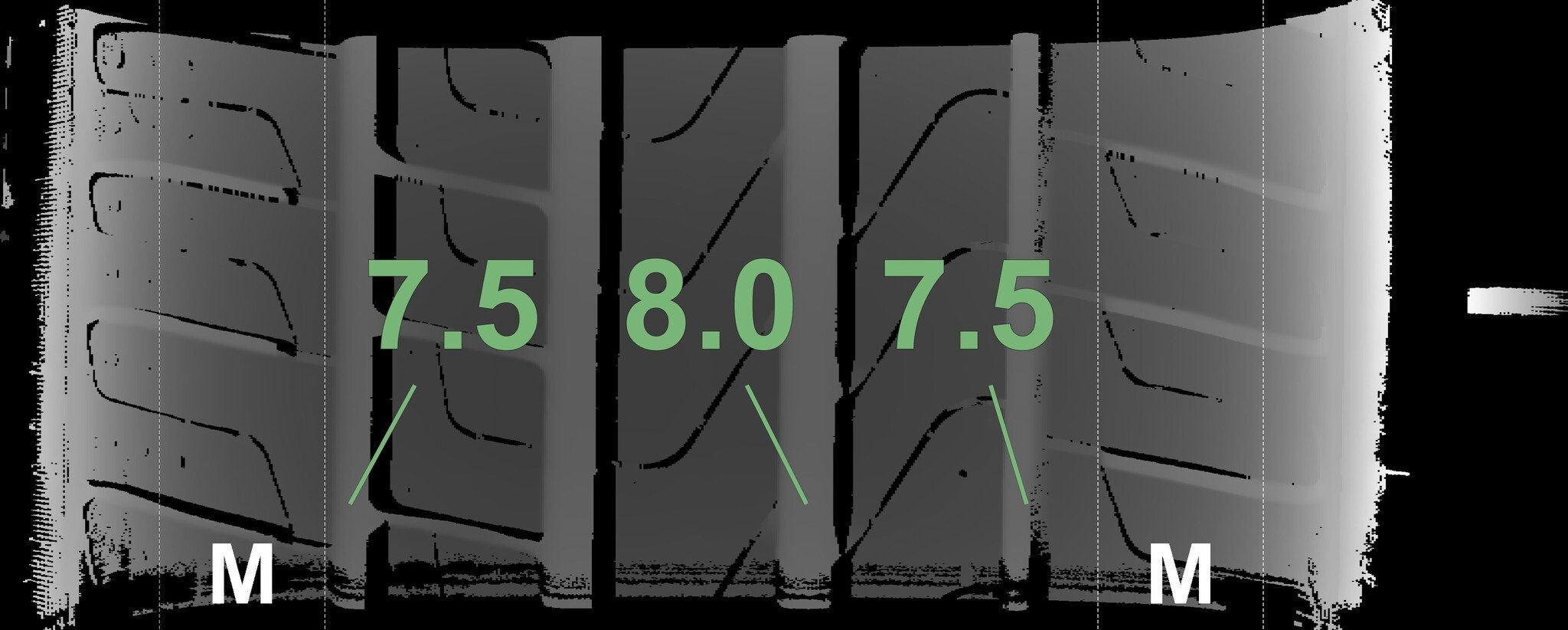 | Zustand | Profiltiefe | DOT | Vorderachse Links | Neu | 7,5 mm | 4522 |