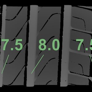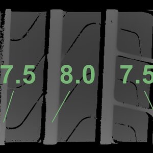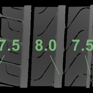 | Zustand | Profiltiefe | DOT | Vorderachse Links | Gebraucht | 7,5 mm | 2516 |