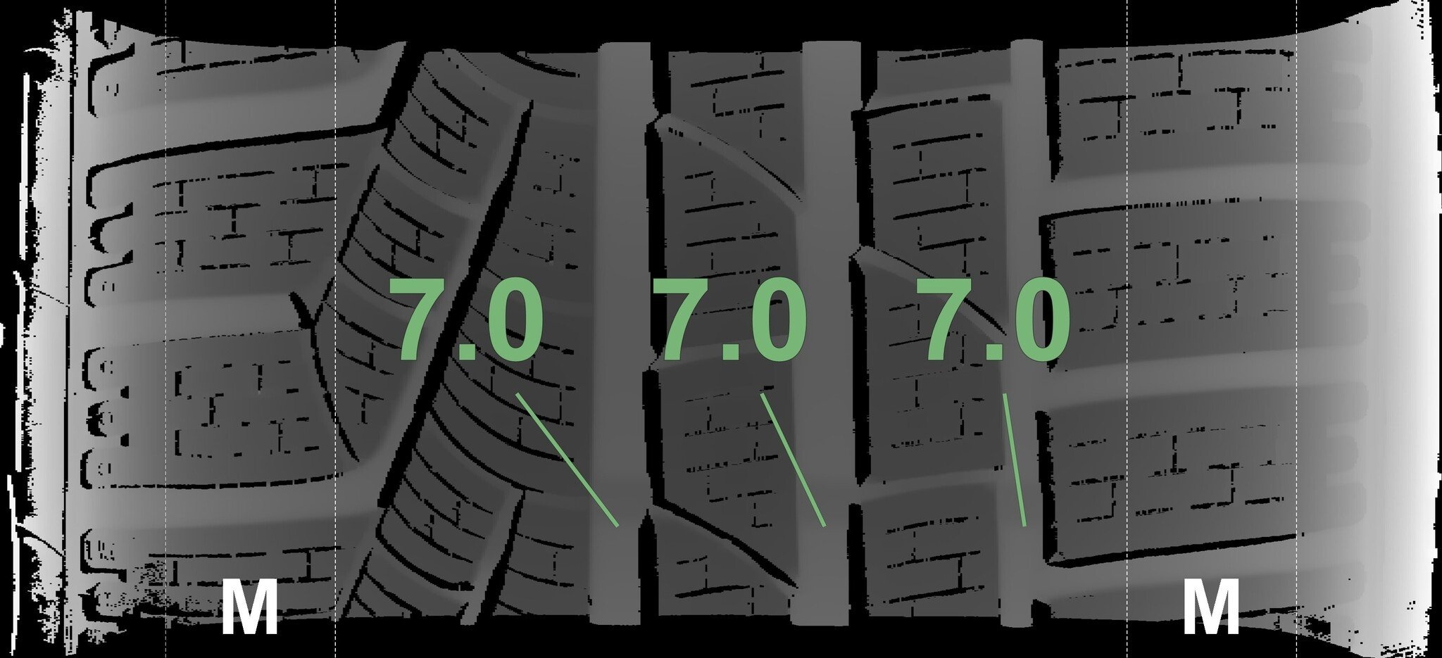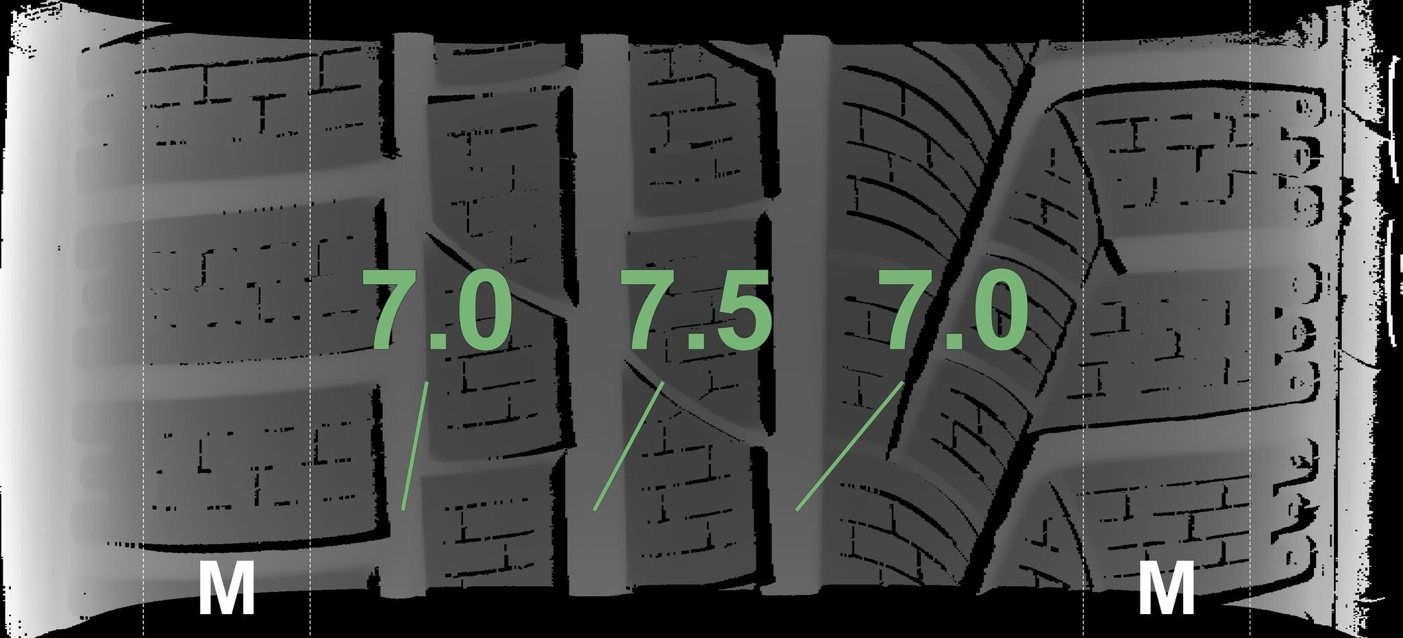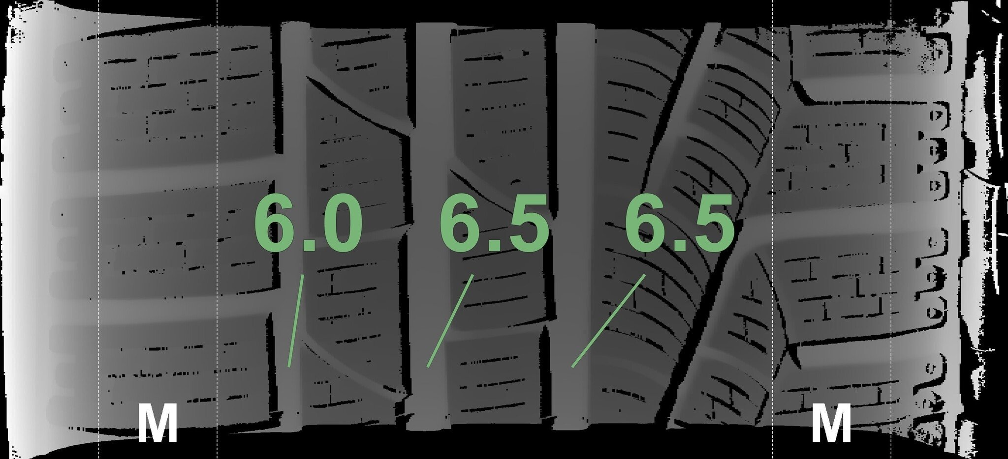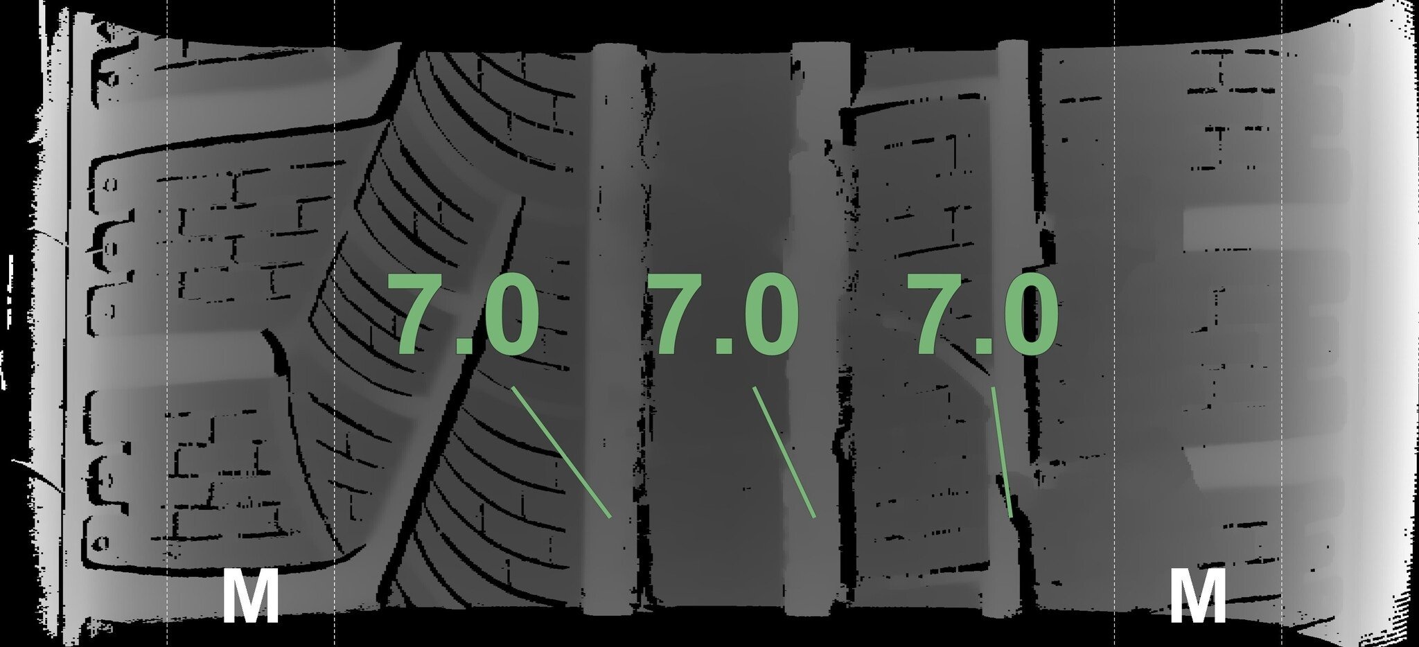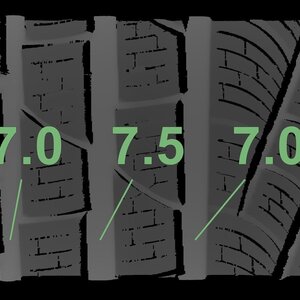 Die gemessenen Profiltiefen und die Details der Felgen sind oben dargestellt.