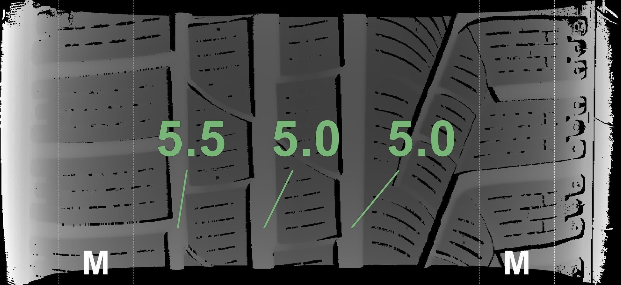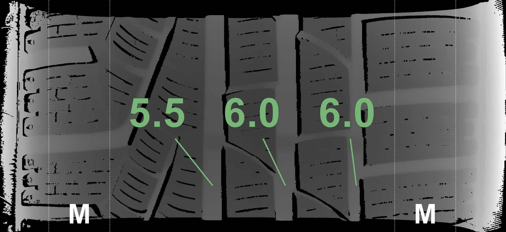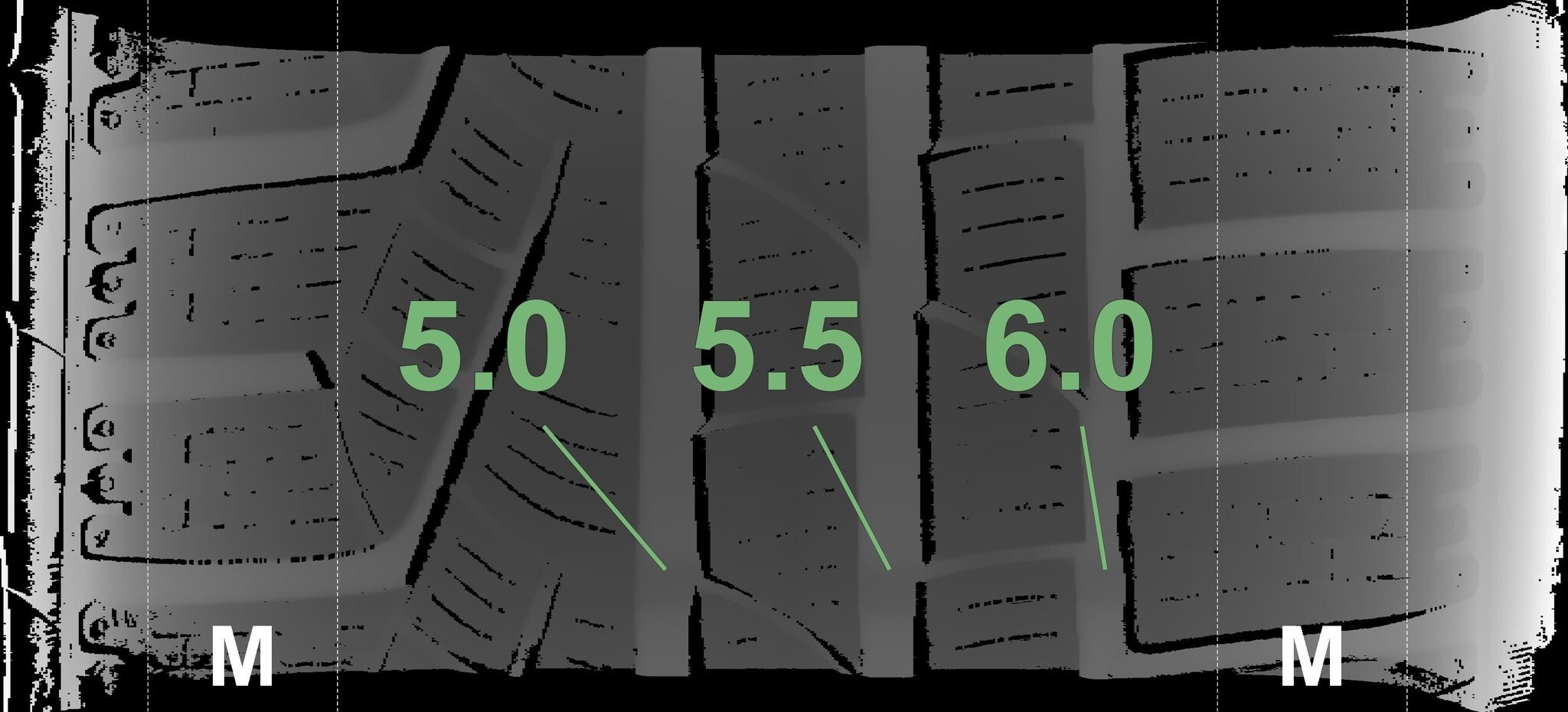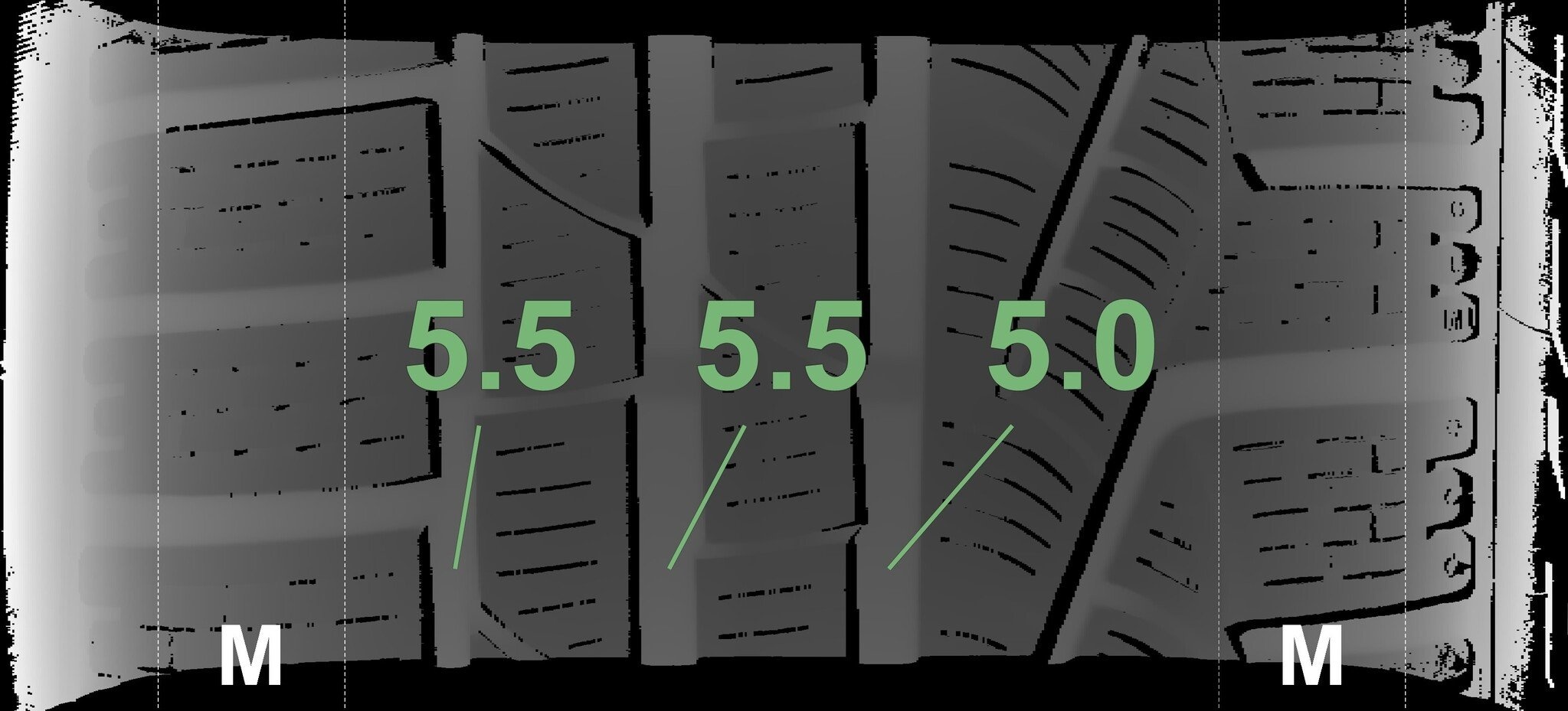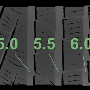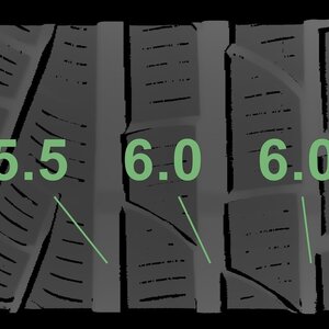 Die gemessenen Profiltiefen und die Details der Felgen sind oben dargestellt.
