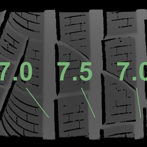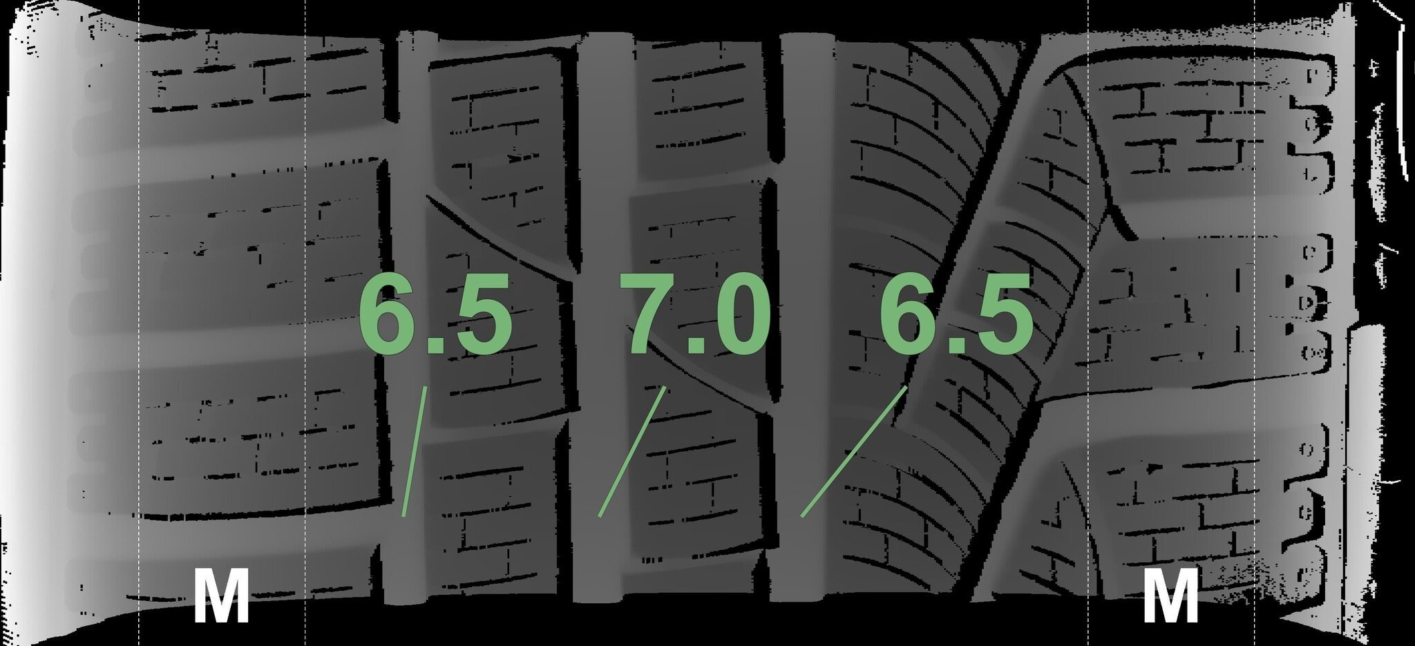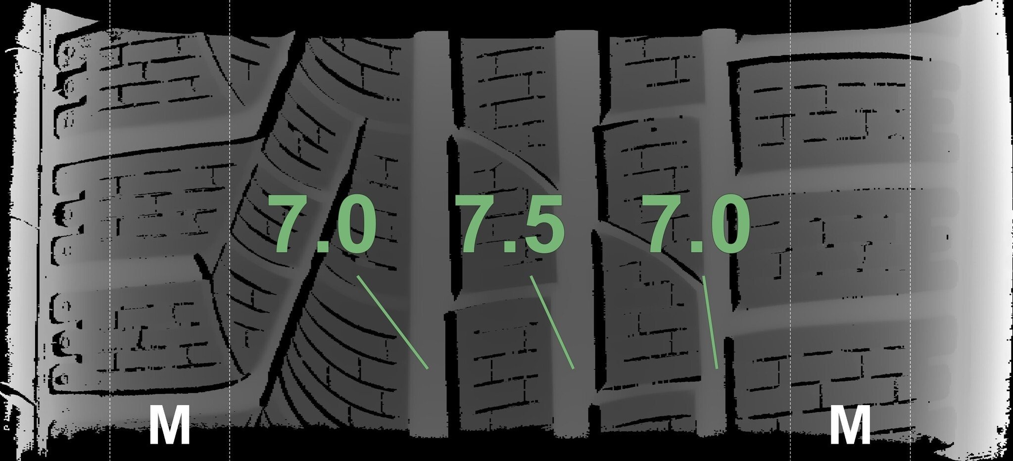 Die gemessenen Profiltiefen und die Details der Felgen sind oben dargestellt.