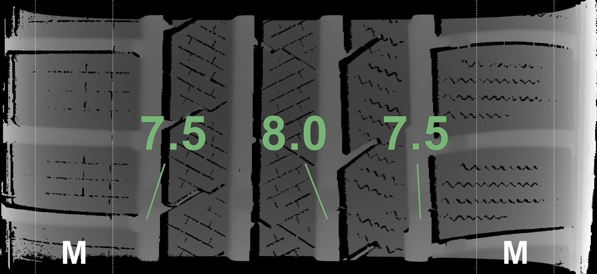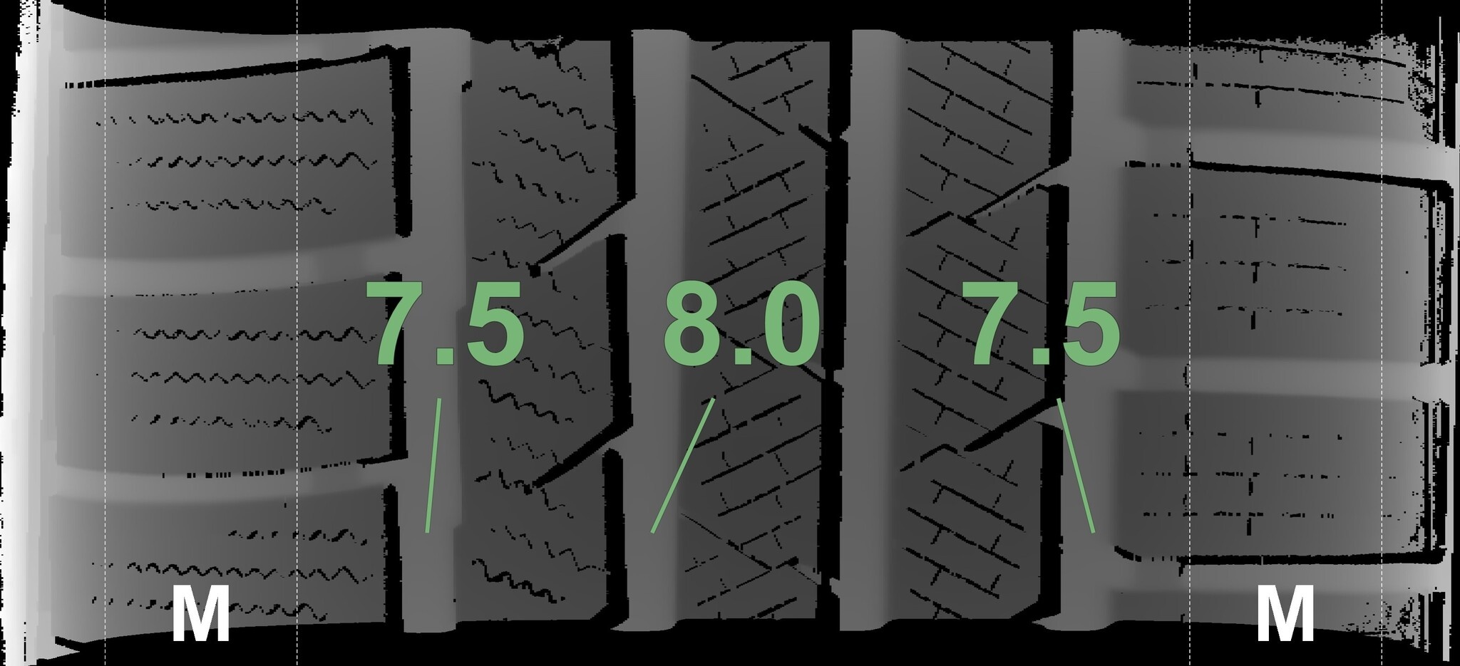 Die gemessenen Profiltiefen und die Details der Felgen sind oben dargestellt.
